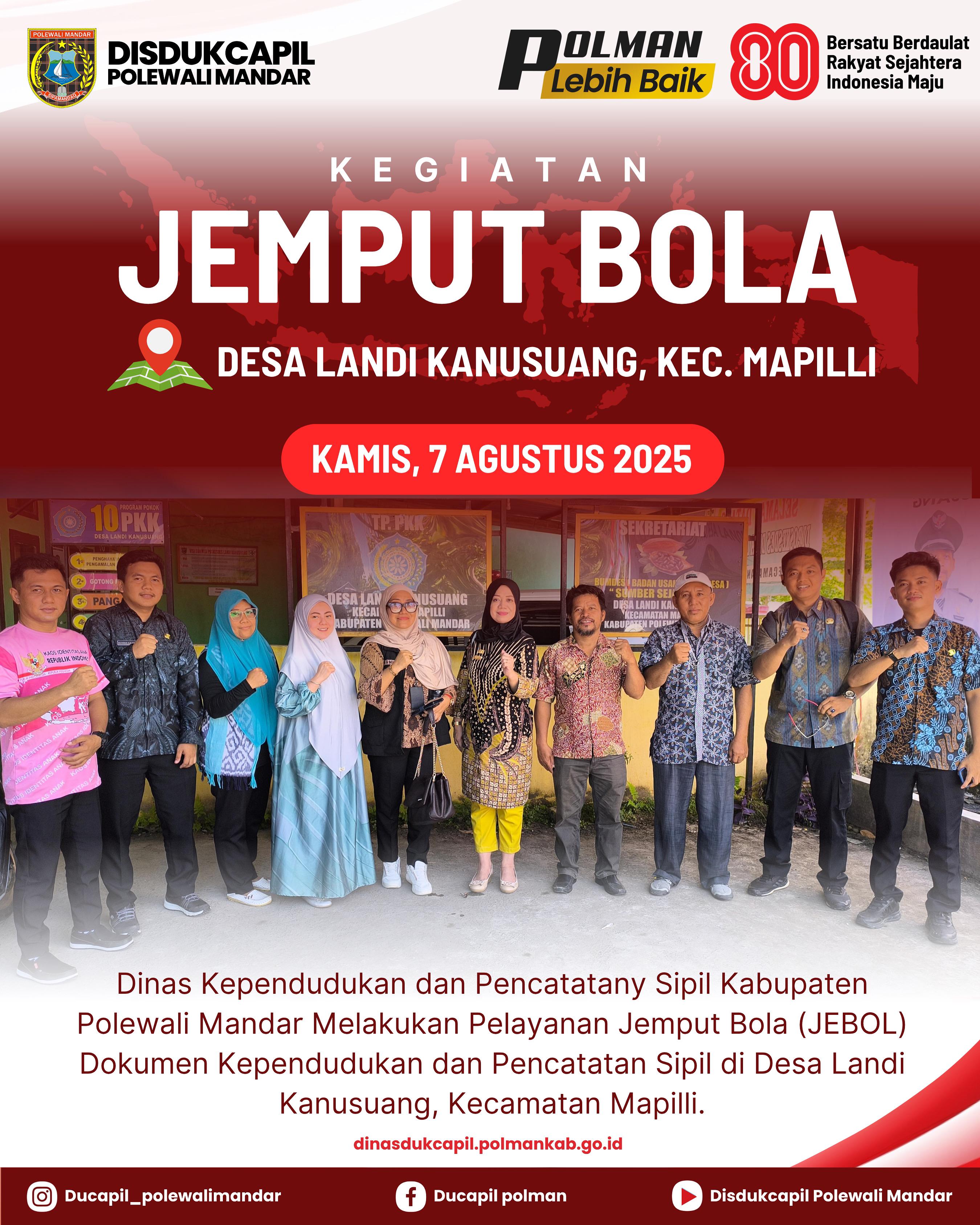 Polewali Mandar, Kamis 07 Agustus 2025 – Dinas Kependudukan dan Pencatatan Sipil (Disdukcapil) Kabupaten Polewali Mandar kembali menggelar layanan Jemput Bola administrasi kependudukan di Desa Landi Kanusuang, Kecamatan Mapilli. Kegiatan ini merupakan bagian dari upaya Disdukcapil untuk mendekatkan pelayanan kepada masyarakat, khususnya di wilayah yang jauh dari pusat layanan administrasi.Beragam layanan disediakan dalam kegiatan tersebut, mulai dari penerbitan Kartu Keluarga (KK), perekaman d...