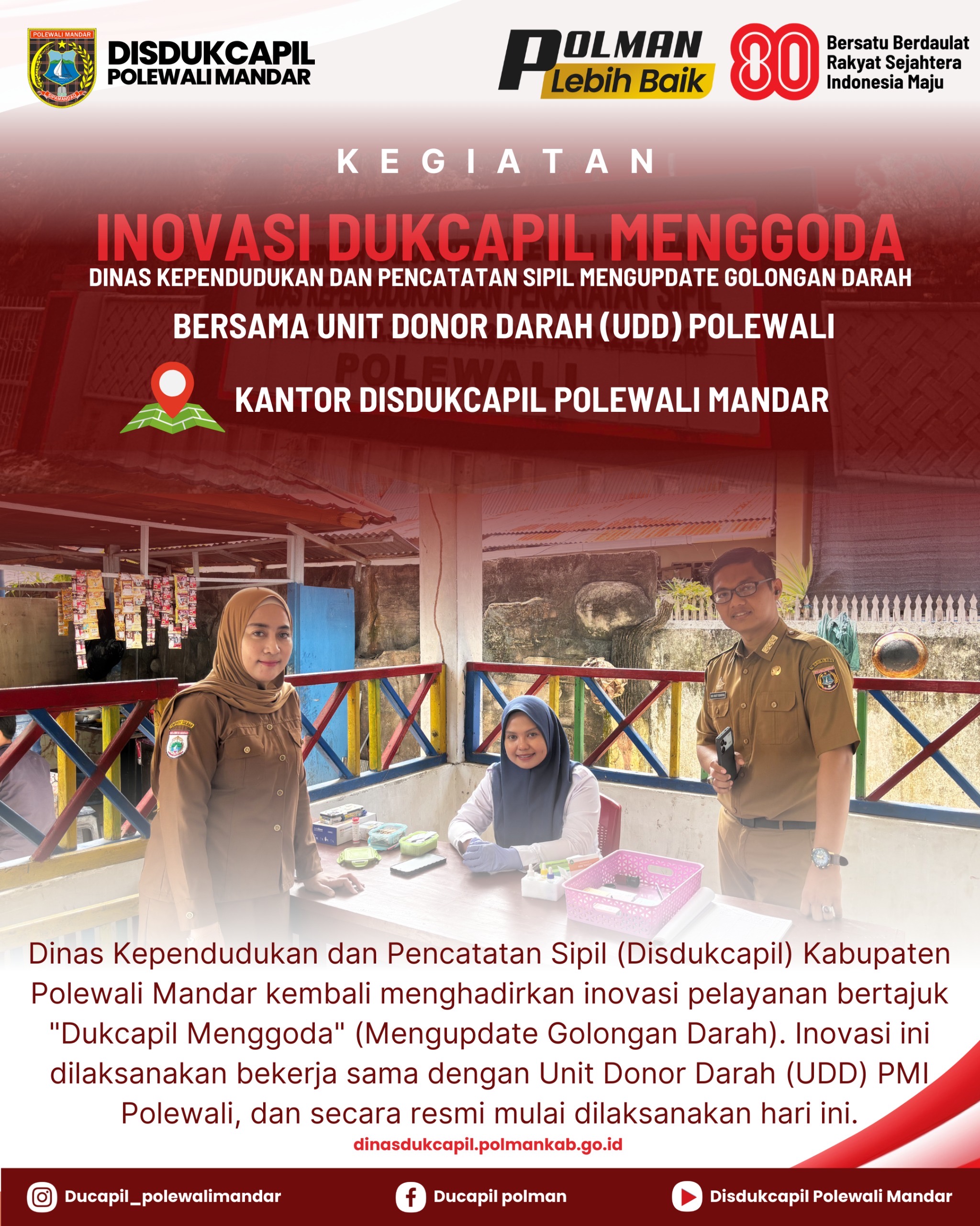 Polewali Mandar – Dinas Kependudukan dan Pencatatan Sipil (Disdukcapil) Kabupaten Polewali Mandar kembali menghadirkan inovasi pelayanan publik melalui program bertajuk “Dukcapil Menggoda” (Mengupdate Golongan Darah). Inovasi ini resmi diluncurkan pada Selasa, 19 Agustus 2025, bekerja sama dengan Unit Donor Darah (UDD) PMI Polewali.Melalui program ini, masyarakat yang melakukan donor darah tidak hanya berkontribusi bagi kemanusiaan, tetapi juga mendapat kemudahan dalam memperbarui informas...