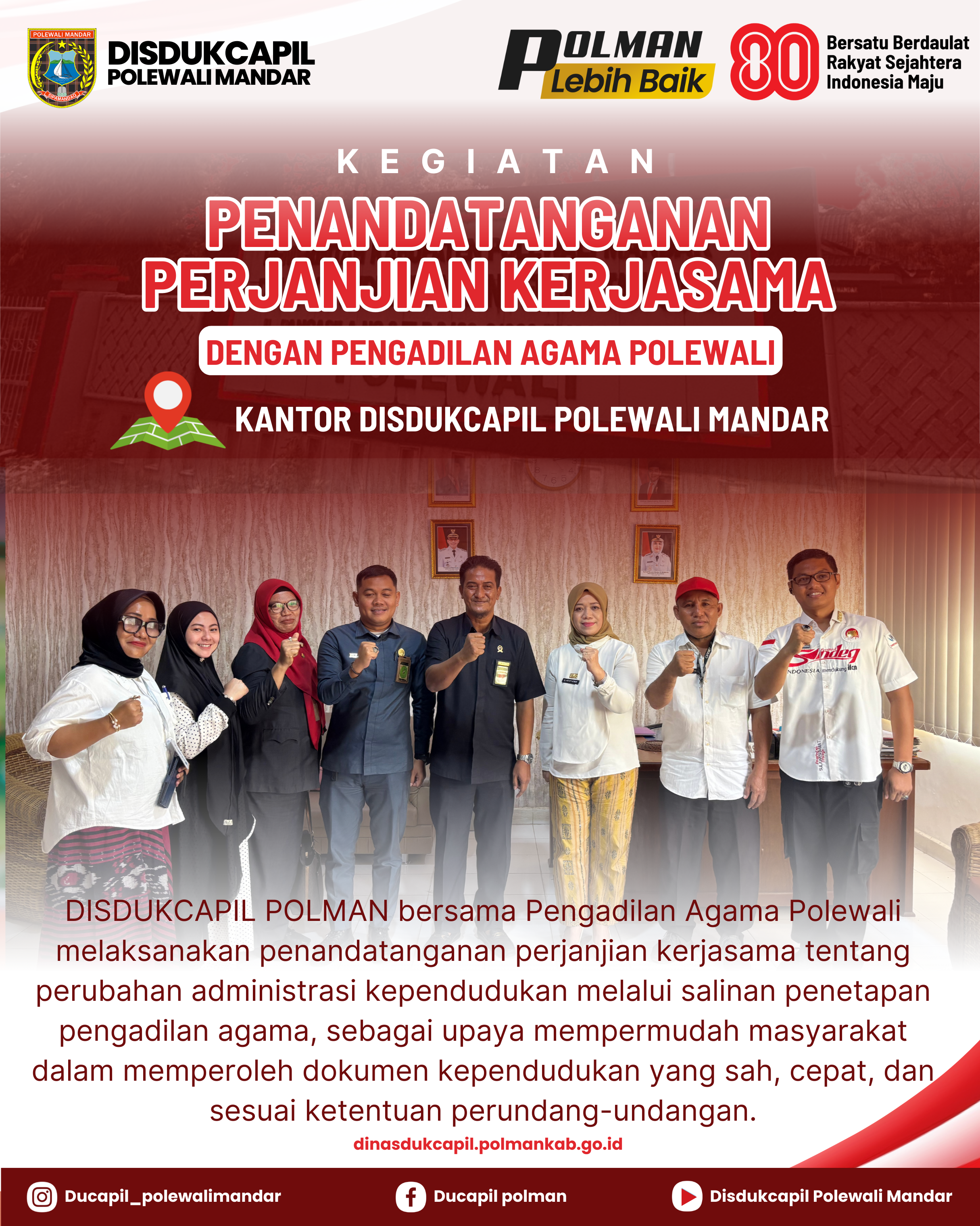 Polewali Mandar – Dinas Kependudukan dan Pencatatan Sipil (Disdukcapil) Kabupaten Polewali Mandar bersama Pengadilan Agama Polewali melaksanakan penandatanganan perjanjian kerjasama terkait perubahan administrasi kependudukan melalui salinan penetapan pengadilan agama, Rabu 20 Agustus 2025.Kerjasama ini bertujuan untuk mempermudah masyarakat dalam memperoleh dokumen kependudukan yang sah, cepat, dan sesuai dengan ketentuan perundang-undangan. Melalui sinergi ini, warga yang membutuhkan perubah...