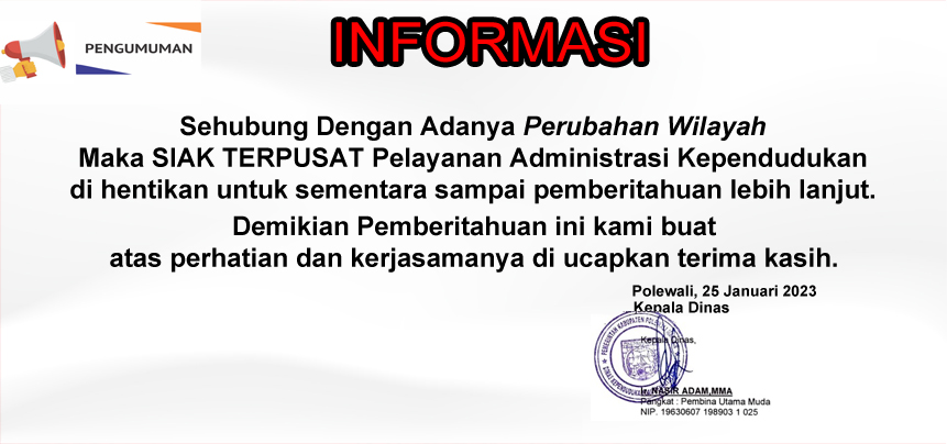 sehubung dengan adanya Perubahan Wilayah, tanggal 25 Januari 2023 SIAK TERPUSAT pelayanan administrasi kependudukan dihentikan untuk sementara sampai pemberitahuan lebih lanjut. Demikian pemberitahuan kami buat atas perhatian dan kerjasamanya diucapkan terima kasih....