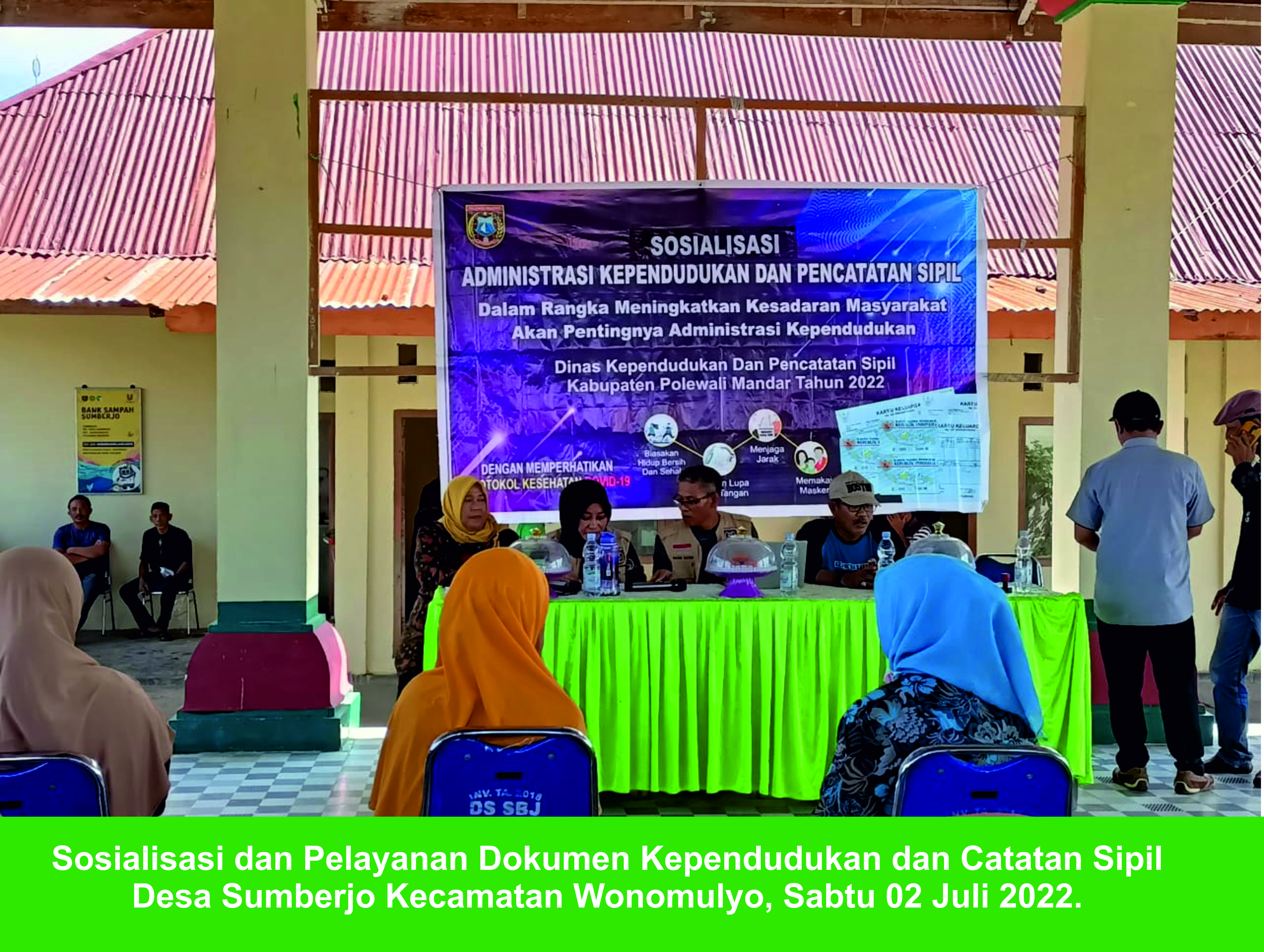 Sabtu 02 Juli 2022, Dinas DUKCAPIL Polewali Mandar Melakukan Jebol (Jemput Bola) Sosialisasi dan Pelayanan Administrasi Kependudukan dan Pencatatan Sipil di Desa Sumberjo Kecamatan Wonomulyo....