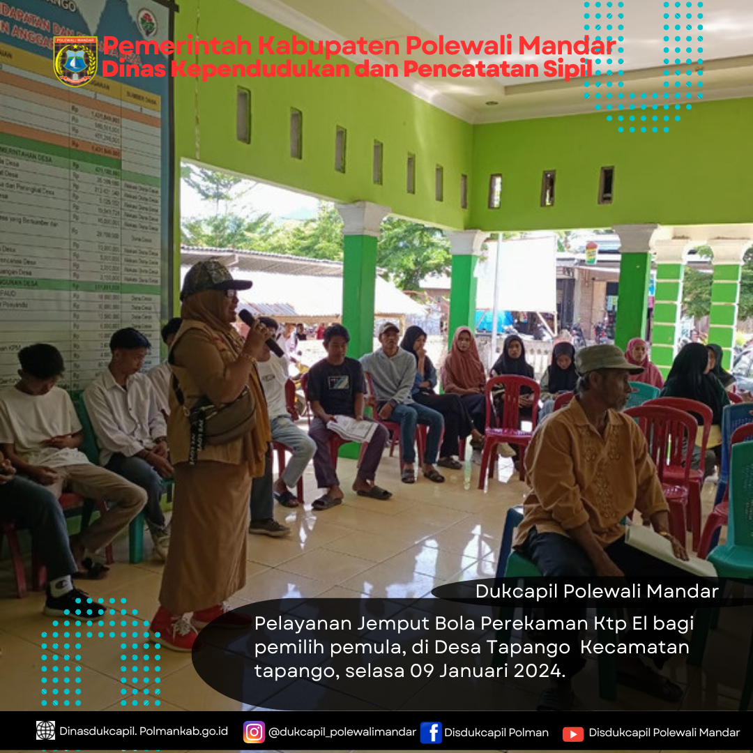 Polewali Mandar, 09 Januari 2024. Dinas Kependudukan dan Pencatatan Sipil Polewali Mandar melakukan layanan jemput bola perekaman Ktp El di Desa Tapango Kecamatan Tapango. Dinas Kependudukan dan Pencatatan Sipil (Disdukcapil) Kabupaten Polewali Mandar makin mengintensifkan pelayanan perekaman foto KTP-El khusus bagi pemilih pemula, yang didominasi kaum pelajar. ...