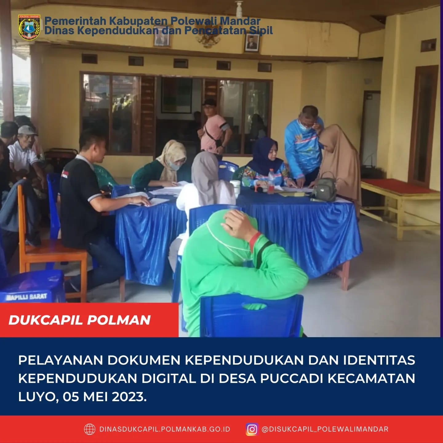 Polewali Mandar ( 05 Mei 2023), DinasKependudukan dan Pencatatan Sipil Kabupaten Polewali Mandar Melakukan PelayananJemput Bola Dokumen kependudukan dan Identitas Kependudukan Digital (IKD).Kegiatan ini dilaksanakan di Desa Puccadi Kecamatan Luyopada tanggal 05 Mei 2023. Masyarakat dapat langsung mengurus dokumenkependudukan Kartu Keluarga, KTP EL, Akta Kelahiran, Akta Kematian sertadokumen kependudukan lainnya.Selainpengurusan dokumen kependudukan, masyarakat juga dapat melakukan aktivasi...