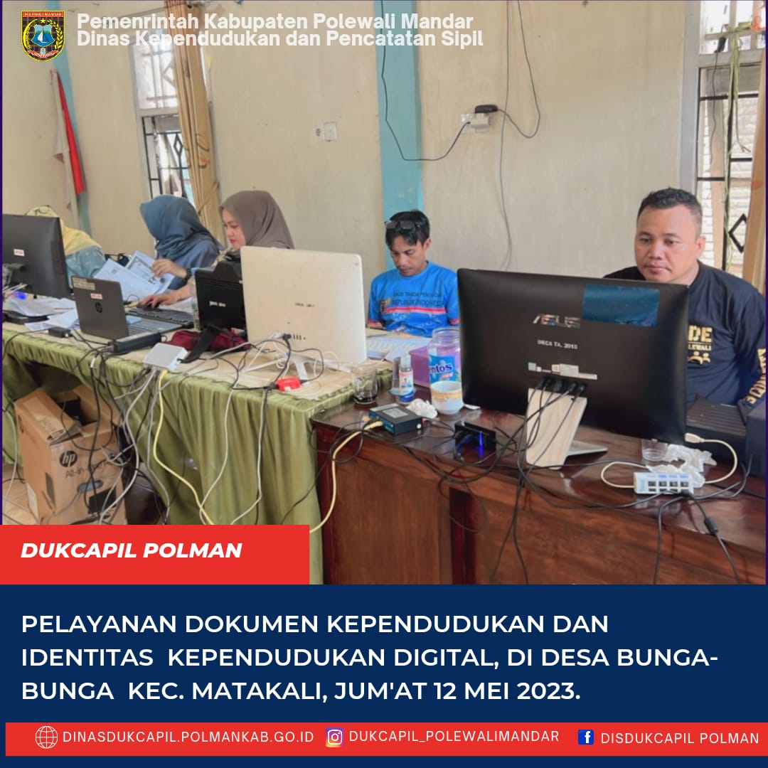 Polewali Mandar ( 12 Mei 2023), DinasKependudukan dan Pencatatan Sipil Kabupaten Polewali Mandar Melakukan PelayananJemput Bola Dokumen kependudukan dan Identitas Kependudukan Digital (IKD).Kegiatan ini dilaksanakan di Desa Bunga-Bunga Kecamatan Matakali pada tanggal 12 Mei 2023. Masyarakat dapat langsung mengurus dokumenkependudukan Kartu Keluarga, KTP EL, Akta Kelahiran, Akta Kematian sertadokumen kependudukan lainnya.Selainpengurusan dokumen kependudukan, masyarakat juga dapat melakukan...