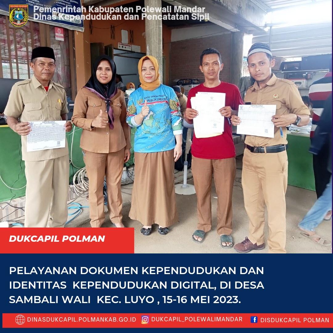 Polewali Mandar (15-16 Mei 2023), Dinas Dukcapil Polewali Mandar melakukan jemput bola pelayanan administrasi kependudukan dan aktivasi Identitas Kependudukan Digital (IKD). Kegiatan ini dilakukan selama 2 (dua) hari di desa Sambaliwali Kecamatan Luyo tanggal 15-16 mei 2023. Masyarakat dapat mengurus langsung dokumen kependudukan tanpa harus ke kantor dukcapil. Dokumen kependudukan yang sudah jadi diserahkan langsung oleh Hj. Astuty, S. sos. M. Si sekertaris Dinas Kependudukan dan Pencatata...