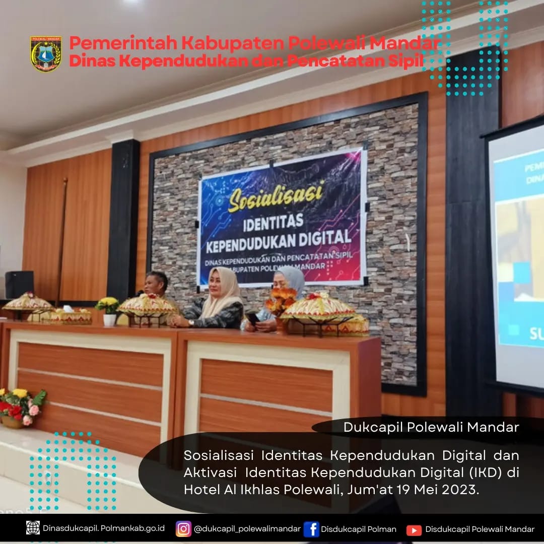 Polewali Mandar (19 Mei 2023), Dinas Kependudukan Dan Pencatatatn Sipil melakukan Kegiatan Sosialisasi Identitas Kependudukan Digital (IKD).Kegiatan Ini dilaksanakan di hotel Al Ikhlas Polewali Mandar pada hari Jum'at 19 Mei 2023, dan sekaligus melakukan Aktivasi Identitas Kependudukan Digital (IKD). Sosialisasi ini di hadiri Oleh Kepala Dinas Dukcapil polewali mandar Ir. Nasir Adam, MMA beserta jajarannya....