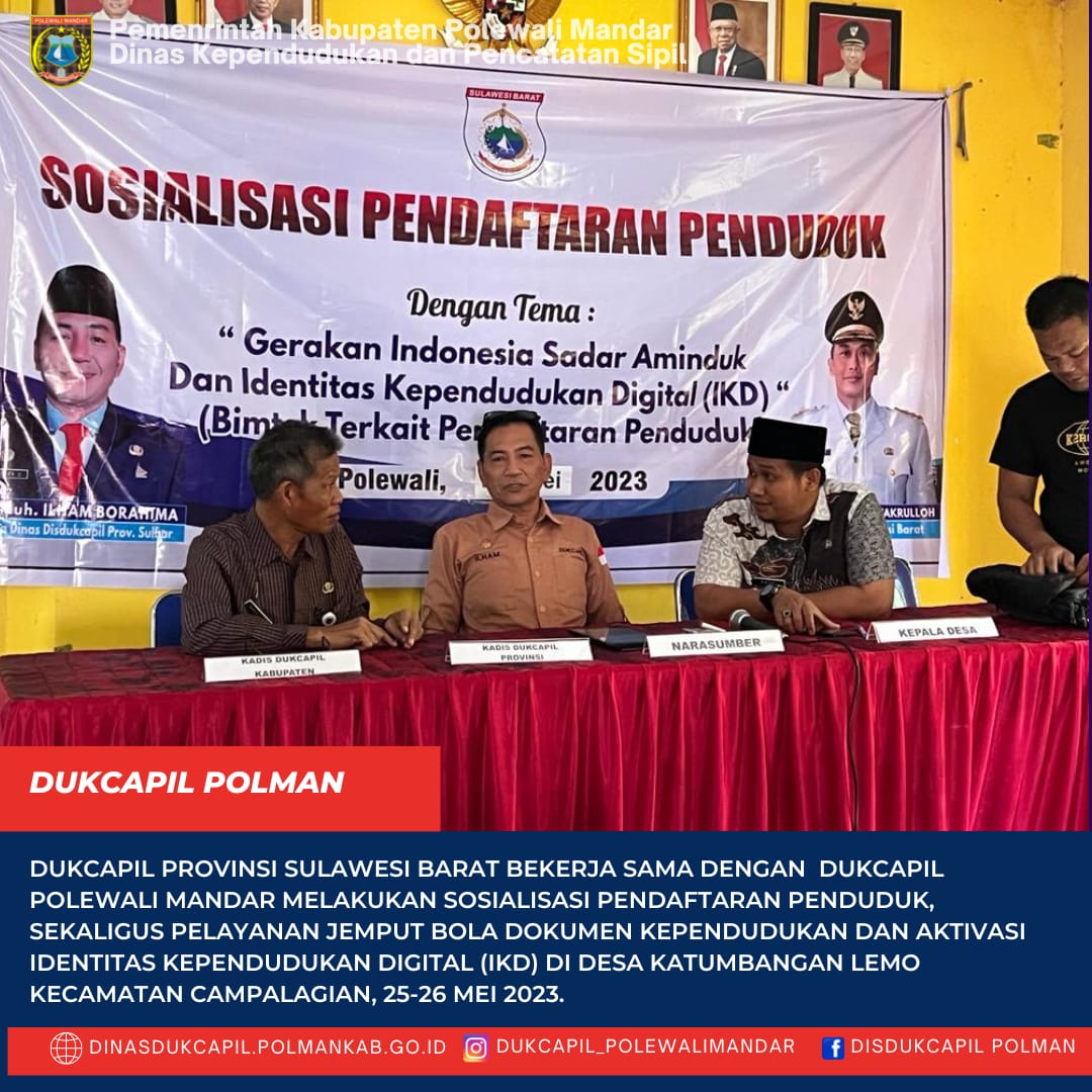 Polewali Mandar (24-25 Mei 2023), Dinas Kependudukan dan Pencatatan Sipil Provinsi Sulawesi Barat bekerja sama dengan Dukcapil polewali Mandar melakukan Sosialisasi Pendaftaran Penduduk sekaligus melakukan pelayanan dokumen kependudukan dan aktivasi Identitas Kependudukan Digital (IKD).Kegiatan ini dilaksanakan di Desa Katumbangan Lemo Kecamatan Campalagian tanggal 25-26 Mei 2023. Dalam kegiatan sosialisasi di hadiri langsung oleh Muh. Ilham Borahima Kepala Dinas Dukcapil Provinsi Sulawesi Barat...
