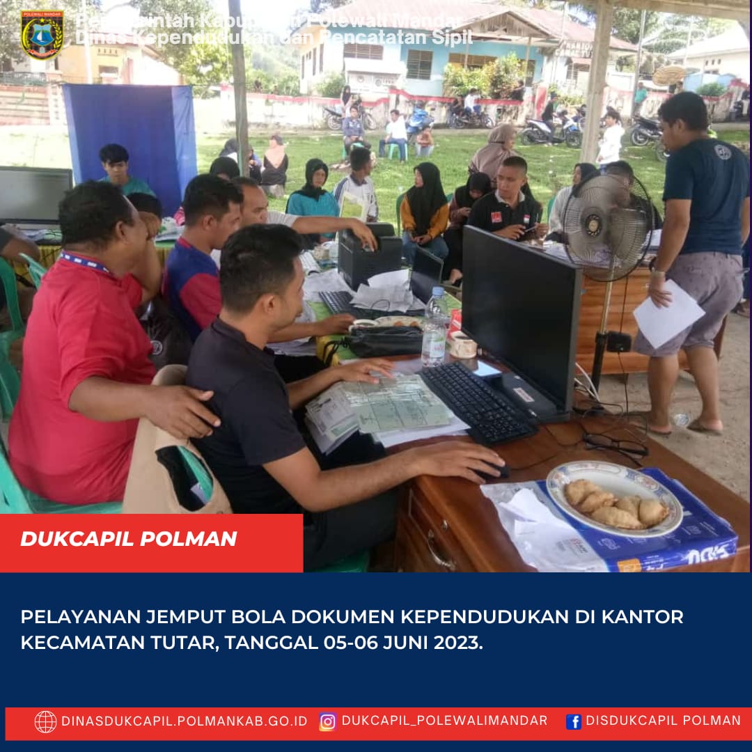 Polewali Mandar (05-06 Juni 2023), Dinas Kependudukan Dan Pencatatan Sipil Kabupaten polewali Mandar melakukan Pelayanan Jemput Bola Dokumen Kependudukan di Kantor Kecamatan Tutar mulai tanggal 05 s/d 06 Juni 2023.Kegiatan Pelayanan di laksanakan di Kantor Kecamatan Tutar melayani 5 (Lima) desa/keluaraha, yakni Taramanu, Taramanu Tua, Poda-Poda, Arabua, dan Ambo Padang. Pelayanan di lakukan selamat 2 hari mulai tanggal 05 s/d 06 Juni 2023.Dengan adanya pelayanan jumput bola, masyarakat dapat men...