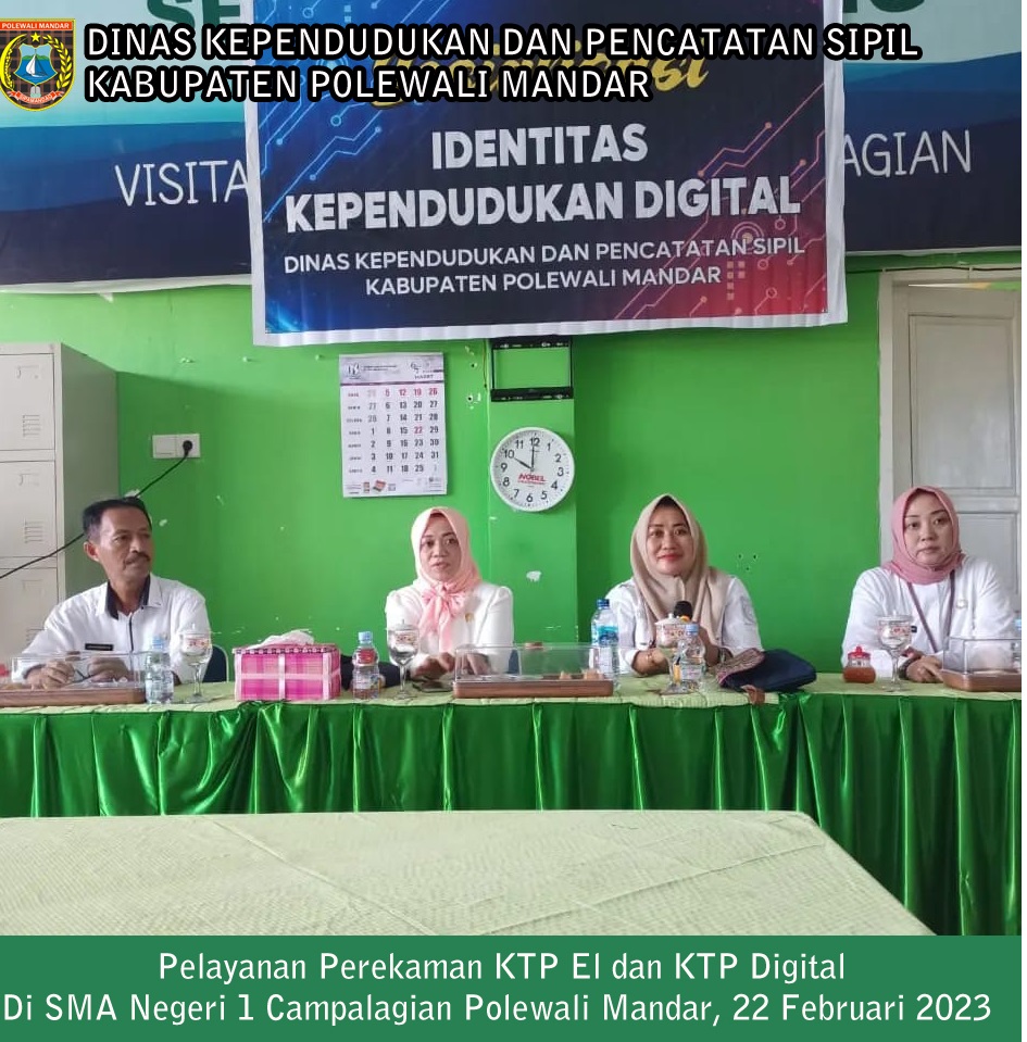 Rabu 22 Februari 2023, Dinas Kependudukan dan Pencatatan Sipil Kabupaten Polewali Mandar melakukan Sosialisasi Identitas Kependudukan Digital dan Pelayanan Perekaman KTP El, Pelayanan Jemput Bola dilakukan SMA Negeri 1 Campalagian.Identitas Kependudukan Digital bertujuan sebagai pengganti KTP elektronik dalam bentuk fisik serta mempermudah dan mempercepat transaksi pelayanan dalam bentuk digital.Perekaman e-KTP ini dilakukan oleh siswa-siswi SMA Negeri 1 Campalagian yang akan berusia 17 t...