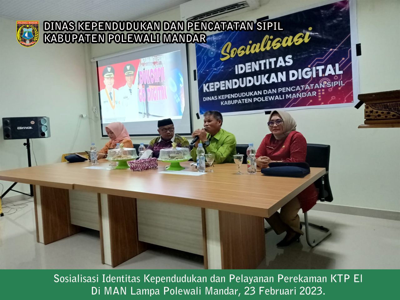 Kamis 23 Februari 2023, Dinas Kependudukan dan Pencatatan Sipil Kabupaten Polewali Mandar melakukan Sosialisasi Identitas Kependudukan Digital dan Pelayanan Perekaman KTP El, Pelayanan Jemput Bola dilakukan Disekolah MAN Lampa Polewali Mandar.Identitas Kependudukan Digital bertujuan sebagai pengganti KTP elektronik dalam bentuk fisik serta mempermudah dan mempercepat transaksi pelayanan dalam bentuk digital.Perekaman e-KTP ini dilakukan oleh siswa-siswi SMA Negeri 1 Ca...