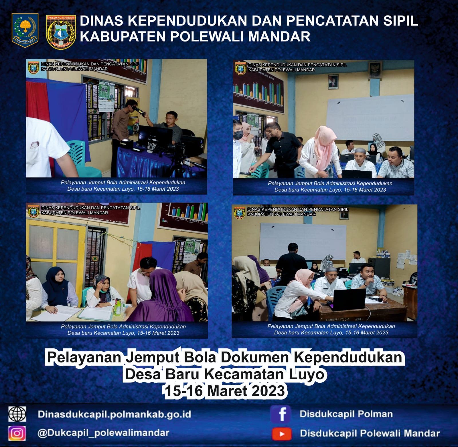 Polewali Mandar (13-14 Maret 2023), Dinas Kependudukan dan Pencatatan Sipil Kabupaten Polewali Mandar Melakukan Pelayanan Jemput Bola Administrasi Kependudukan. Kegiatan ini di lakukan di dua desa di kecamatan campalagian, yakni desa Panyampa dan Padang Timur. Pelayanan di laksanakan pada tanggal 13 sampai 14 maret 2023 di dua desa yang berbeda. Masyaraktat dapat langsung mangurus dokumen kependudukan Kartu keluarga, Ktp El, Akta Kelahiran, Akta kematian serta dokumen lainnya. Dokumen ...