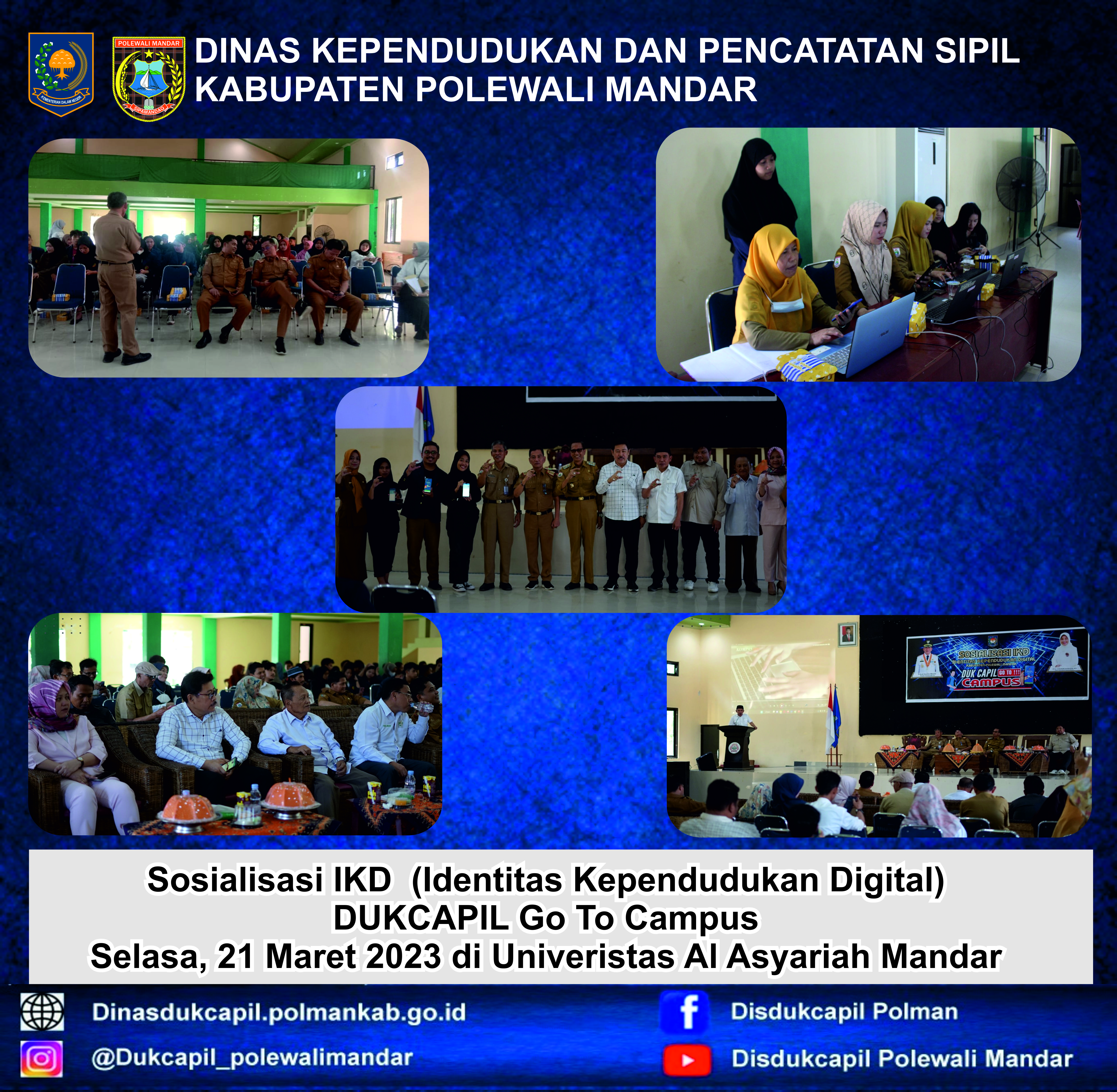Polewali Mandar (21 Maret 2023), Dinas Kependudukan dan Pencatatan Sipil Kabupaten Polewali Mandar bersama Dinas Kependudukan dan Pencatatan Sipil Provinsi Sulawesi Barat melaksakan Sosialisasi Identitas Kependudukan Digital (IKD) bagi mahasiswa Universitas Al Asyariah Mandar Polewali Mandar, selasa 21 Maret 2023.Kegiatan ini dibuka secara resmi oleh wakil Bupati Polewali Mandar H. M. Natsir Rahmat yang di hadiri Covitas Akademika Unasman dan unit kerja terkait.Identitas Kependudukan Digital yak...