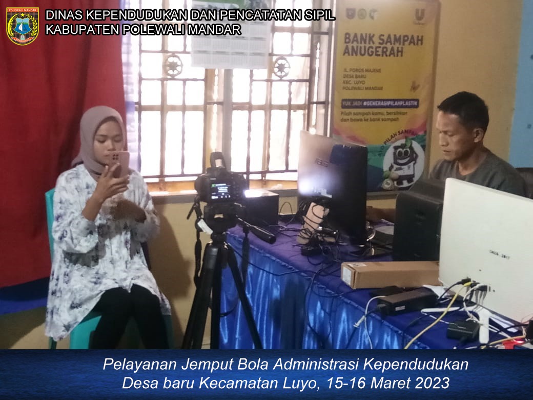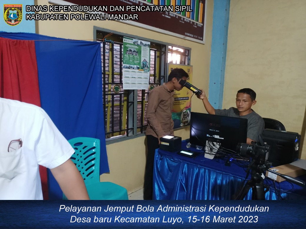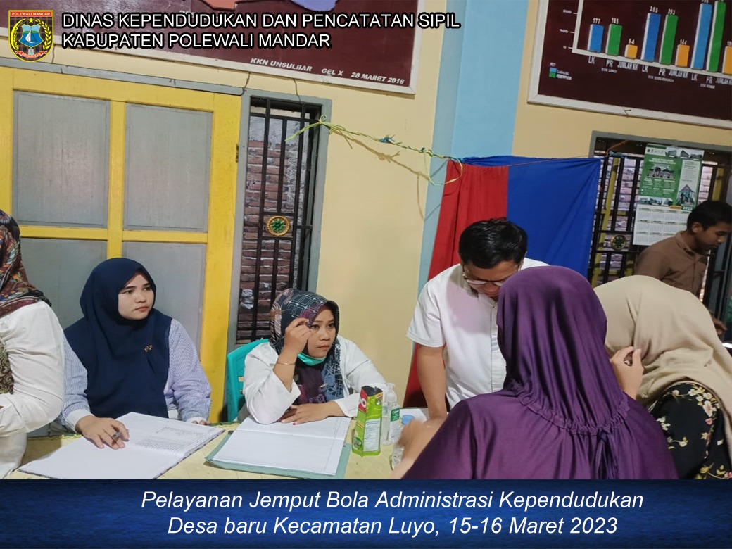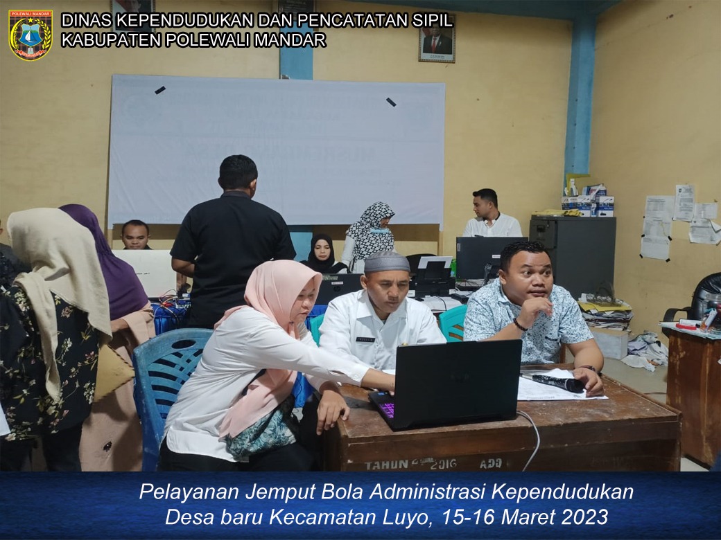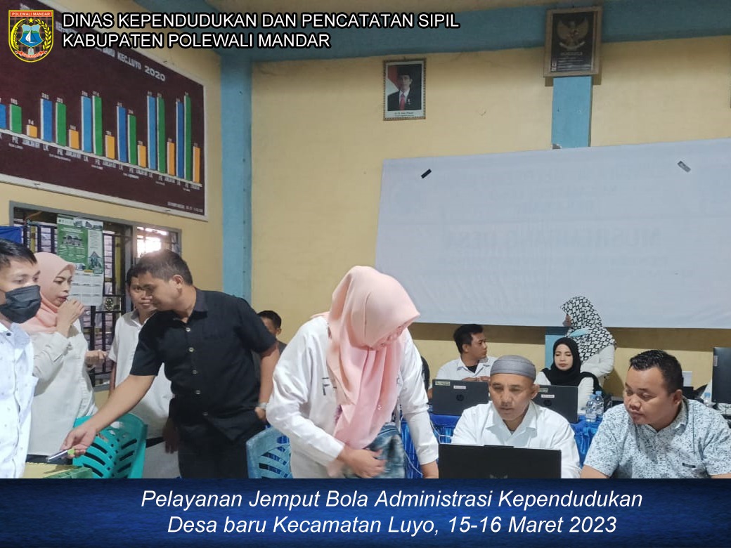 Kegiatan Pelayanan di laksanakan selama dua hari tanggal 15-16 Maret 2023 di Desa Baru Kecamatan Luyo. Masyaraktat dapat langsung mangurus dokumen kependudukan Kartu keluarga, Ktp El, Akta Kelahiran, Akta kematian serta dokumen lainnya. Dokumen Kependudukan diserahkan langsung oleh Kepala Dinas Dukcapil Polewali Mandar Ir. NASIR ADAM, MMA