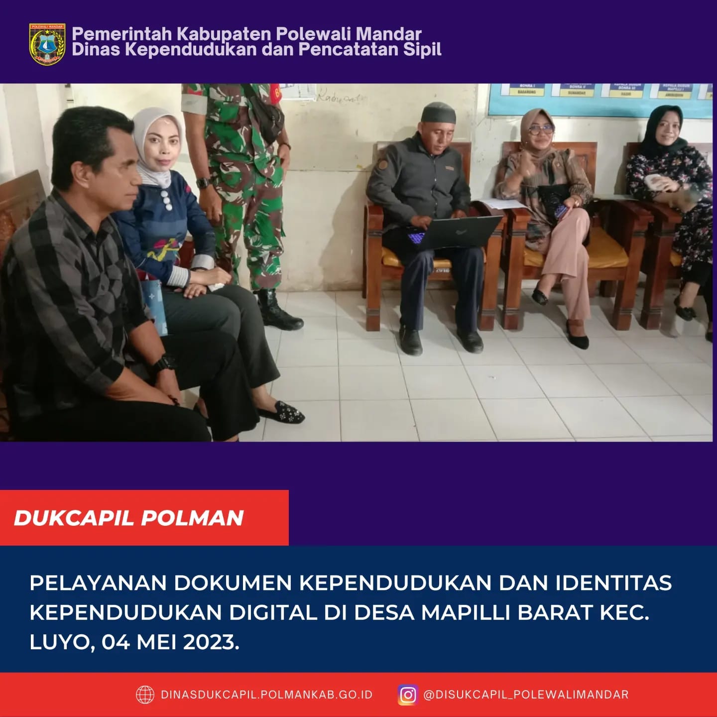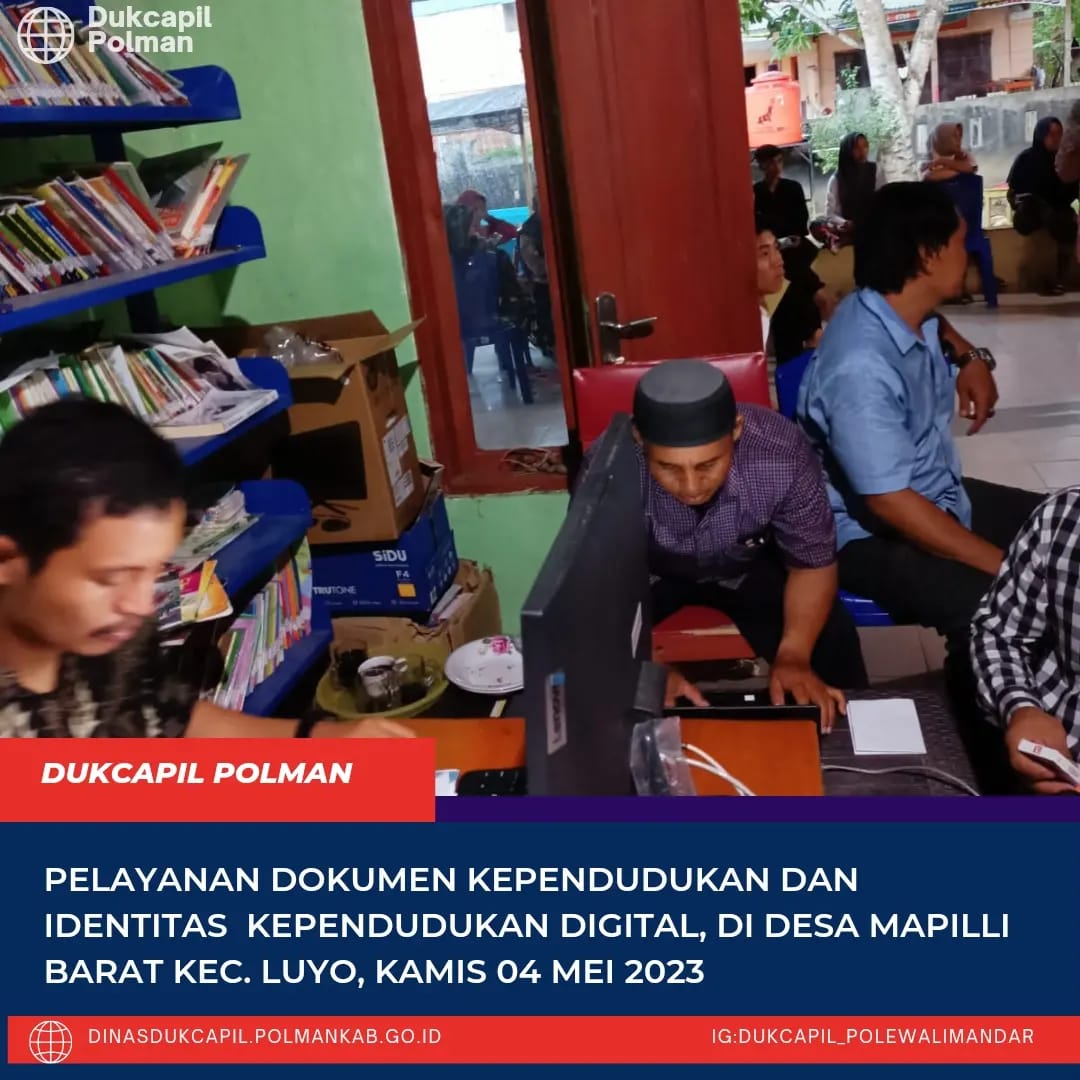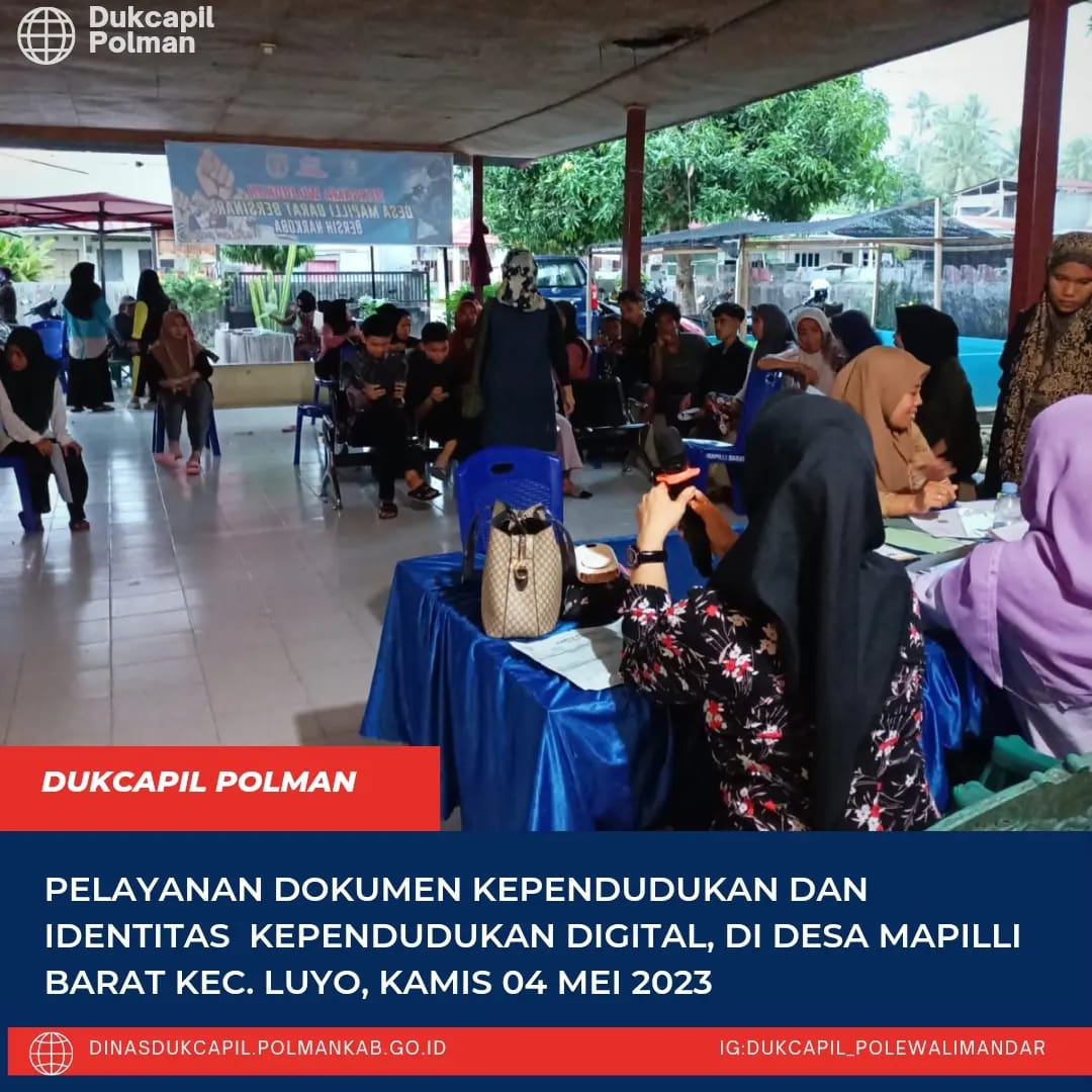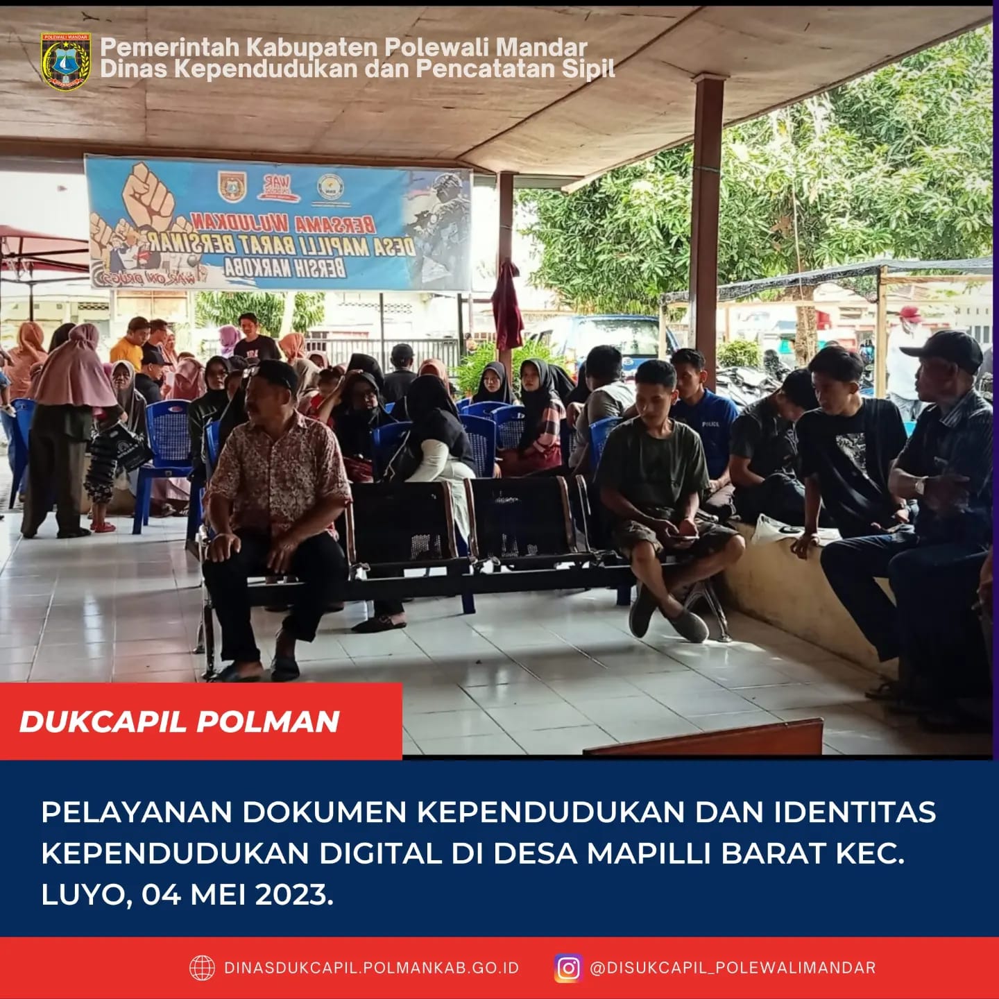 Kegiatan ini dilaksanakan di Desa Mapilli Barat Kecamatan Luyo pada tanggal 04 Mei 2023. Masyarakat dapat langsung mengurus dokumen kependudukan Kartu Keluarga, KTP EL, Akta Kelahiran, Akta Kematian serta dokumen kependudukan lainnya.