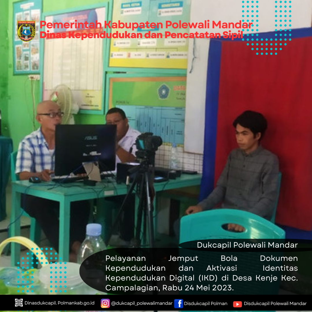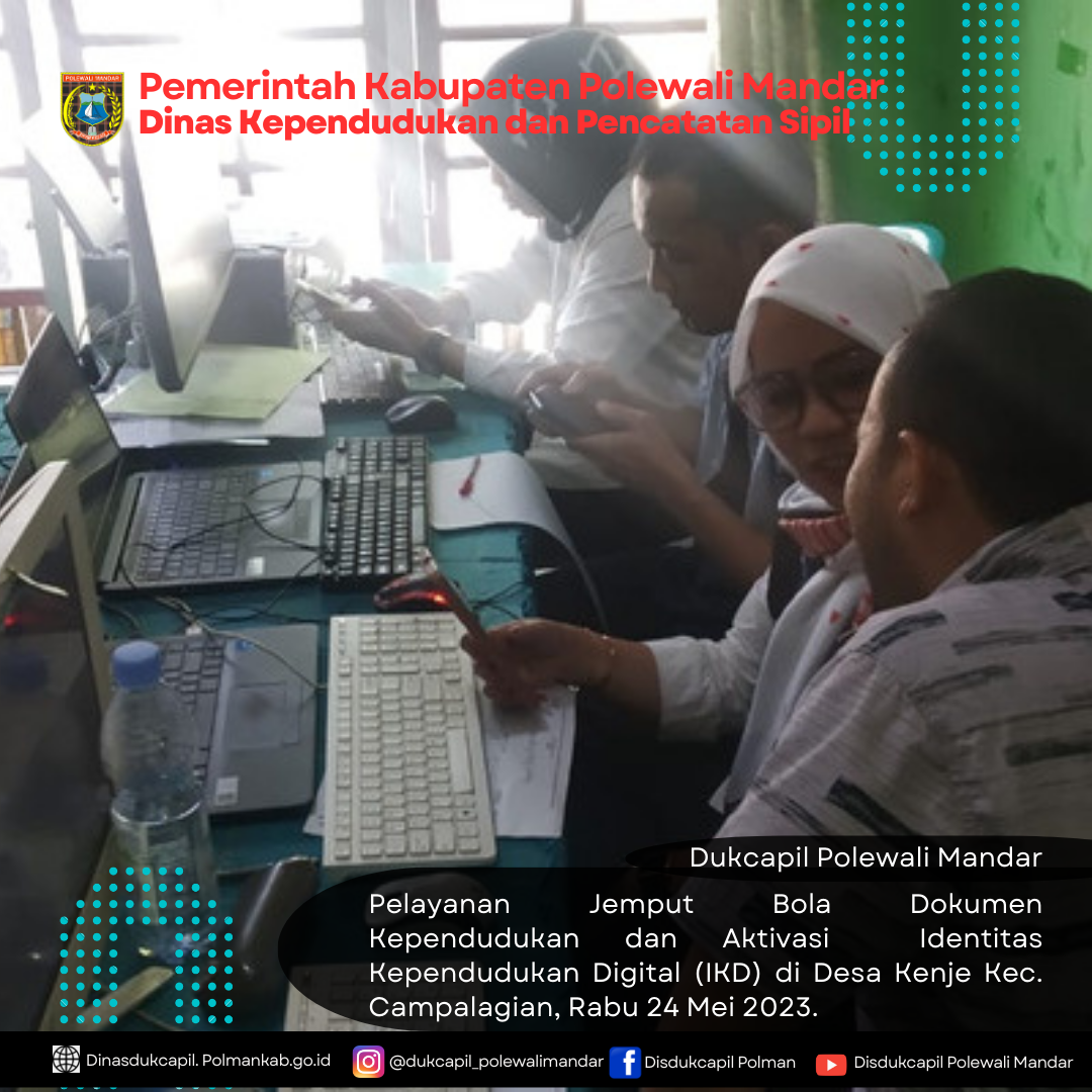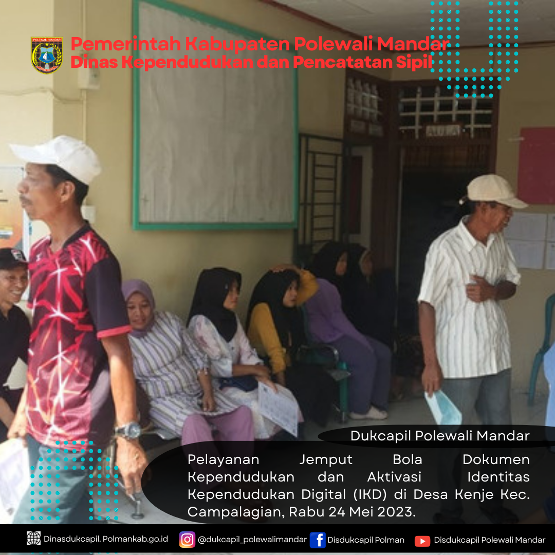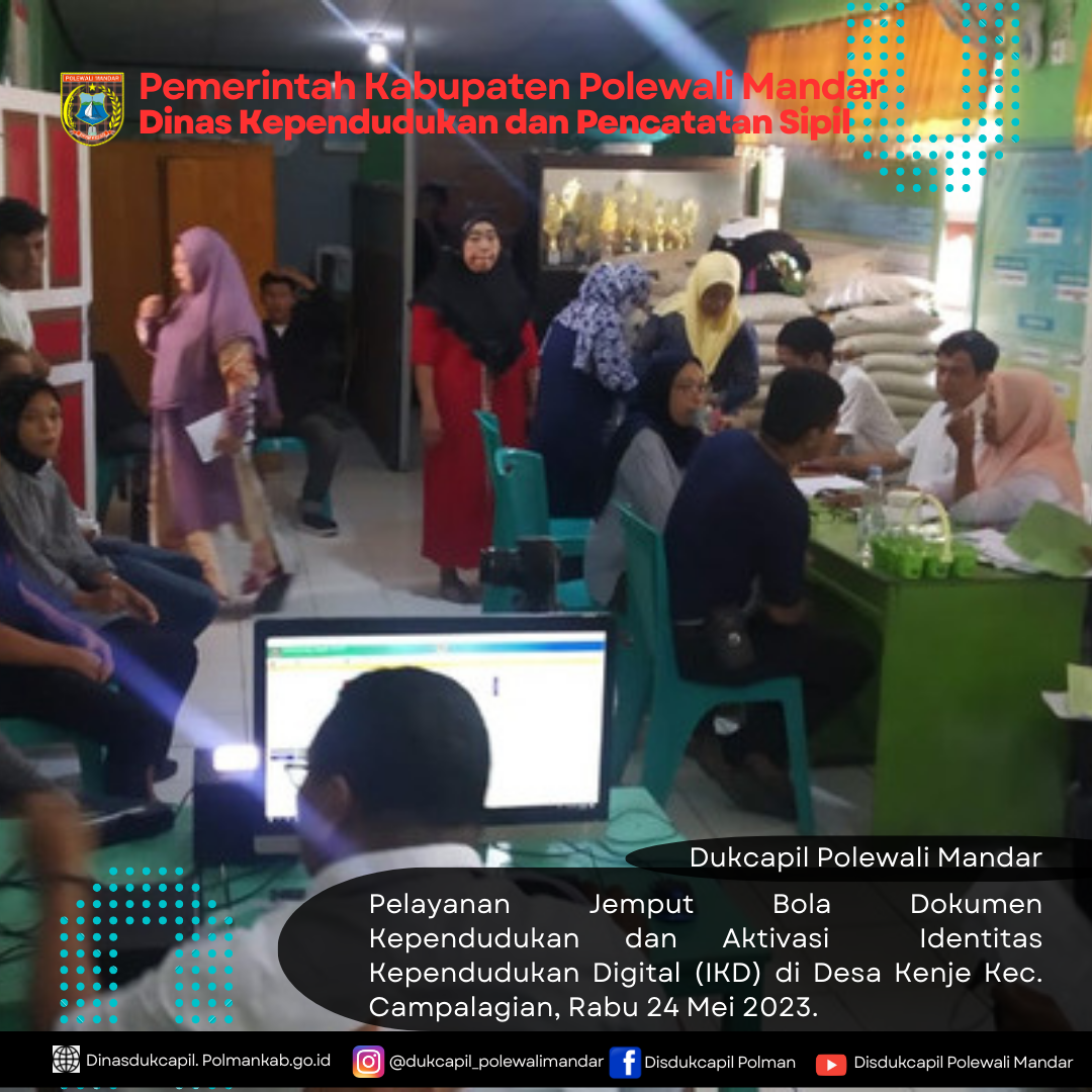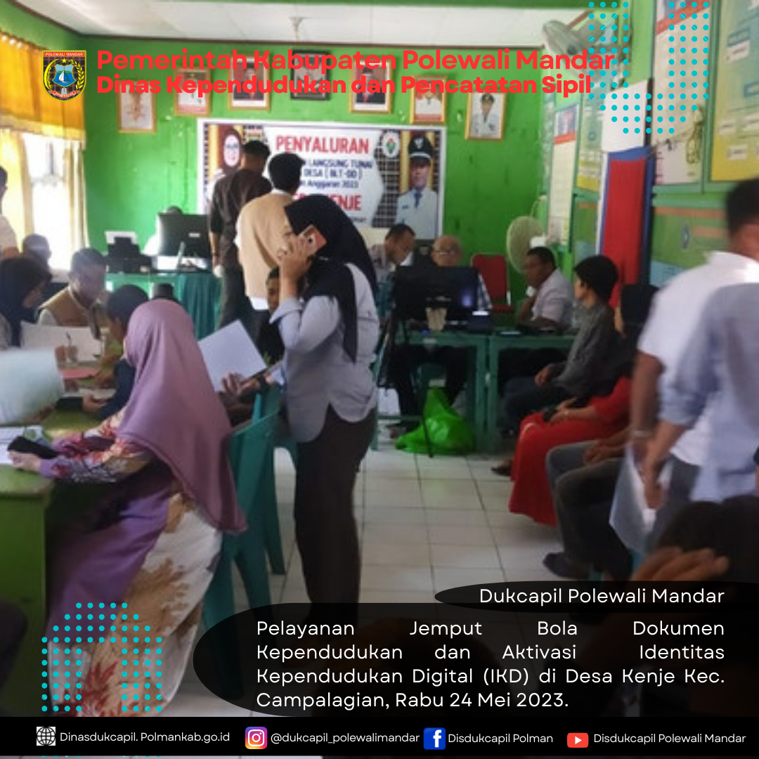 Kegitan ini dilakukan di Desa Kenje Kecamatan Campalagian Rabu 24 Mei 2023. Masyarakat dapat mengurus langsung dokumen kependudukan tanpa harus datang ke kantor dukcapil. Masyarakat juga dapat melakukan aktivasi identitas kependudukan digital melalui android.