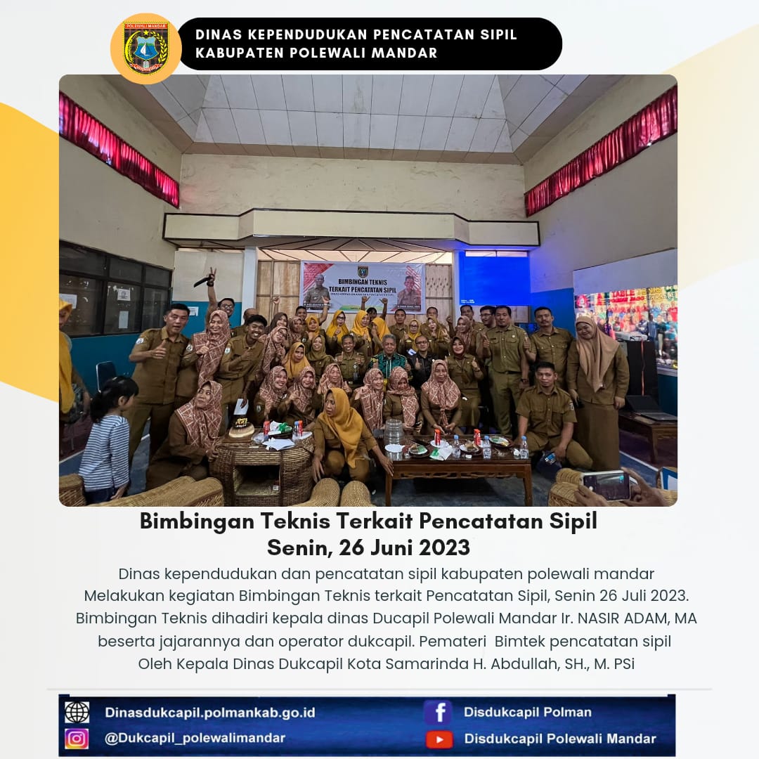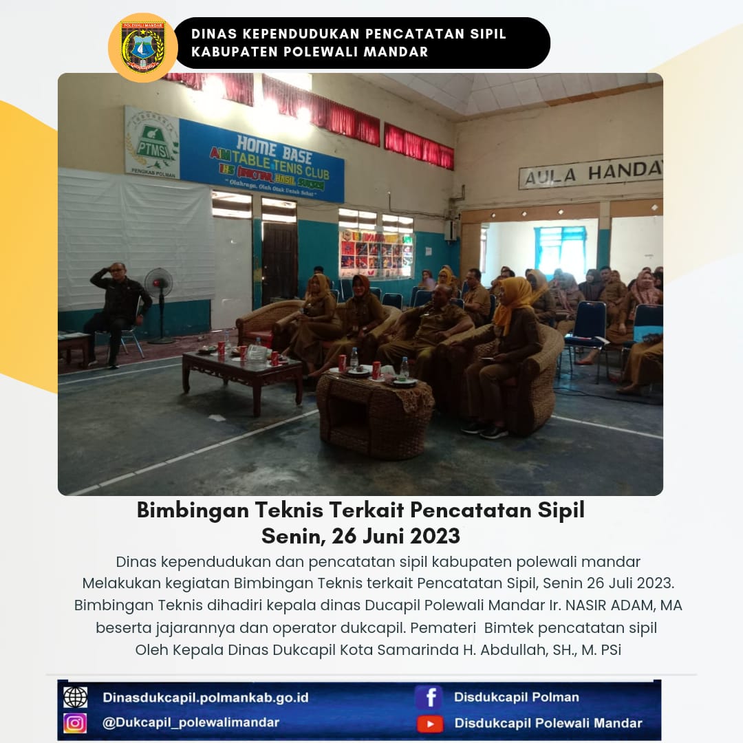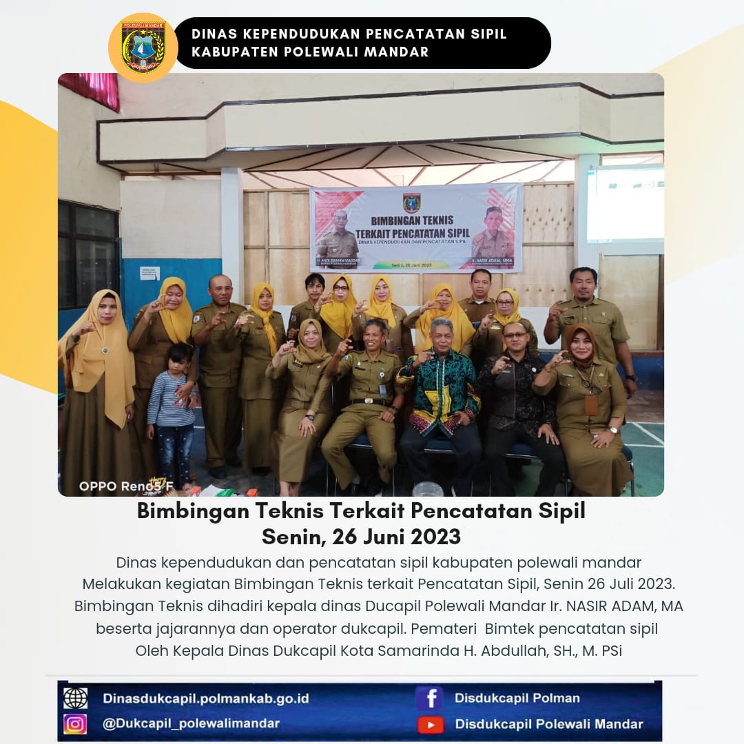 (Polewali Mandar , 26 Juni 2023), Dinas Kependudukan dan Pencatatan Sipil Kabupaten Polewali Mandar Bidang Pencatatan Sipil melakukan kegiatan Bimbingan Teknis Terkait Pencatatan Sipil. Kegiatan ini hadiri Oleh Kepala Dinas Dukcapil Polewali Mandar Ir. NASIR ADAM, MMA serta jajarannya dan Operator Dukcapil polewali mandar.