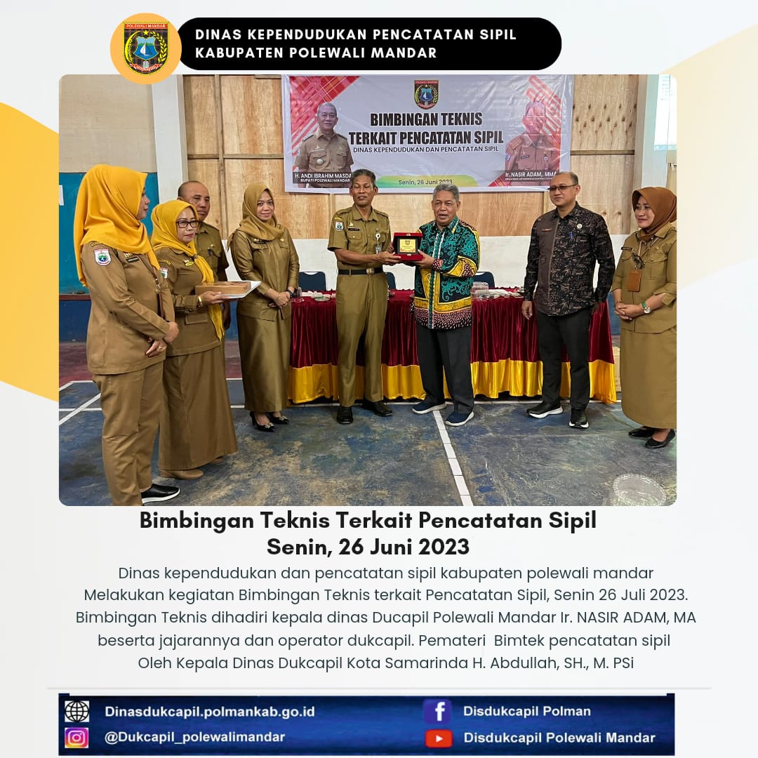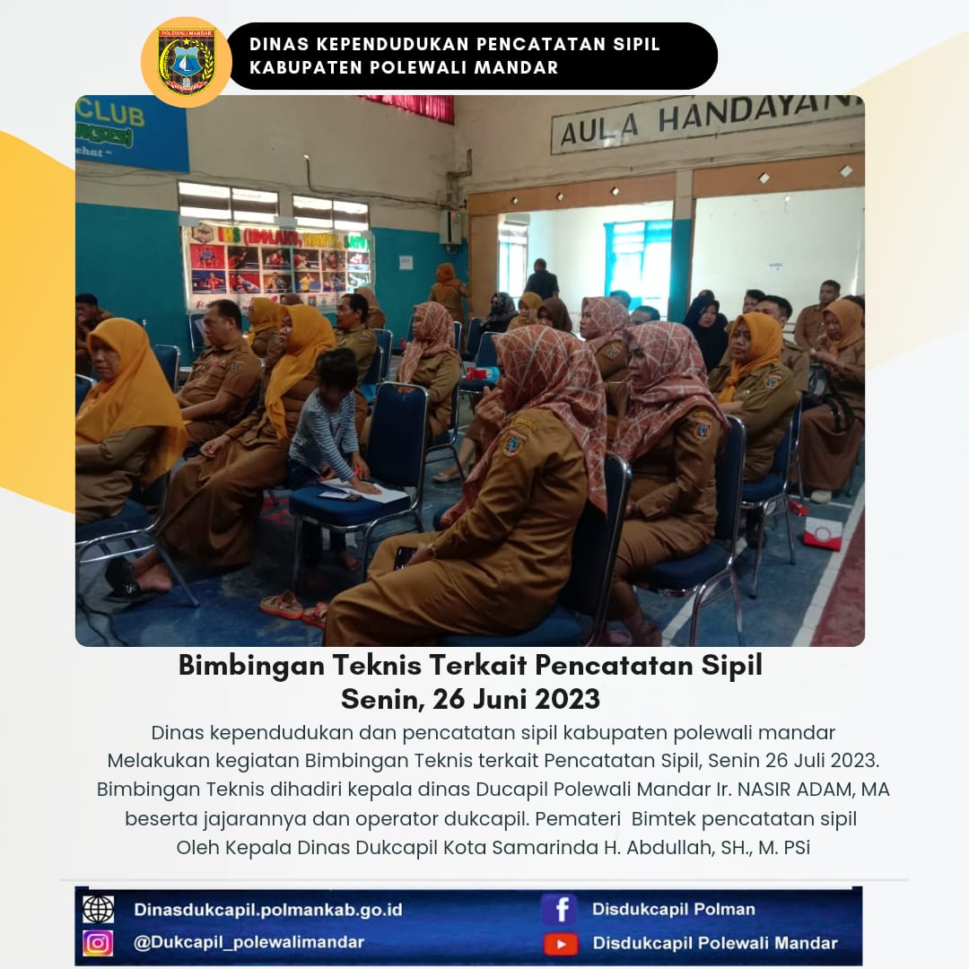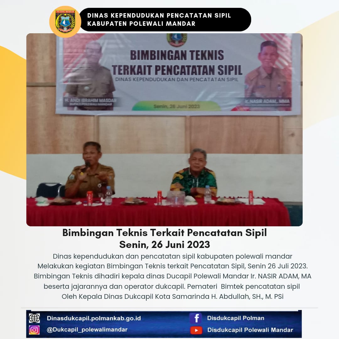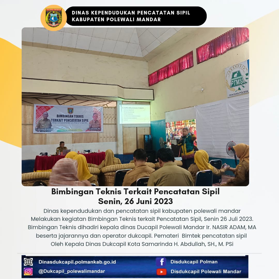 (Polewali Mandar , 26 Juni 2023), Dinas Kependudukan dan Pencatatan Sipil Kabupaten Polewali Mandar Bidang Pencatatan Sipil melakukan kegiatan Bimbingan Teknis Terkait Pencatatan Sipil. Kegiatan ini hadiri Oleh Kepala Dinas Dukcapil Polewali Mandar Ir. NASIR ADAM, MMA serta jajarannya dan Operator Dukcapil polewali mandar.