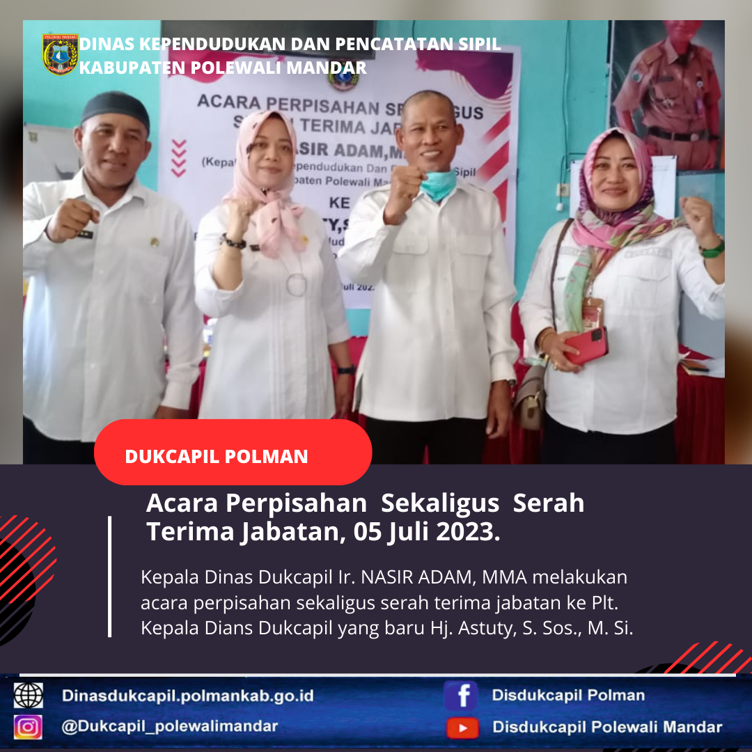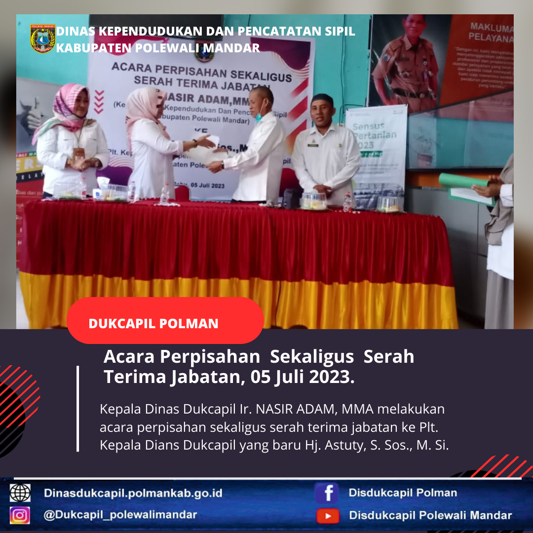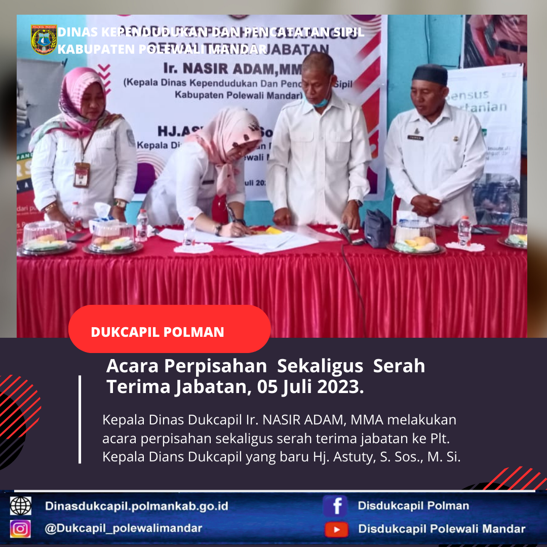 Polewali Mandar (05 Juni 2023), Serah terima jabatan kepala Dinas Kependudukan dan Pencatatan Sipil Polewali Mandar Ir. NASIR ADAM, MMA kepada Plt. Kepala Dinas Kependudukan dan Pencatatan Sipil Hj. Astuty, S. Sos.,M.Si.