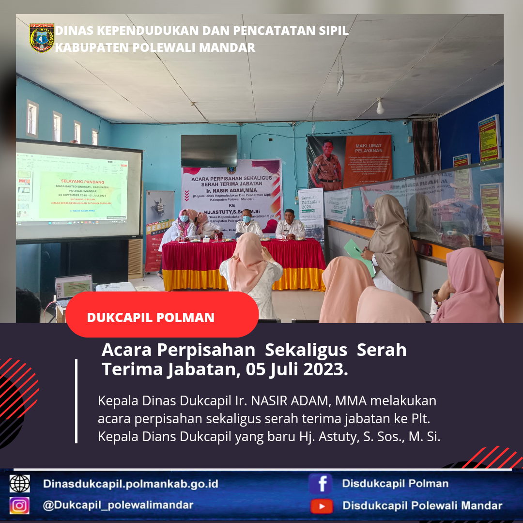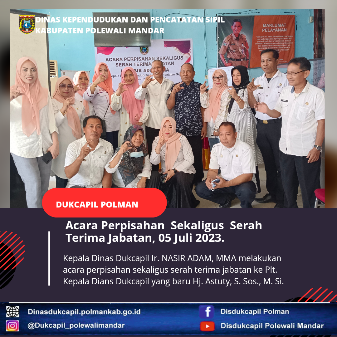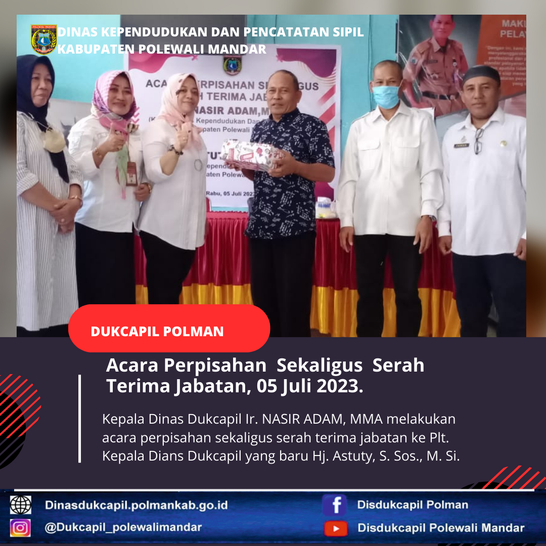 Polewali Mandar (05 Juni 2023), Serah terima jabatan kepala Dinas Kependudukan dan Pencatatan Sipil Polewali Mandar Ir. NASIR ADAM, MMA kepada Plt. Kepala Dinas Kependudukan dan Pencatatan Sipil Hj. Astuty, S. Sos.,M.Si.