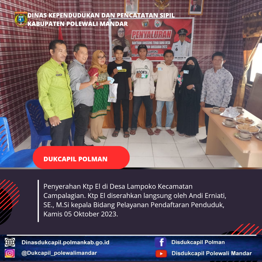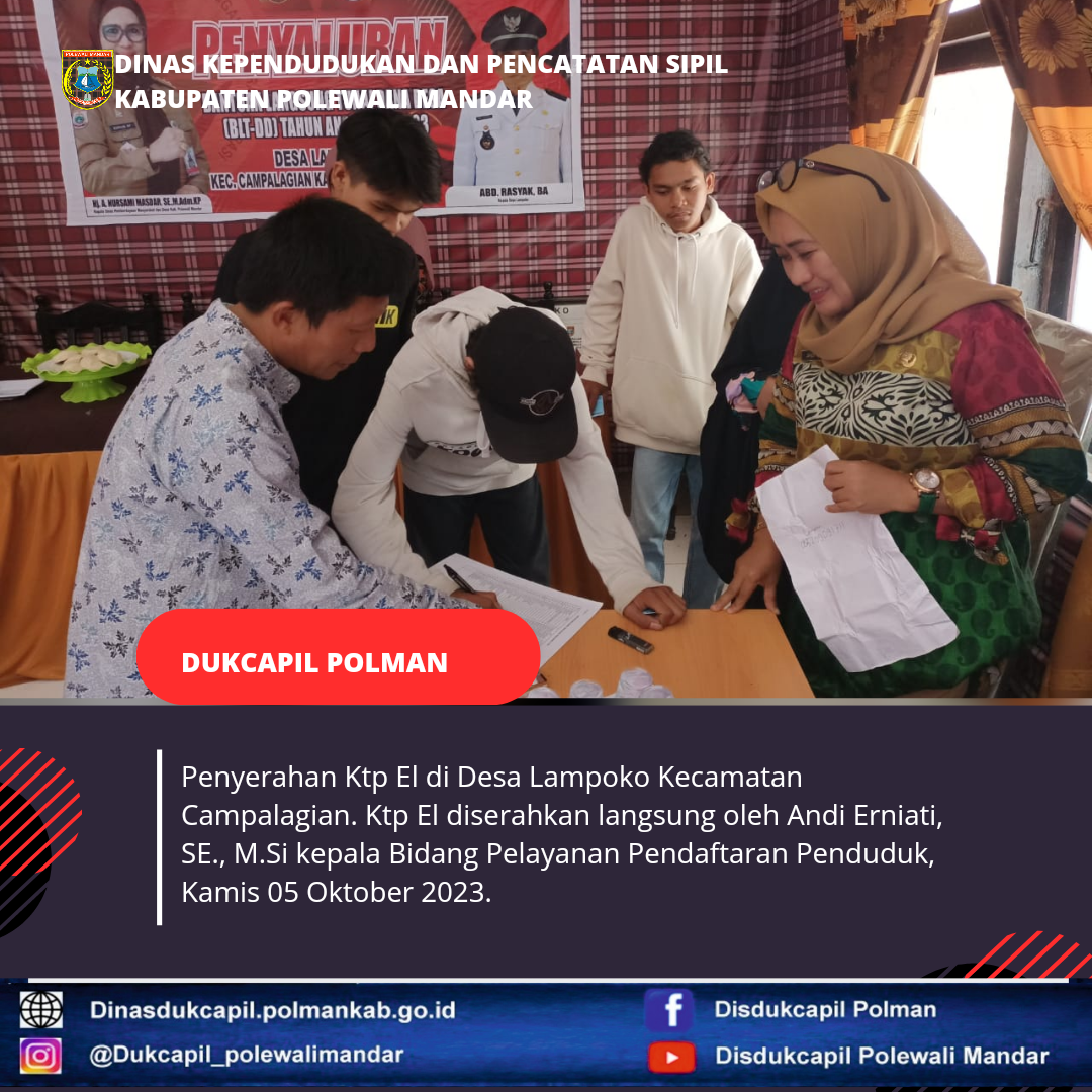 Penyerahan Ktp El di Desa Lampoko Kecamatan Campalagian. Ktp El diserahkan langsung oleh Andi Erniati, SE., M.Si kepala Bidang Pelayanan Pendaftaran Penduduk, Kamis 05 Oktober 2023.