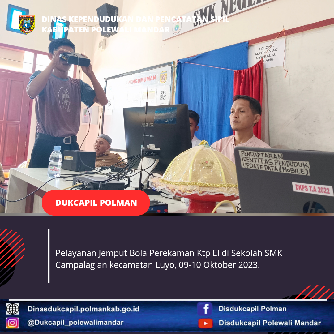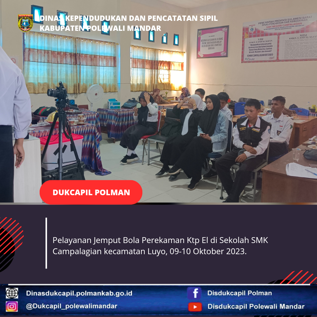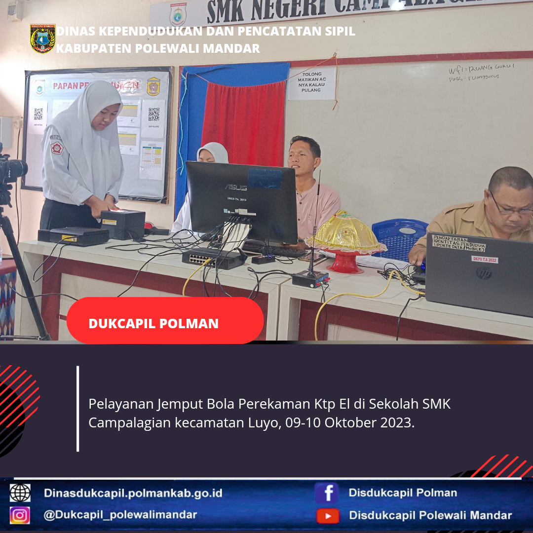 Polewali Mandar 09-10 Oktober 2023, Dinas Kependudukan dan Pencatatan Sipil Kabupaten Polewali Mandar melakukan Pelayanan Jemput Bola Perekaman Ktp El di sekolah SMK Campalagian.