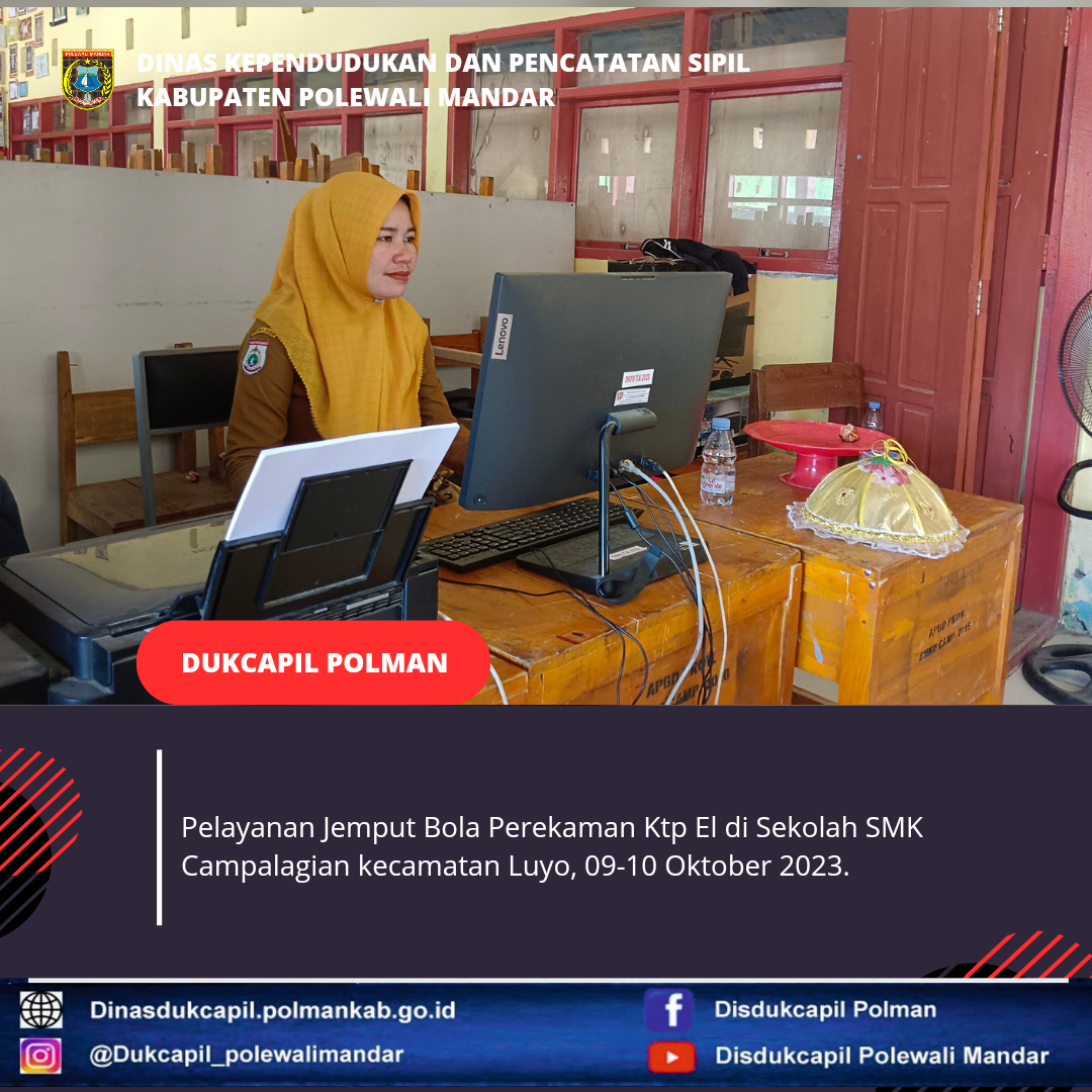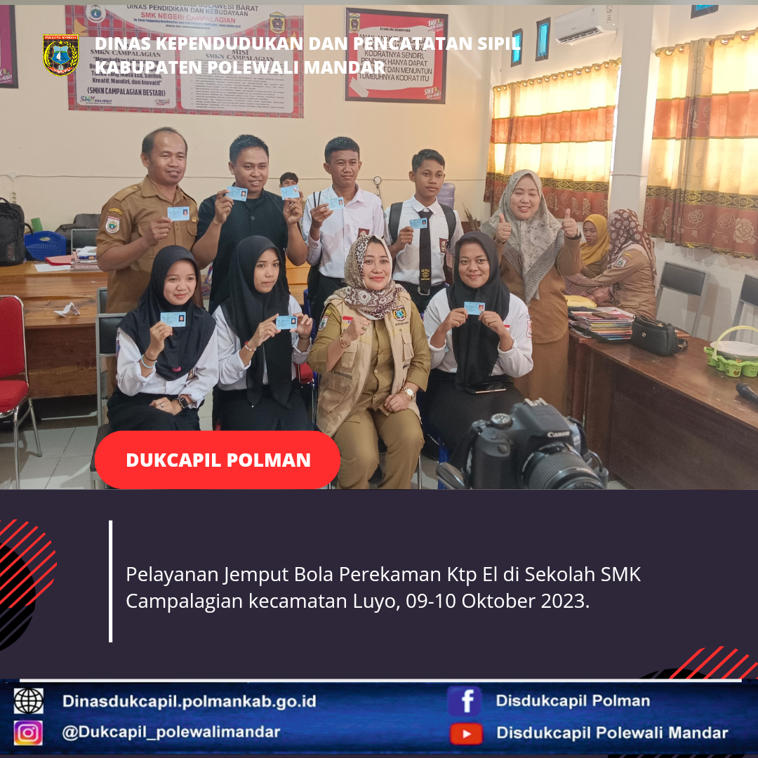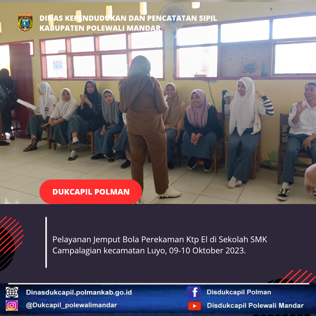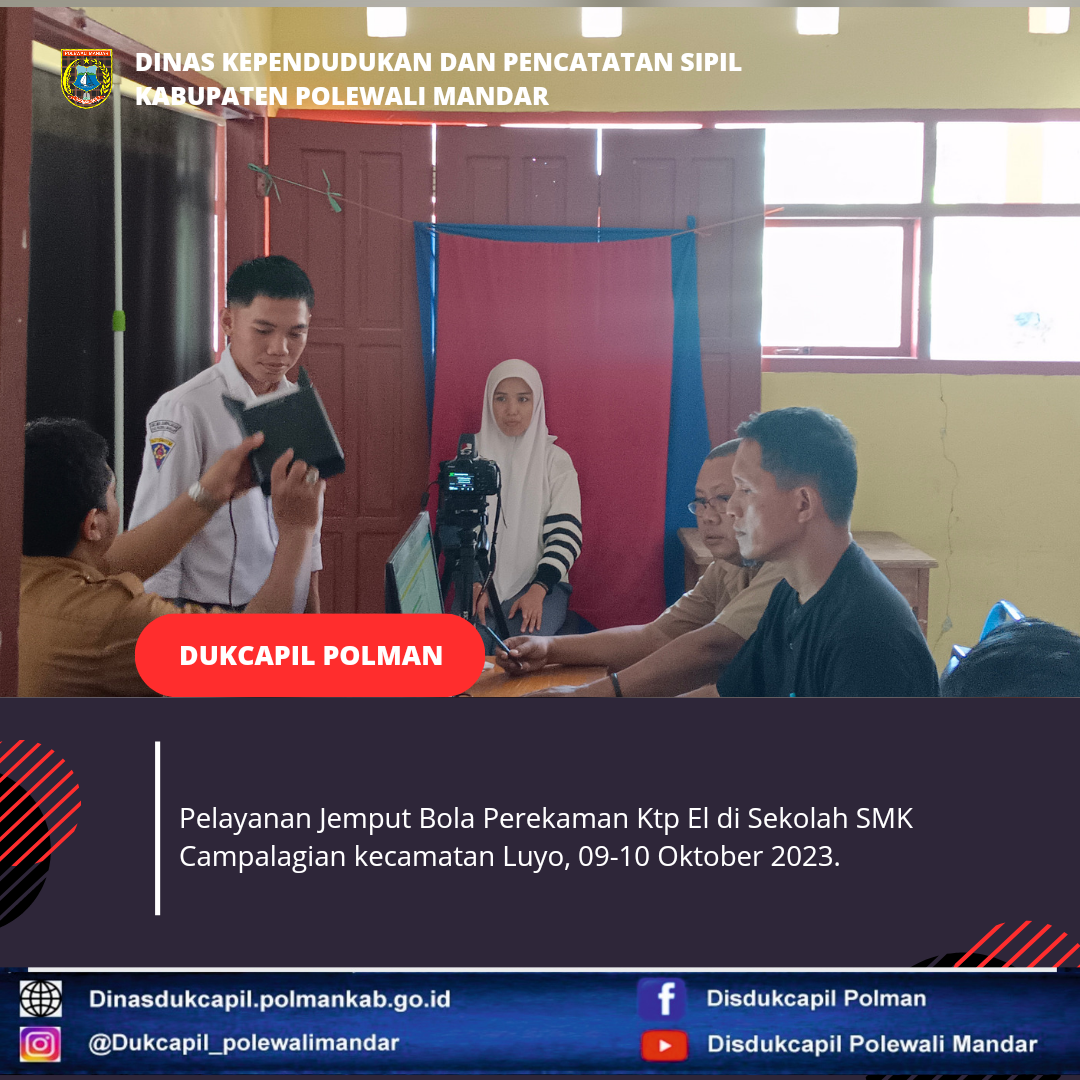 Polewali Mandar 09-10 Oktober 2023, Dinas Kependudukan dan Pencatatan Sipil Kabupaten Polewali Mandar melakukan Pelayanan Jemput Bola Perekaman Ktp El di sekolah SMK Campalagian.