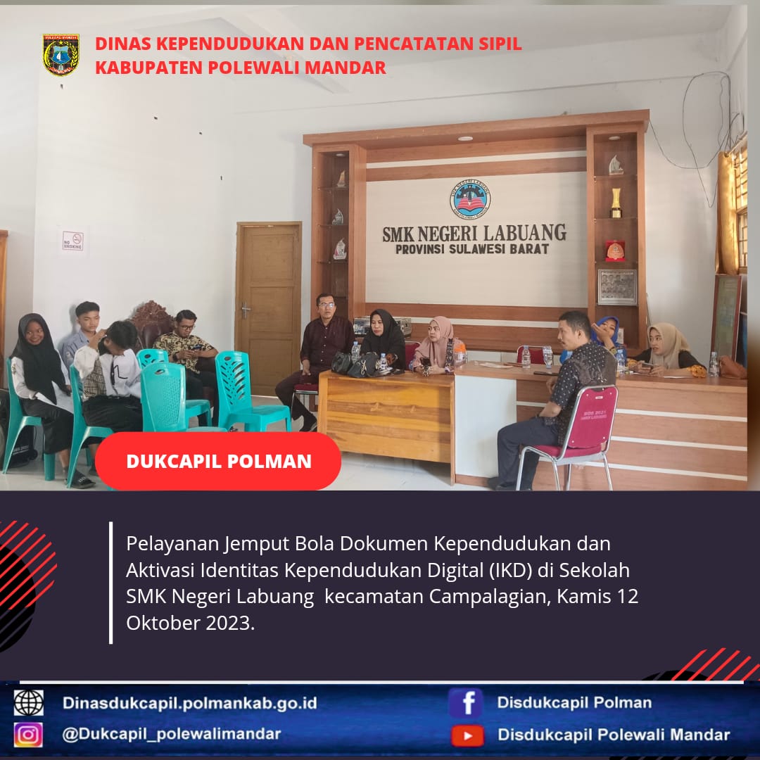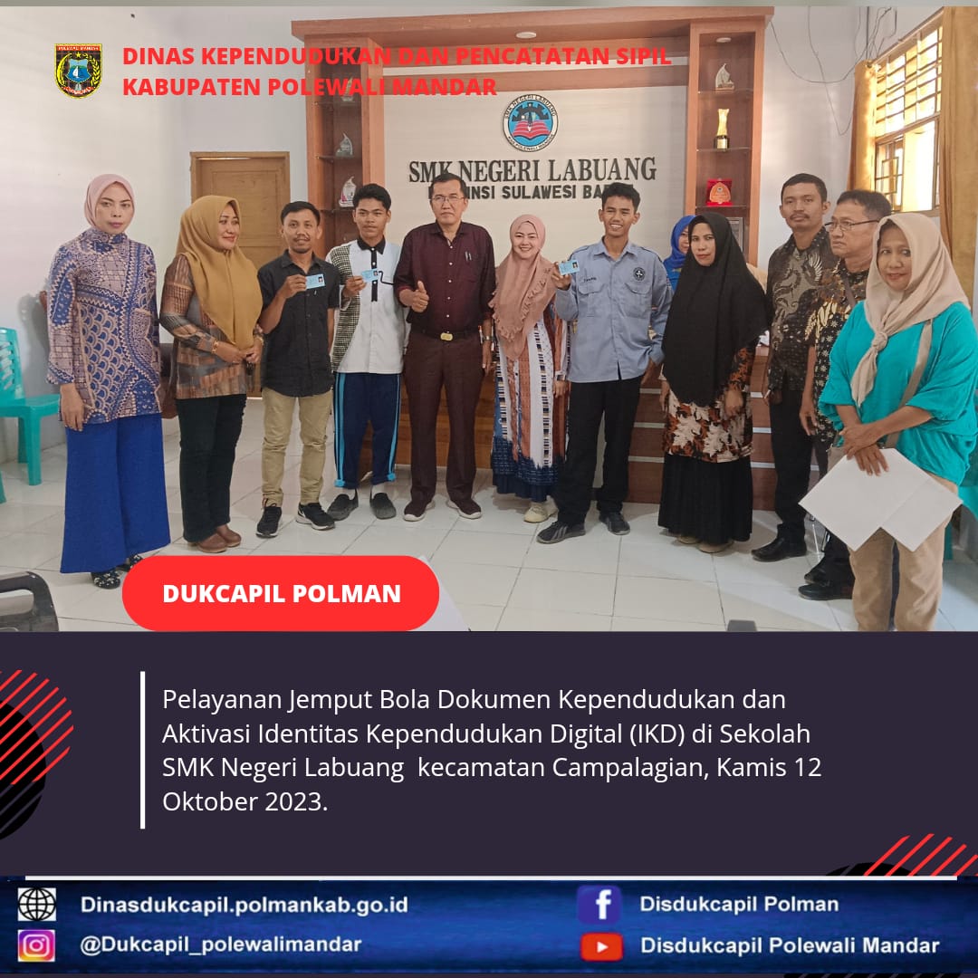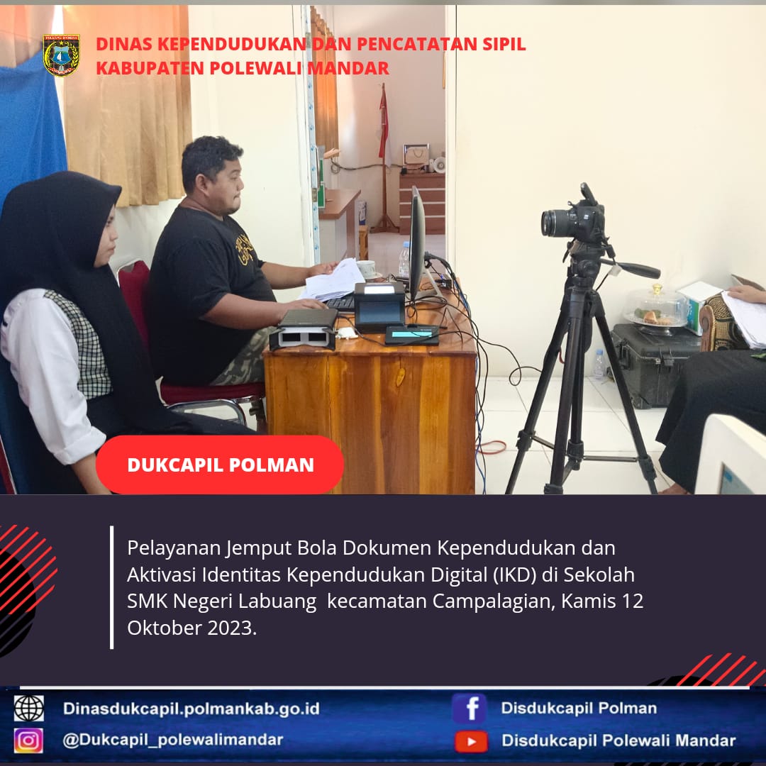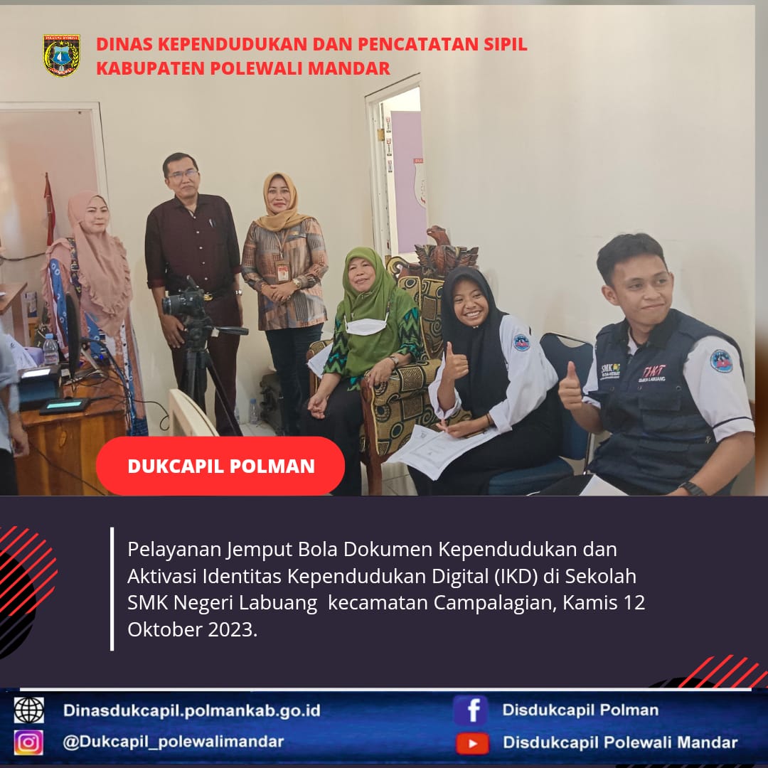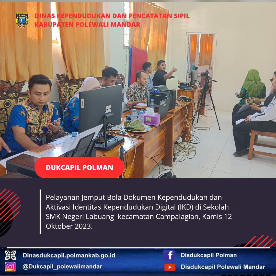 Polewali Mandar (Kamis, 12 Oktober 2023), Dinas Kependudukan dan Pencatatan Sipil Polewali Mandar melakukan Pelayanan Jemput Bola di Sekolah SMK Negeri Labuang Kecamatan Campalagian. Jenis layanan yang diselenggarakan yaitu perekaman KTP-El dan aktivasi IKD (Identitas Kependudukan Digital).