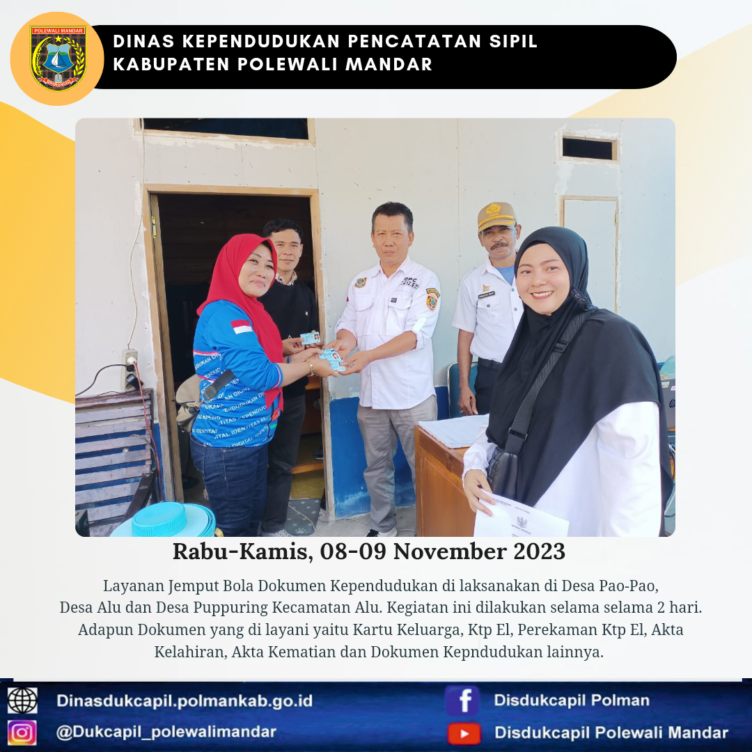 Polewali Mandar (08 November 2023), Dinas Kependudukan dan Pencatatan Sipil Kabupaten Polewali Mandar melakukan layanan jemput bola Dokumen Kependudukan di Desa Pao-Pao, Desa Alu dan Desa Puppuring.