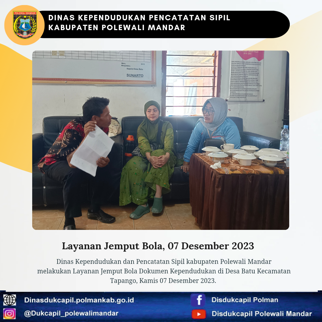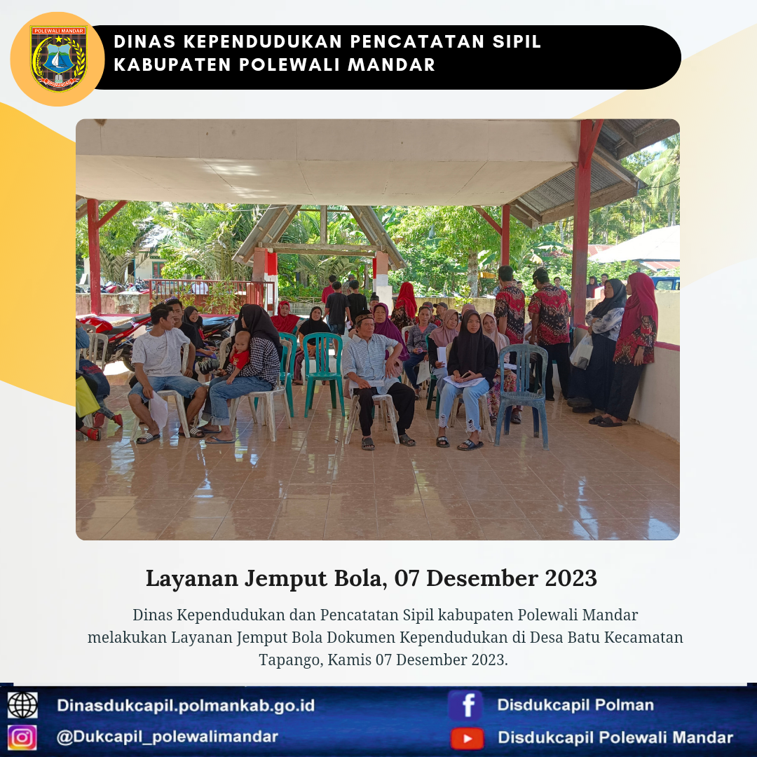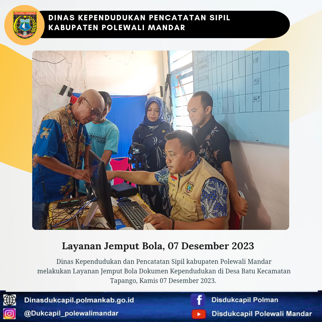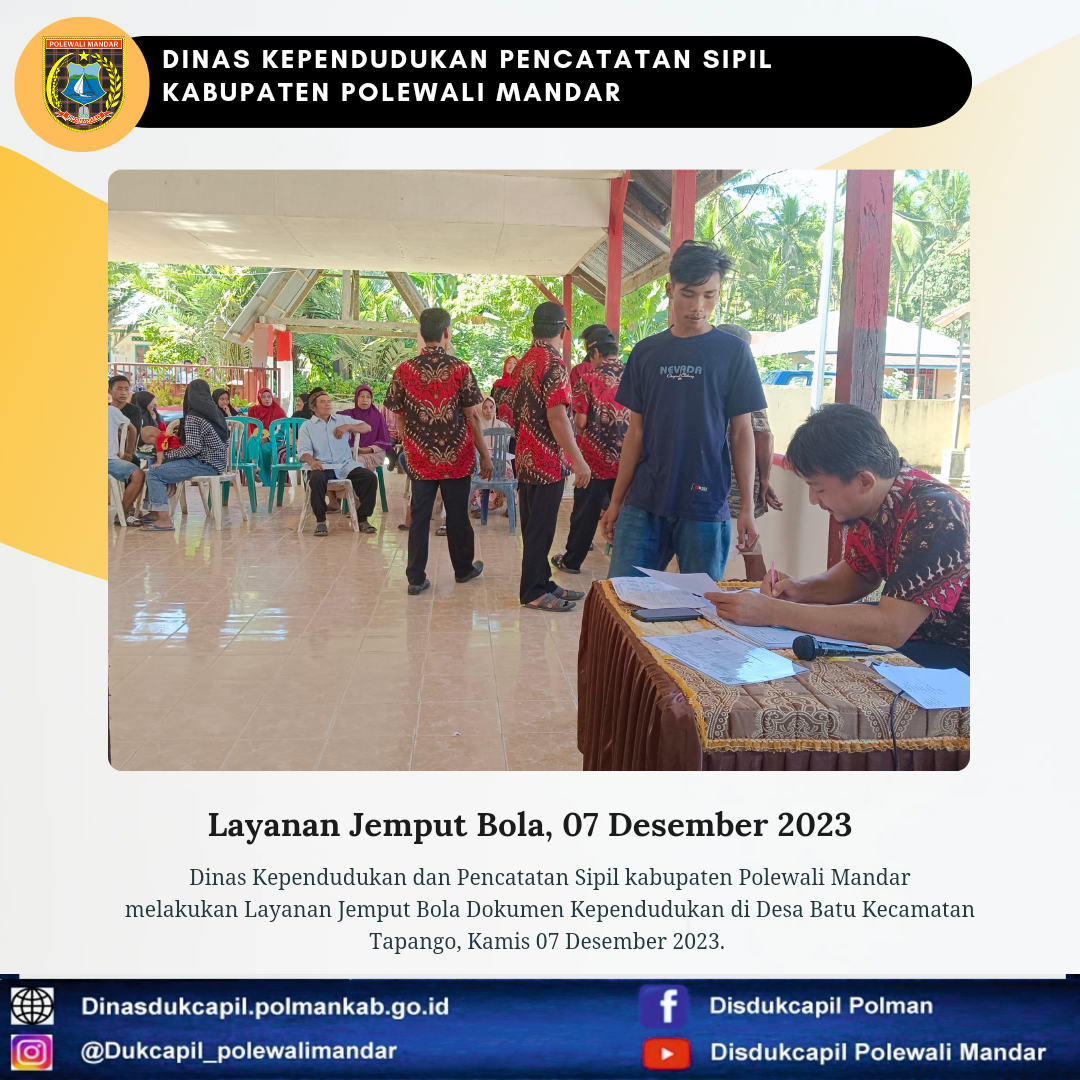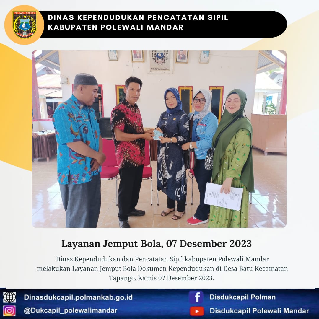 Polewali Mandar (07 Desember 2023), Dinas Kependudukan dan Pencatatan Sipil Kabupaten Polewali Mandar melakukan layanan jemput bola Dokumen Kependudukan di Desa Batu Kecamatan Tapango.