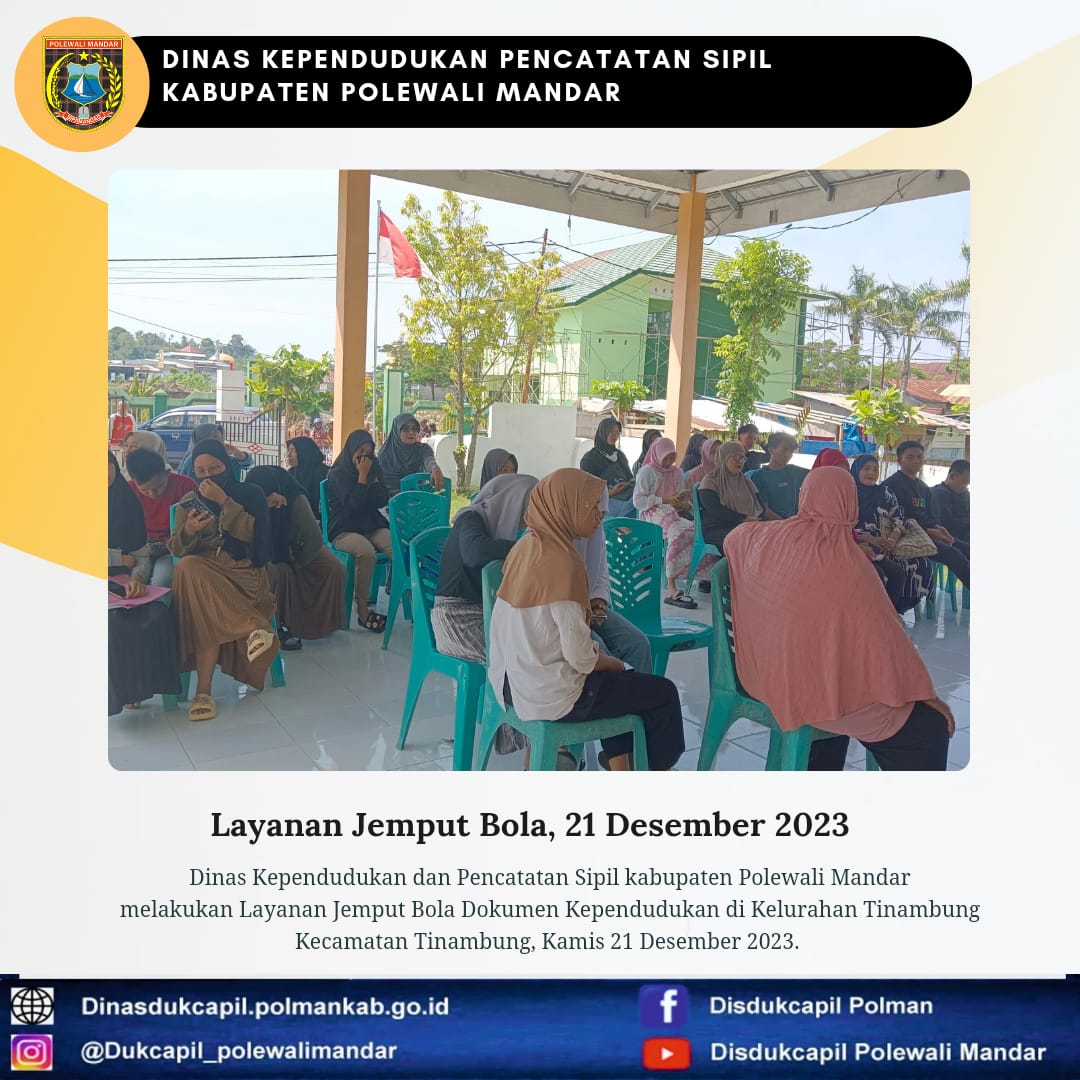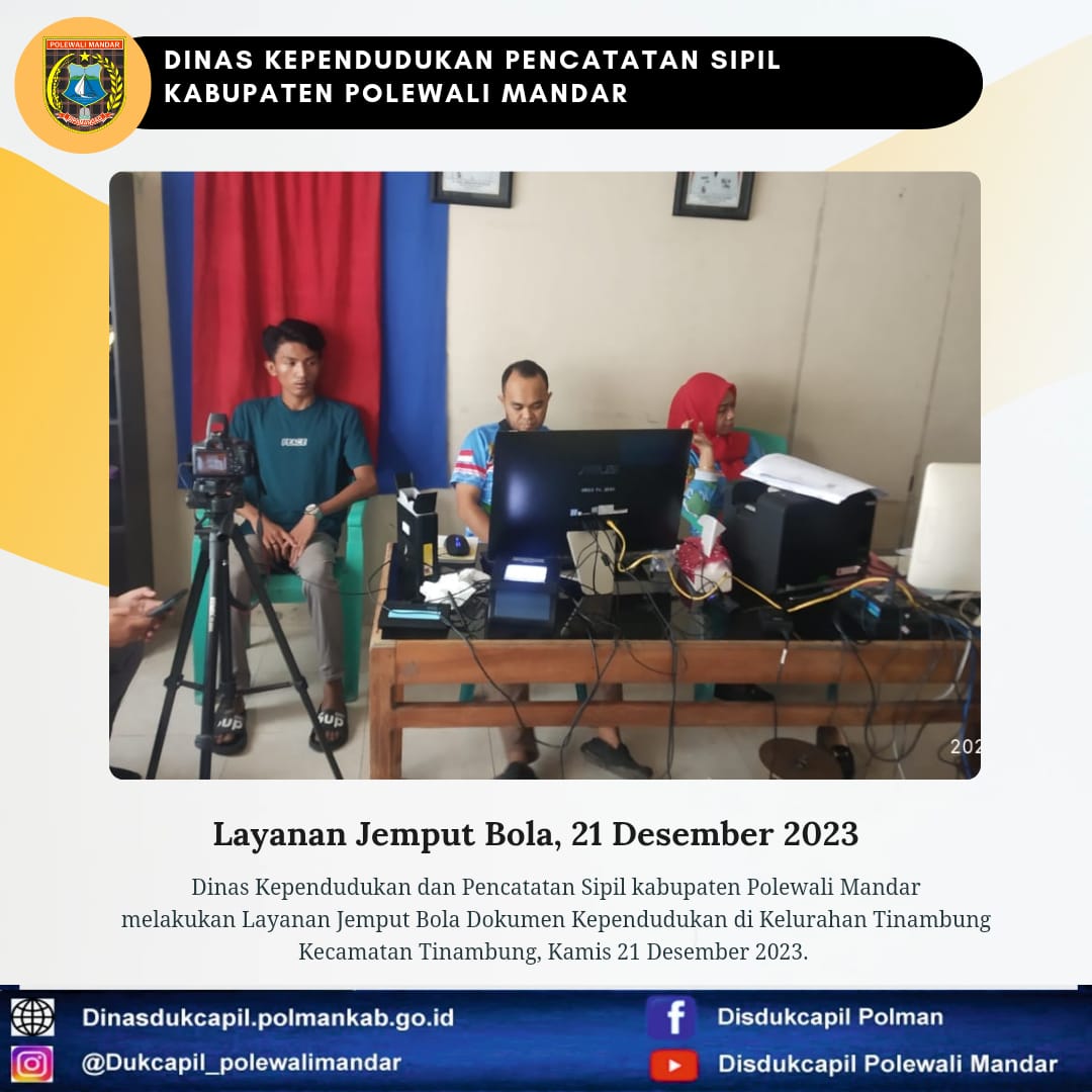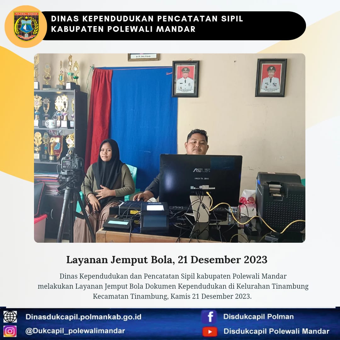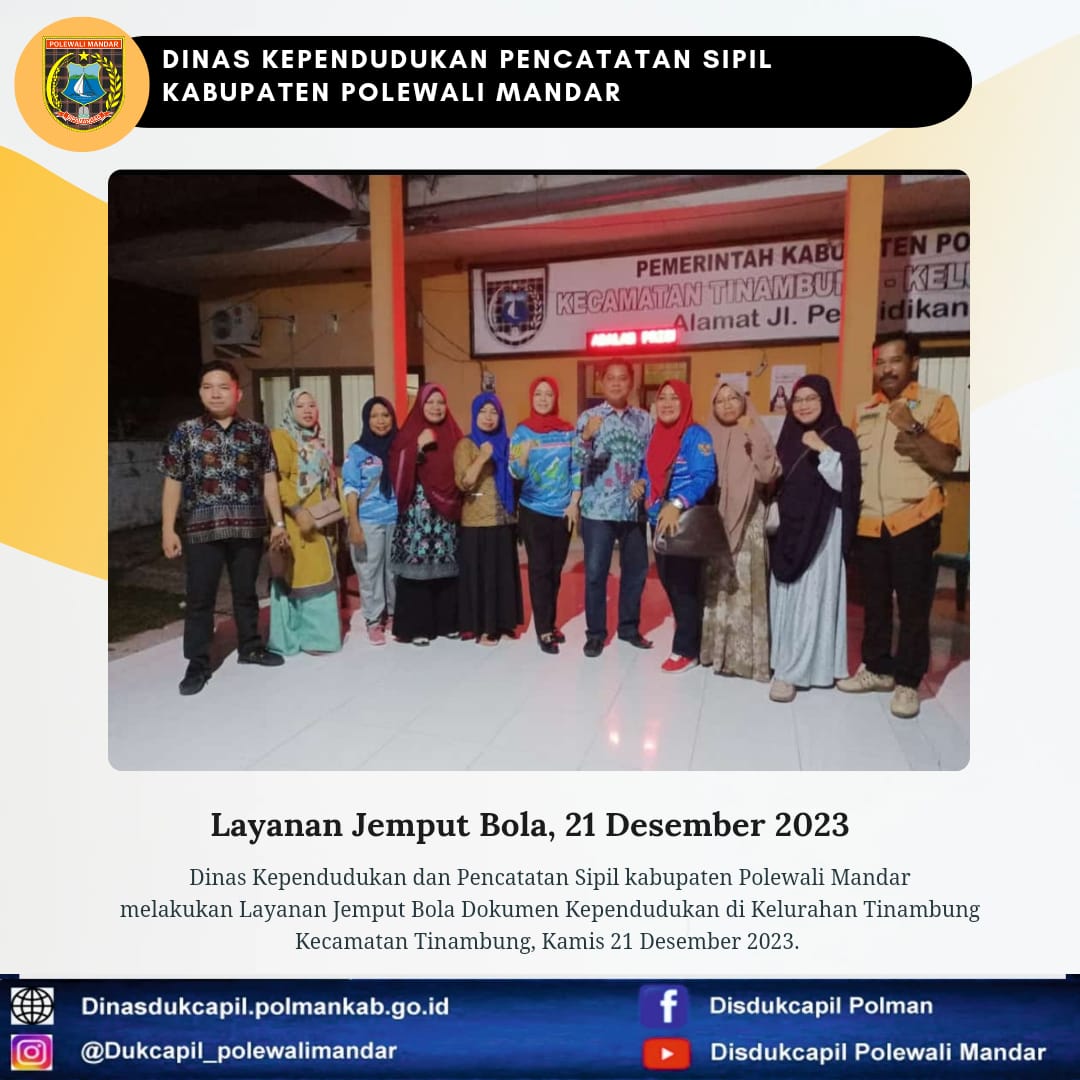 Polewali Mandar (21 Desember 2023), Dinas Kependudukan dan Pencatatan Sipil Kabupaten Polewali Mandar melakukan layanan jemput bola Dokumen Kependudukan di Kelurahan Tinambung Kecamatan Tinambung.