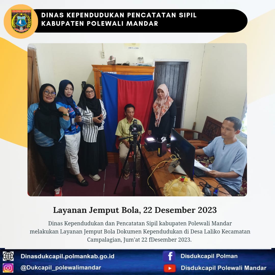 Polewali Mandar (22 Desember 2023), Dinas Kependudukan dan Pencatatan Sipil Kabupaten Polewali Mandar melakukan layanan jemput bola Dokumen Kependudukan di Desa Laliko Kecamatan Campalagian.