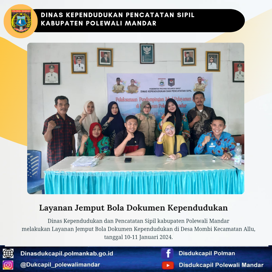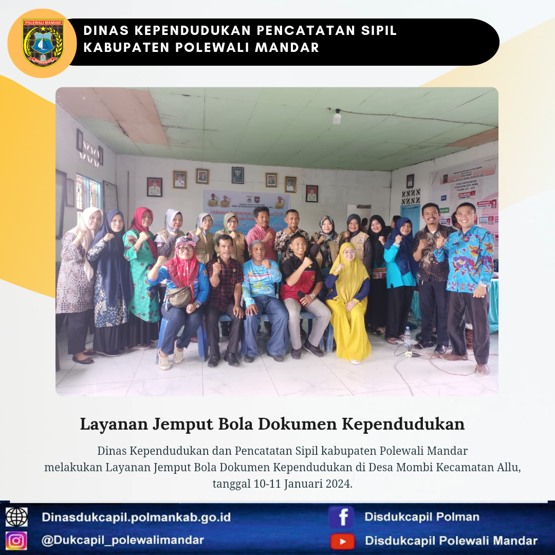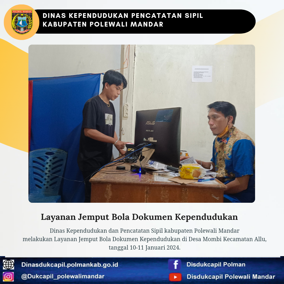 Polewali Mandar (10-11 Januari 2024), Dinas Kependudukan dan Pencatatan Sipil Kabupaten Polewali Mandar melakukan layanan jemput bola Dokumen Kependudukan di Desa Mombi Kecamatan Allu.