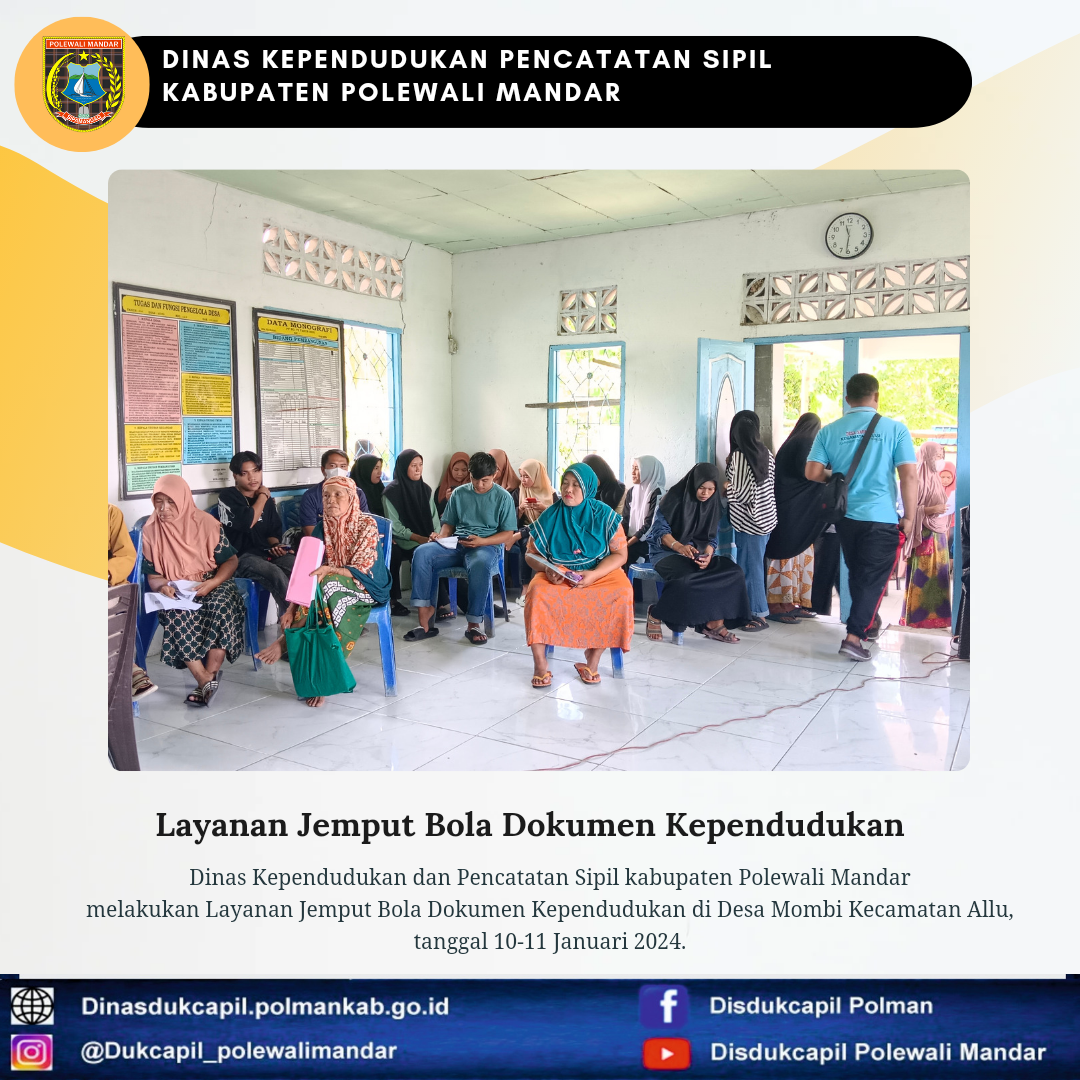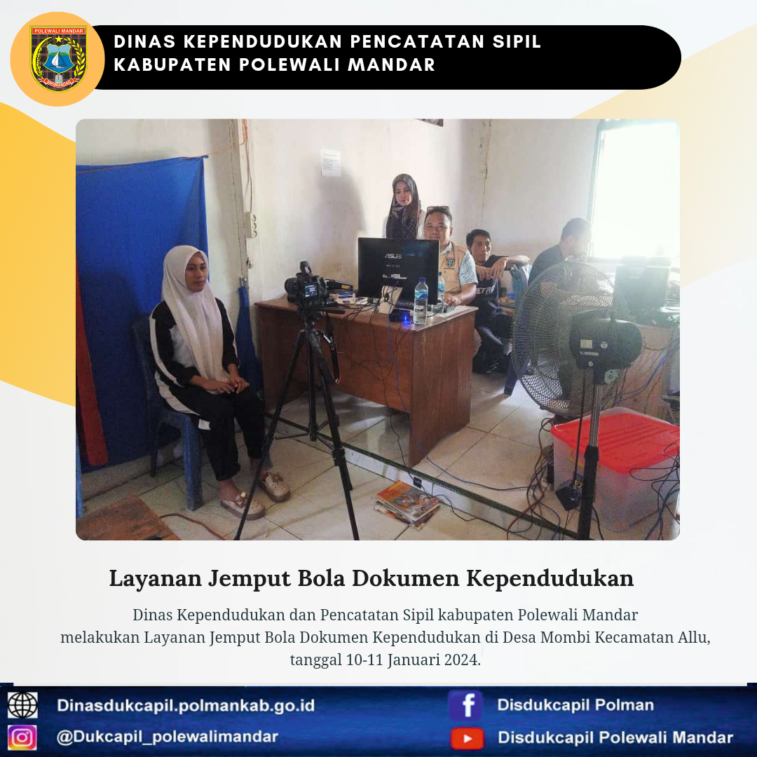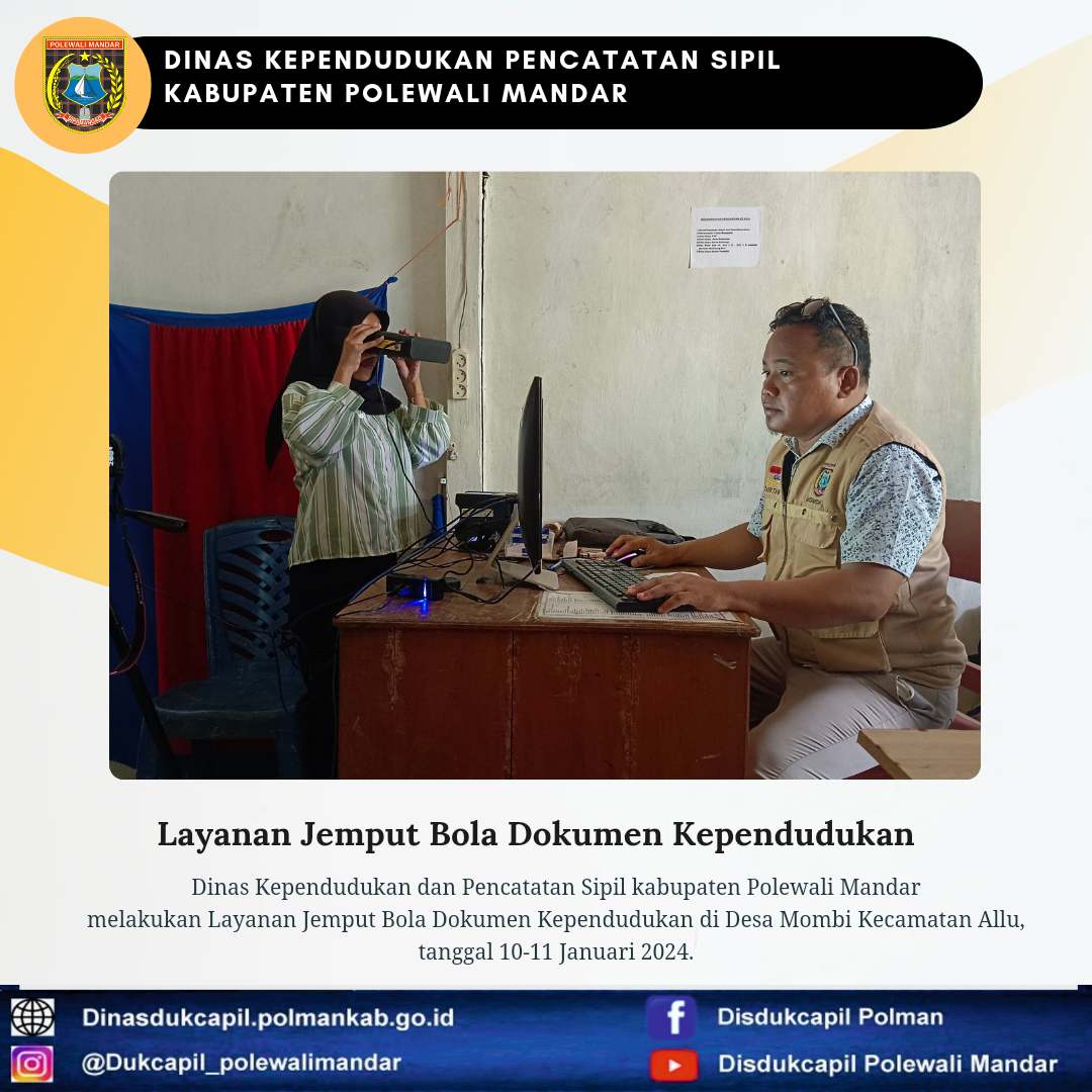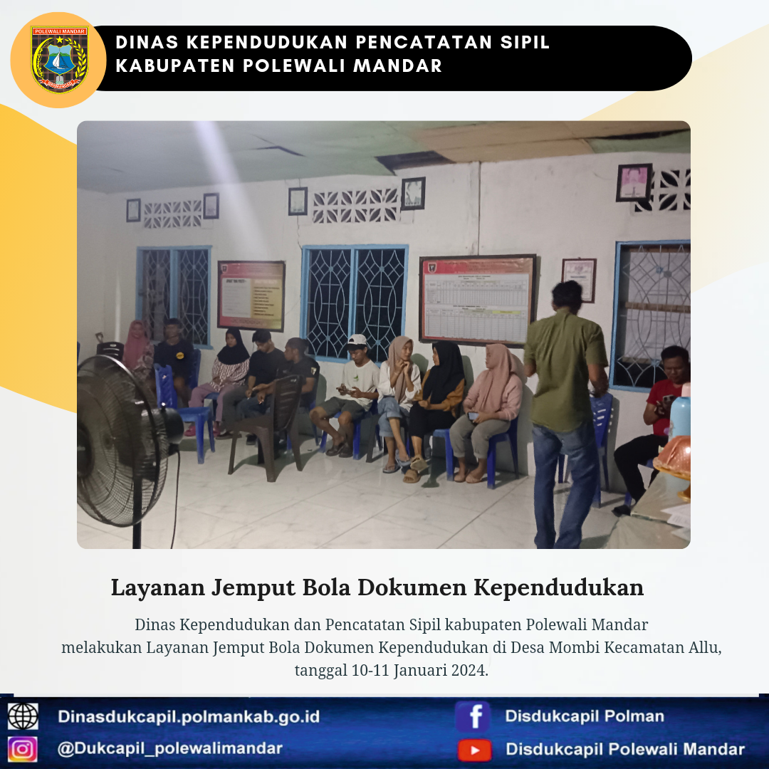 Polewali Mandar (10-11 Januari 2024), Dinas Kependudukan dan Pencatatan Sipil Kabupaten Polewali Mandar melakukan layanan jemput bola Dokumen Kependudukan di Desa Mombi Kecamatan Allu.