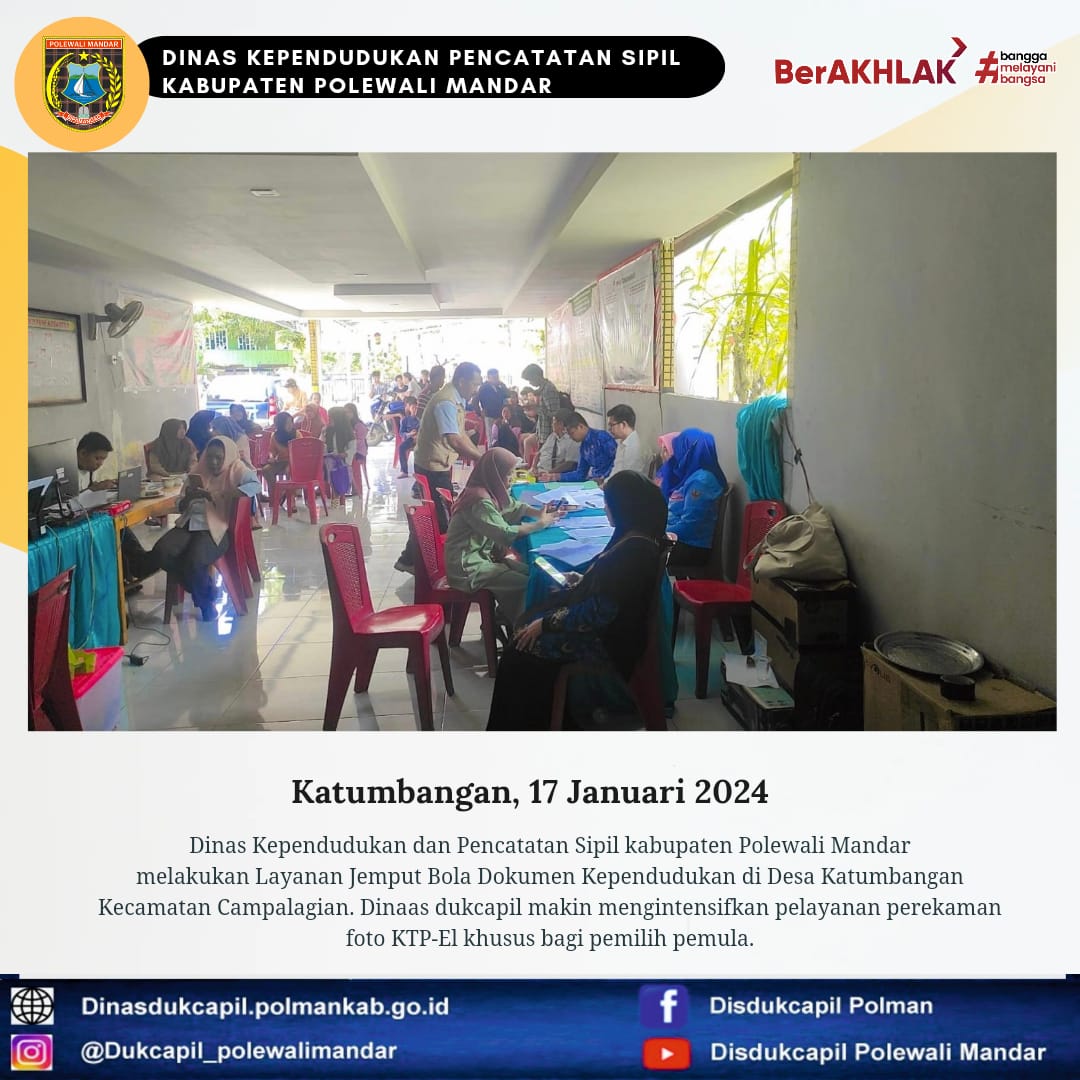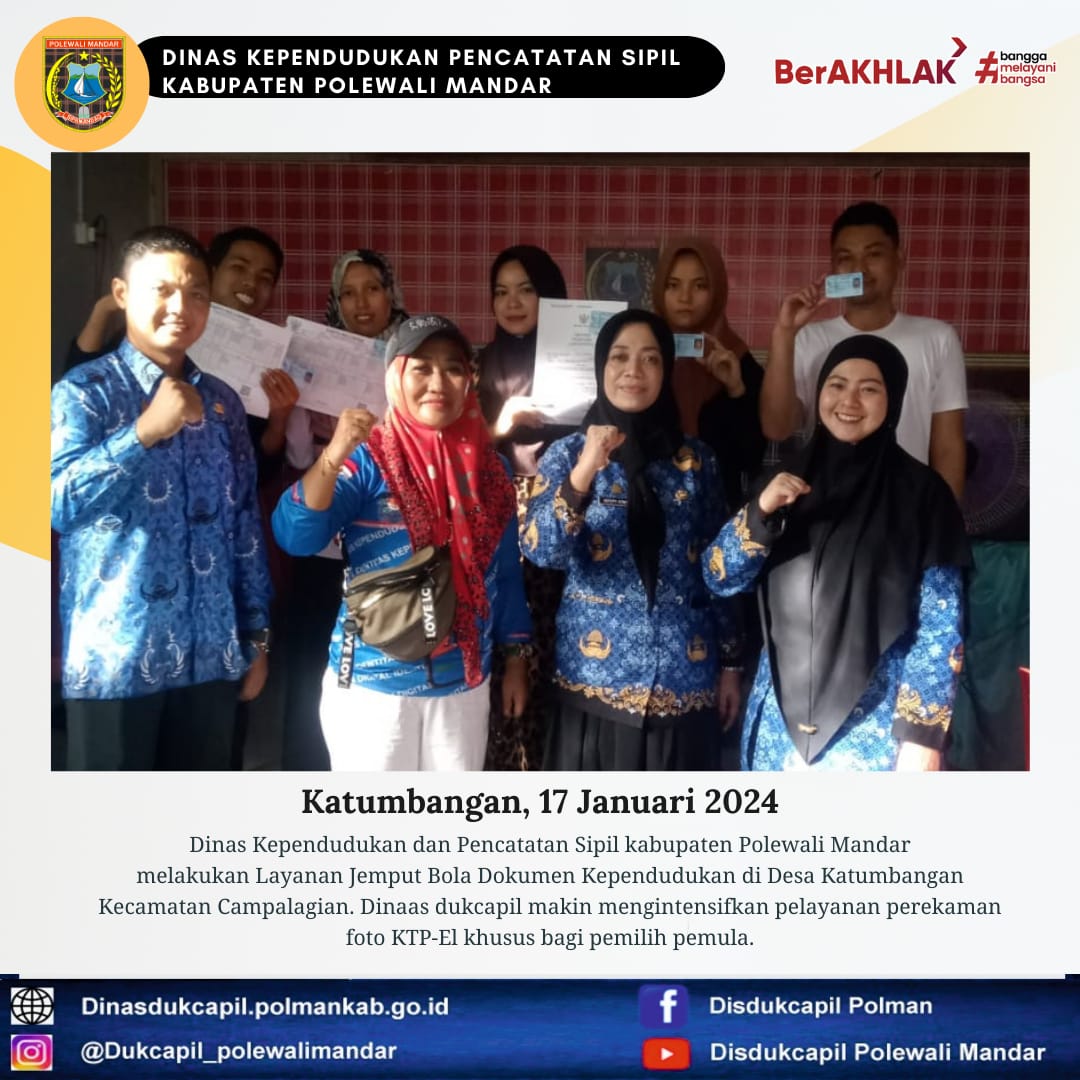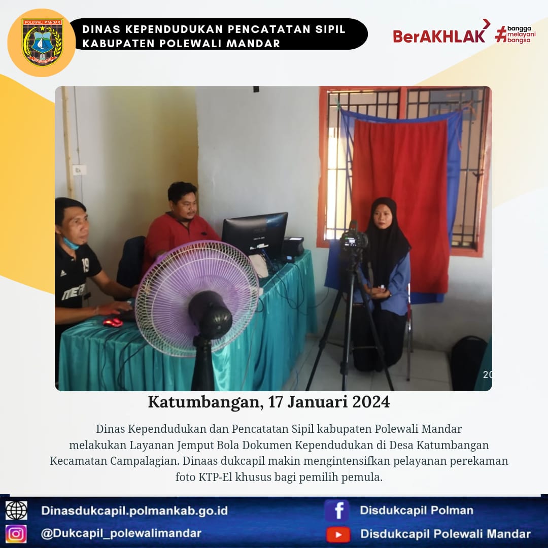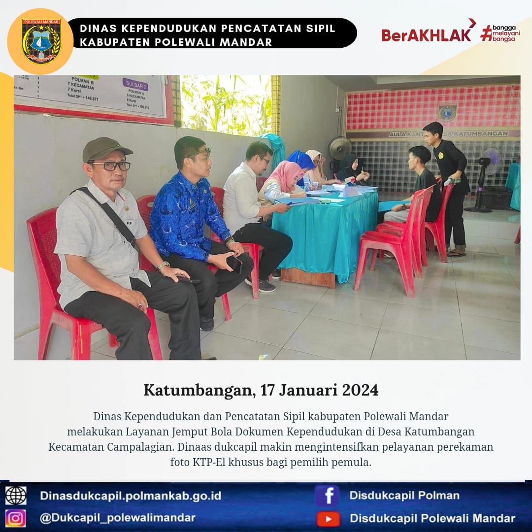 Katumbangan (17 Januari 2024), Dinas Kependudukan dan Pencatatan Sipil Kabupaten Polewali Mandar melakukan layanan jemput bola Dokumen Kependudukan di Desa Katumbangan Kecamatan Campalagian.