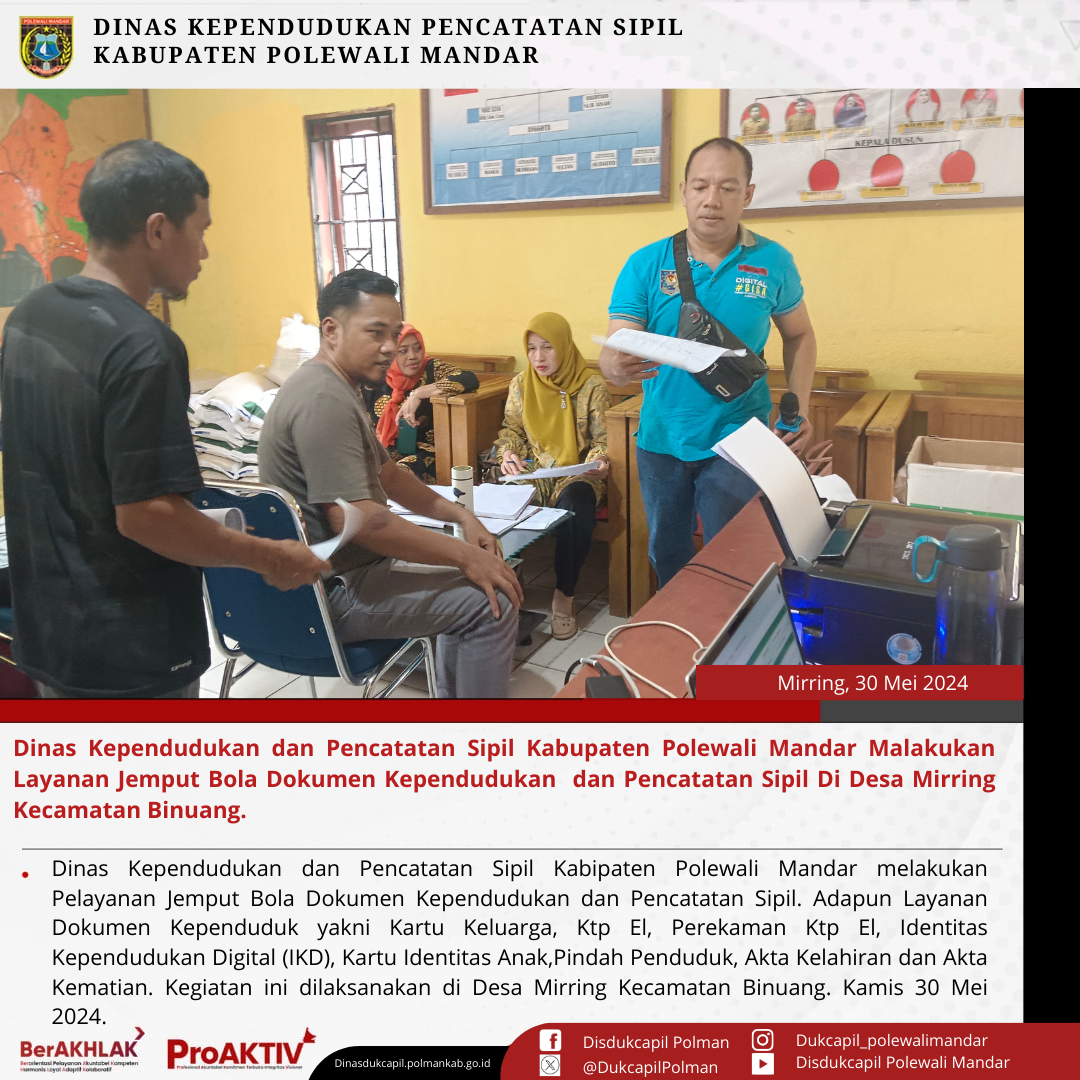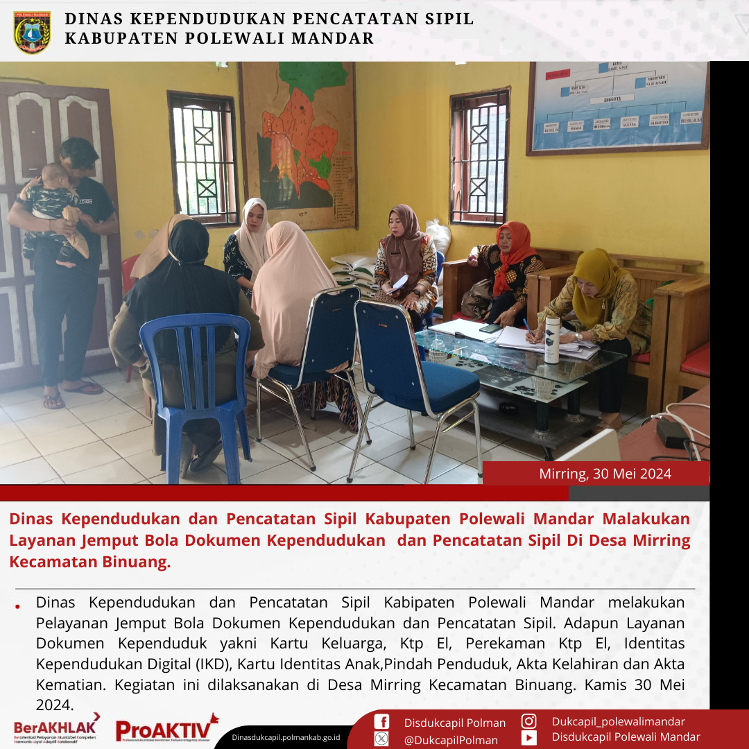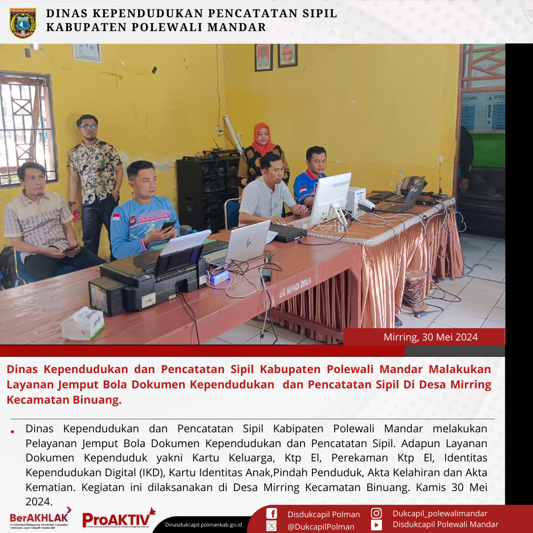 Mirring (Kamis, 30 Mei 2024), Dinas Kependudukan dan Pencatatan Sipil Kabupaten Polewali Mandar melakukan layanan jemput bola Dokumen Kependudukan dan Pencatatan Sipil di Desa Mirring Kecamatan Binuang.