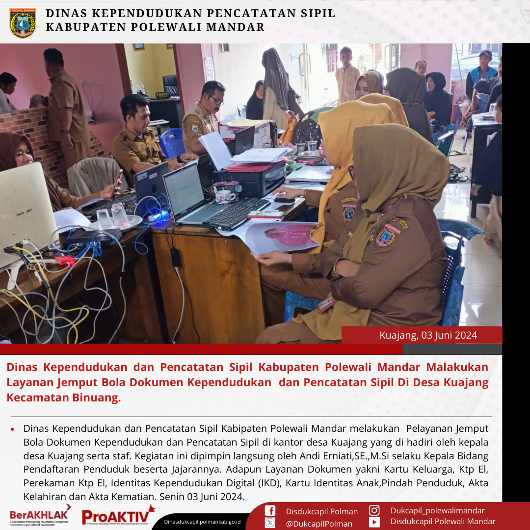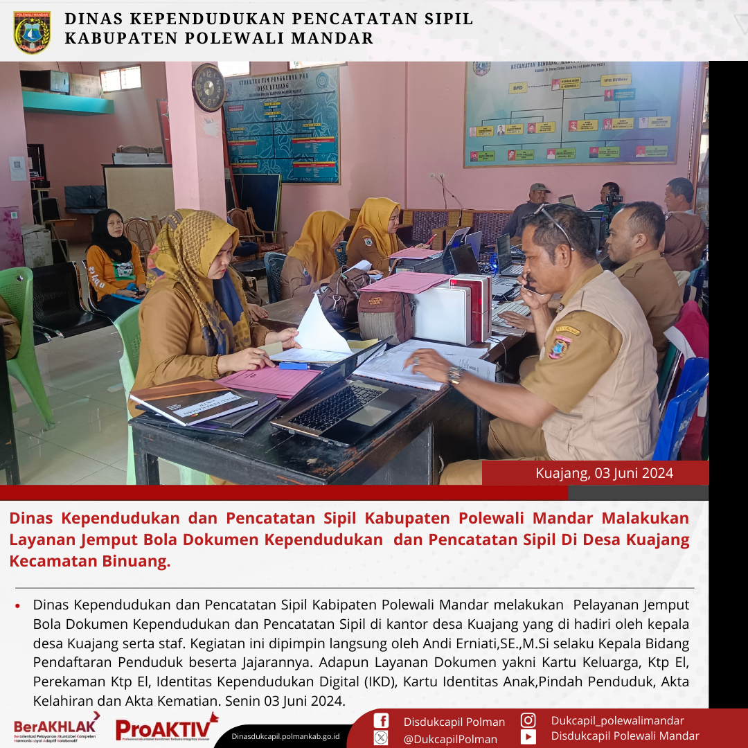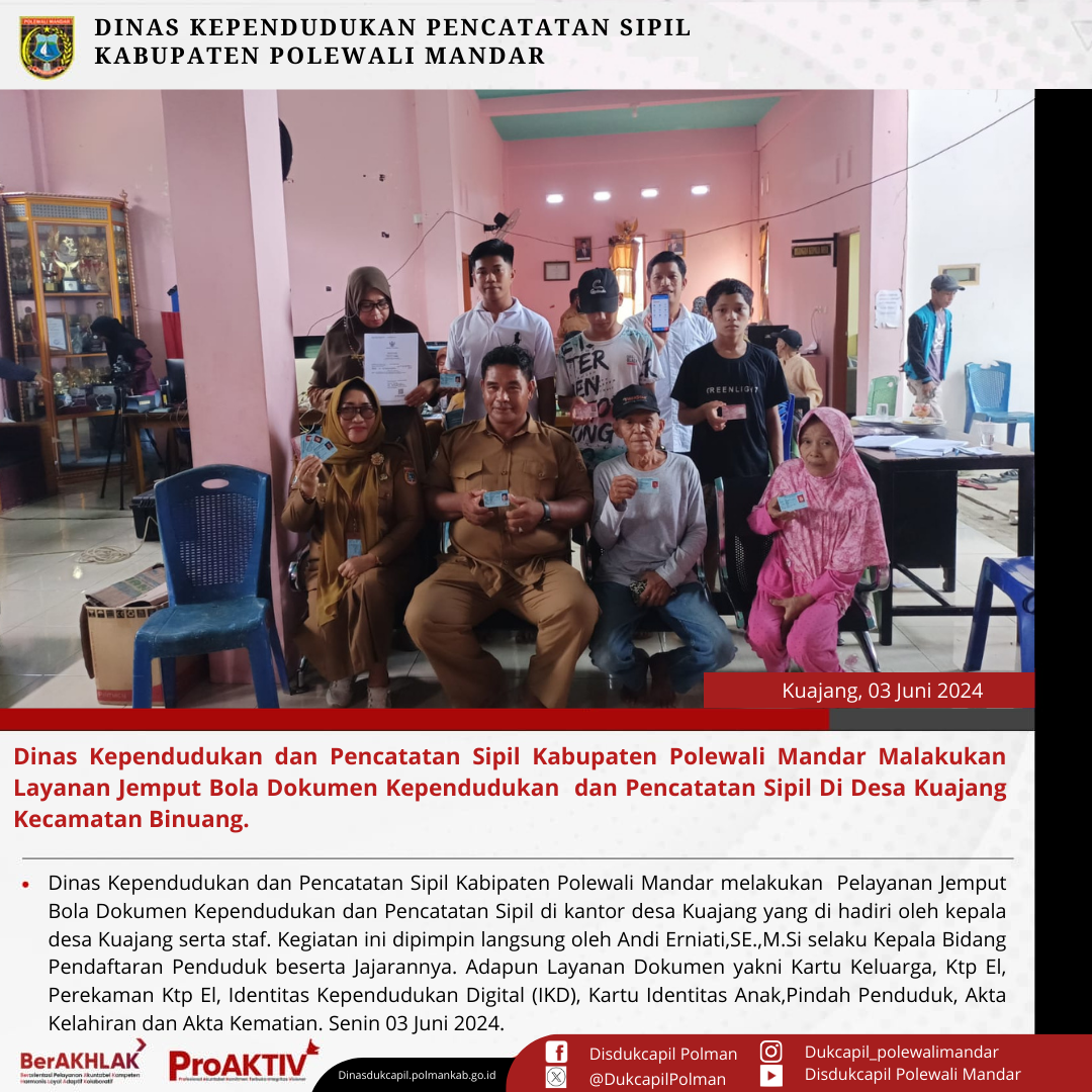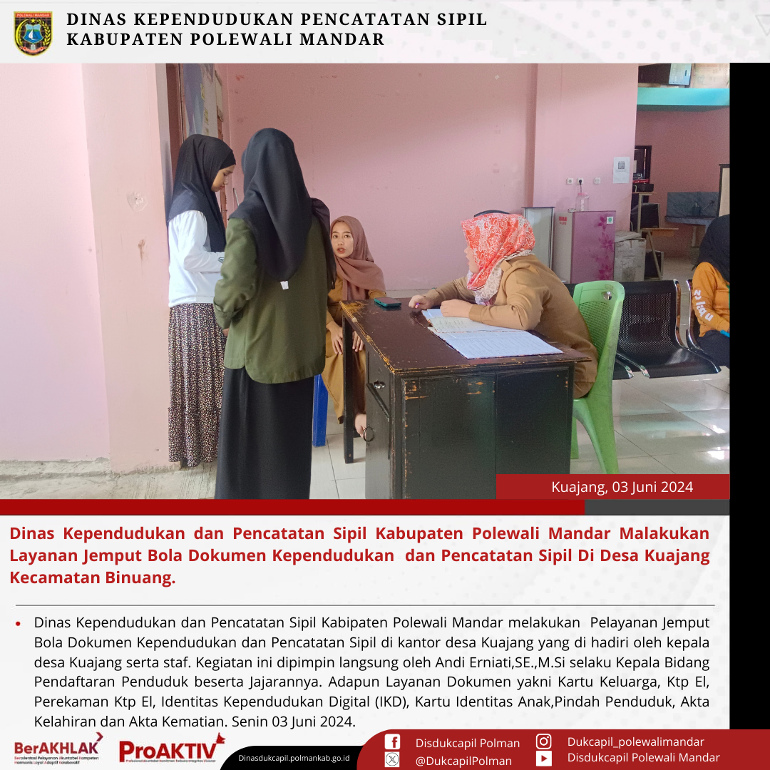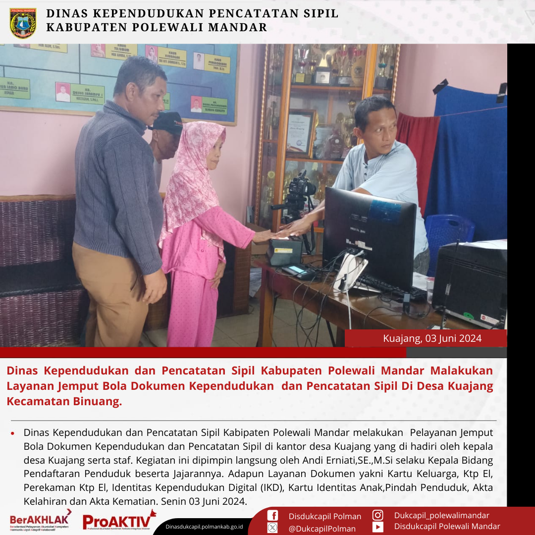 (Senin, 03 Juni 2024), Dinas Kependudukan dan Pencatatan Sipil Kabupaten Polewali Mandar melakukan layanan jemput bola Dokumen Kependudukan dan Pencatatan Sipil di Desa Kuajang Kecamatan Binuang.