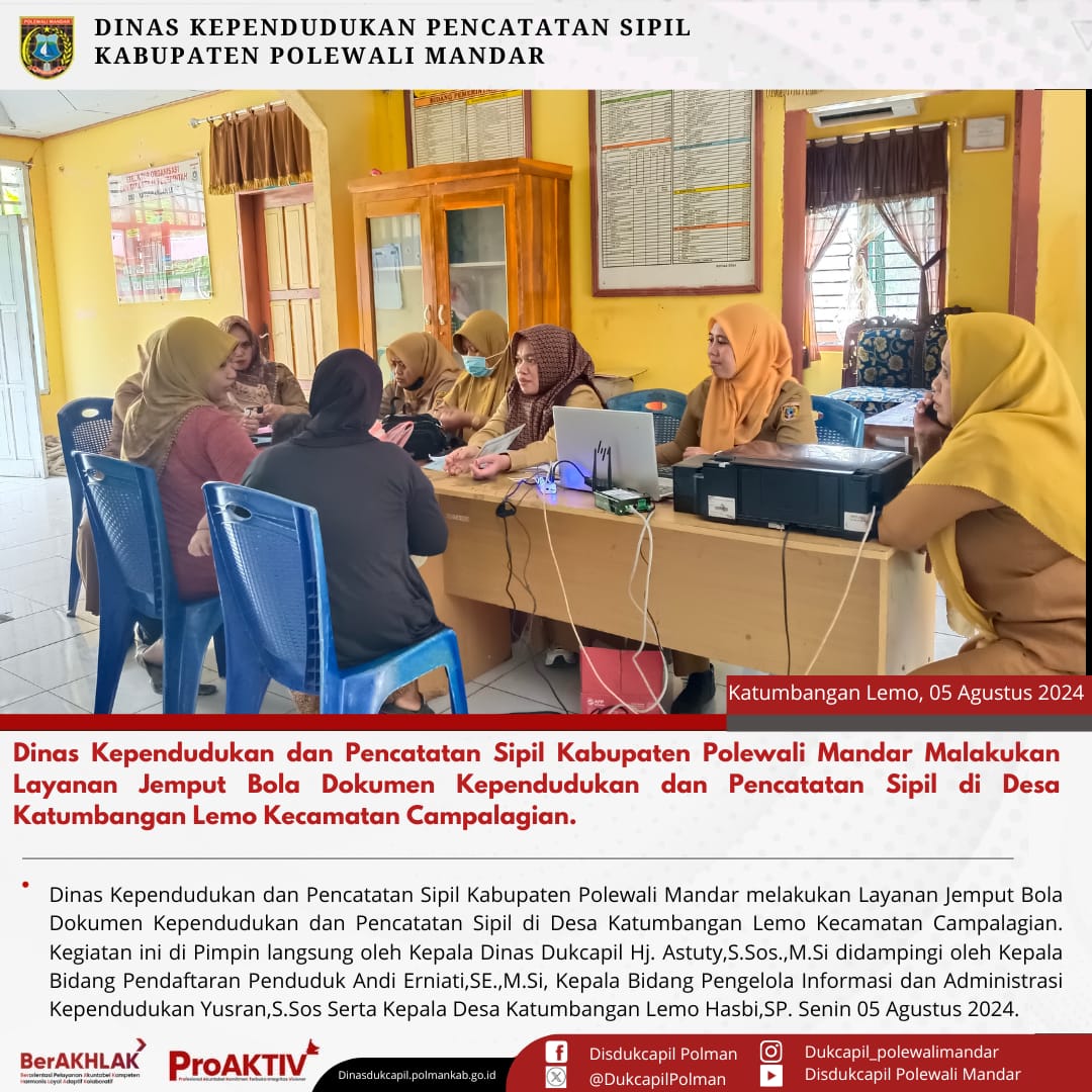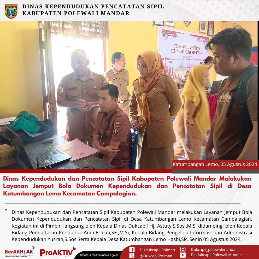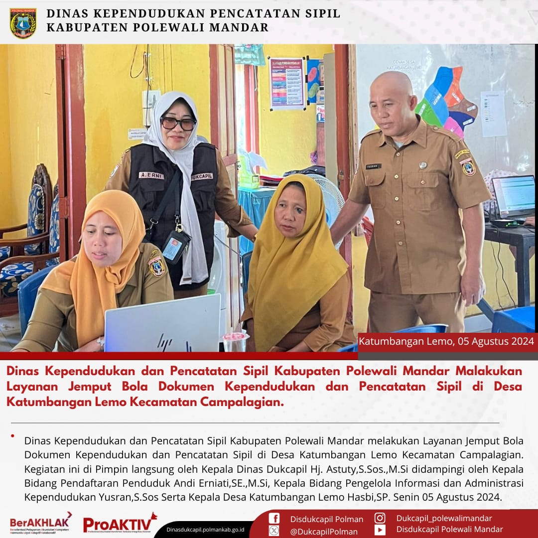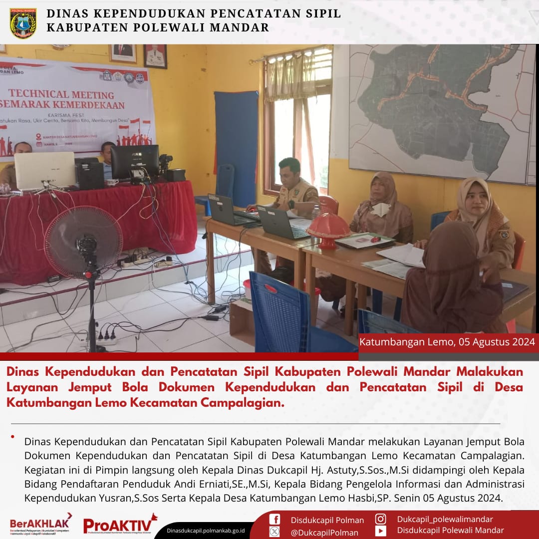 Senin, 05 Agustus 2024, Dinas Kependudukan dan Pencatatan Sipil Kabupaten Polewali Mandar melakukan layanan jemput bola Dokumen Kependudukan dan Pencatatan Sipil di Desa Katumbangan Lemo Kecamatan Campalagian.