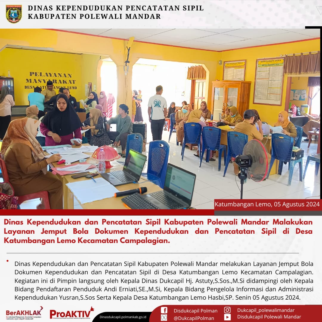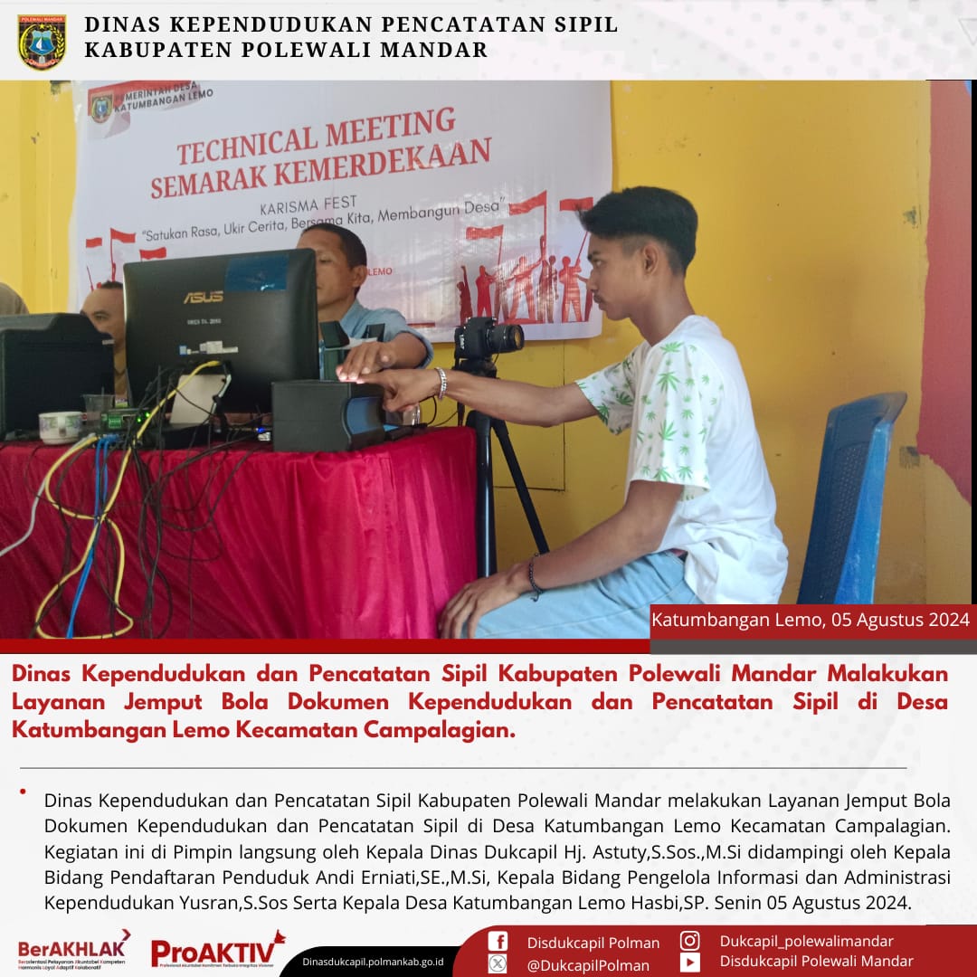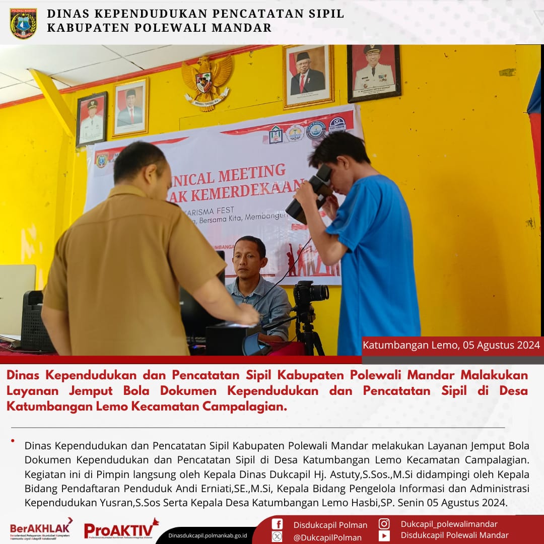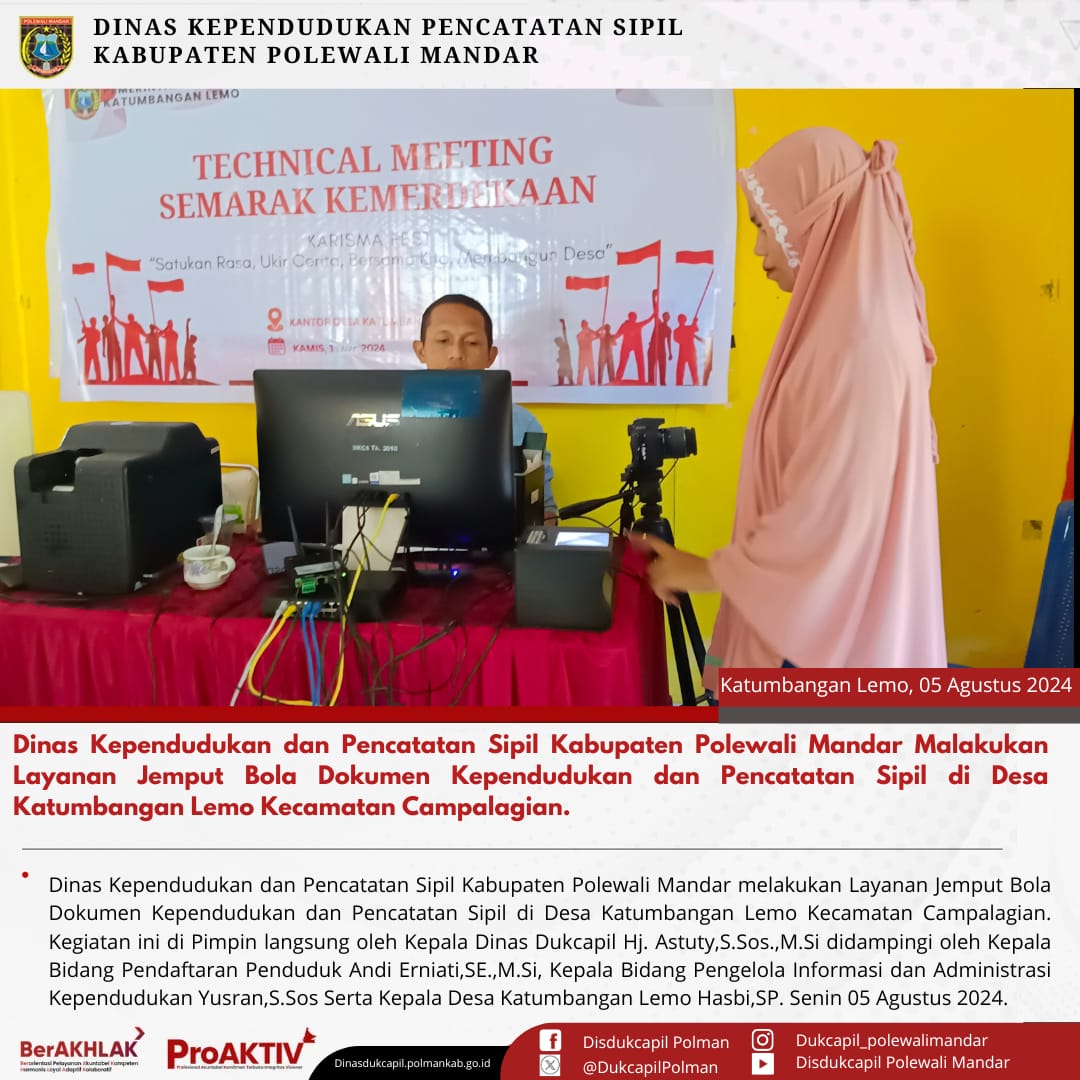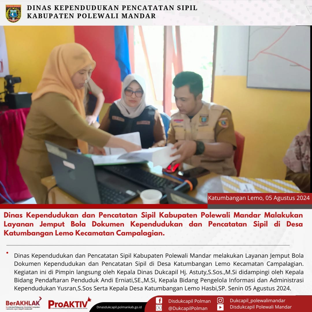 Senin, 05 Agustus 2024, Dinas Kependudukan dan Pencatatan Sipil Kabupaten Polewali Mandar melakukan layanan jemput bola Dokumen Kependudukan dan Pencatatan Sipil di Desa Katumbangan Lemo Kecamatan Campalagian.