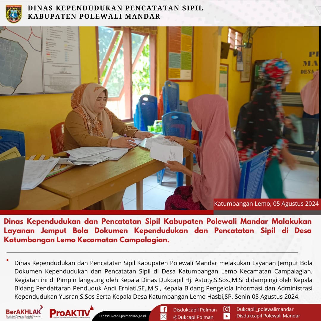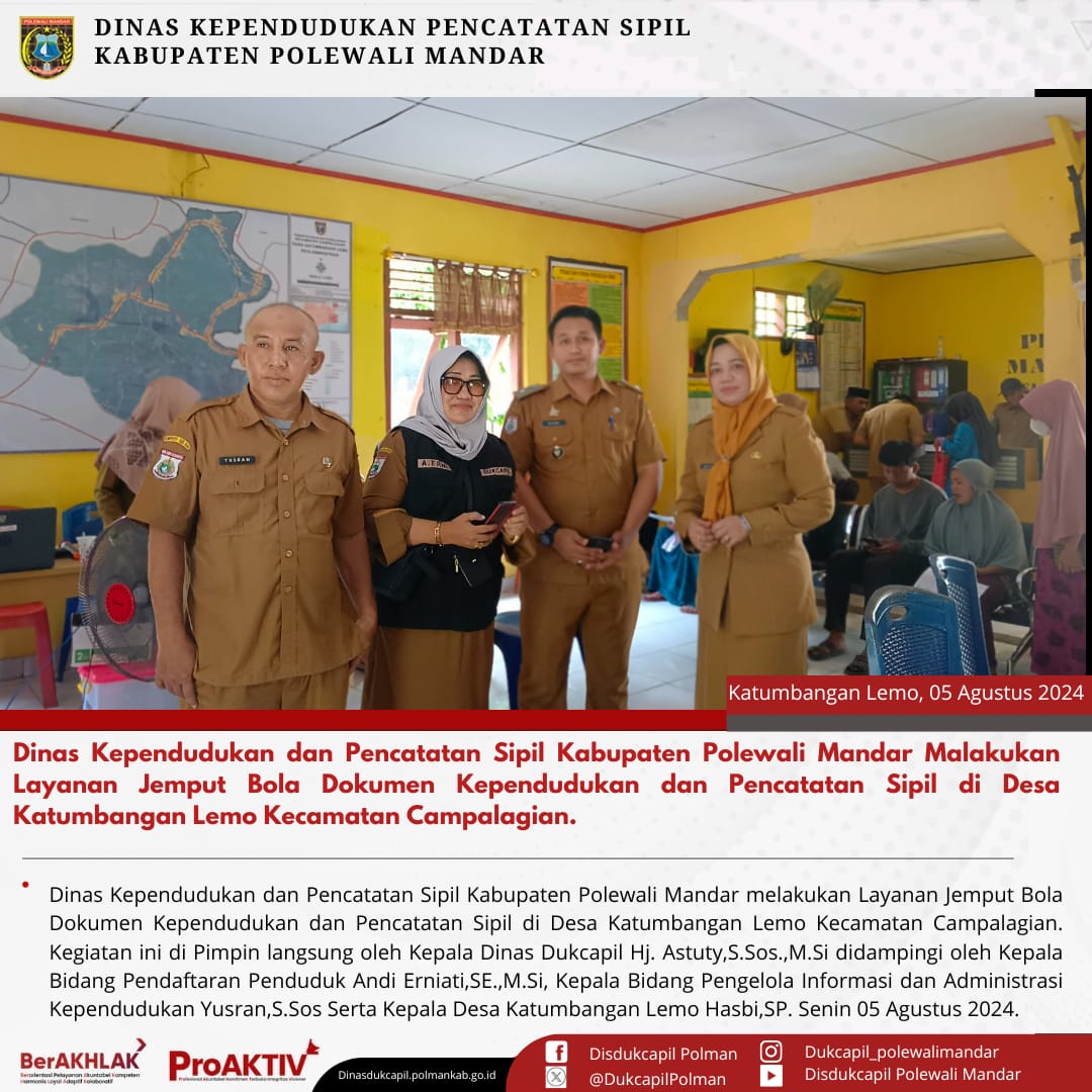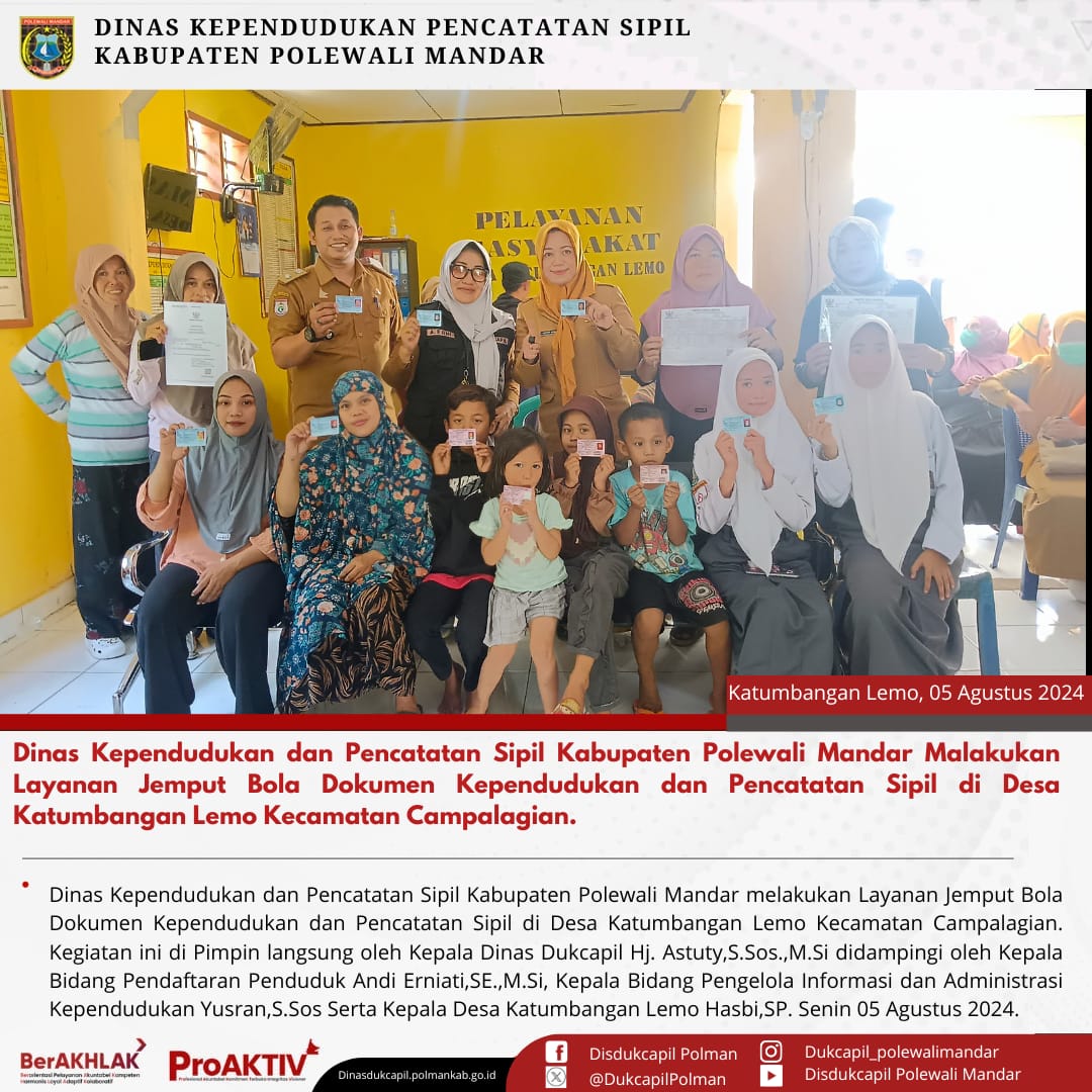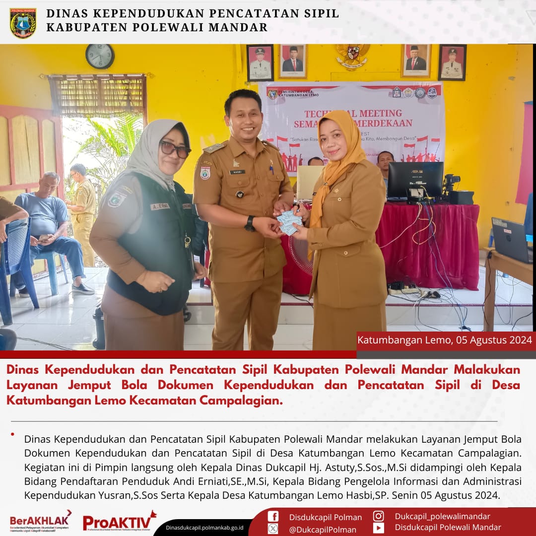 Senin, 05 Agustus 2024, Dinas Kependudukan dan Pencatatan Sipil Kabupaten Polewali Mandar melakukan layanan jemput bola Dokumen Kependudukan dan Pencatatan Sipil di Desa Katumbangan Lemo Kecamatan Campalagian.