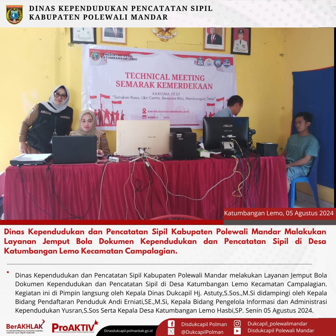 Kegiatan ini di Pimpin langsung oleh Kepala Dinas Dukcapil Hj, Astuty,S.Sos.,M.Si Didampingi Kepala Bidang Pelayanan Pendaftaran Penduduk Andi Erniati,SE.,M.Si, Kepala bidang Pengolaan Informasi dan Administrasi Kependudukan Yusran,S.Sos, dan Kepala Desa Katumbangan Lemo Hasbi,SP. Adapun pengurusan dokumen kependudukan yaitu Identitas Kependudukan Digital (IKD), Kartu Keluarga, Ktp El, Perekaman Ktp El, Kartu Identitas Anak (KIA), Akta Kelahiran, Akta Kematian dan Dokumen kependudukan lainnya.