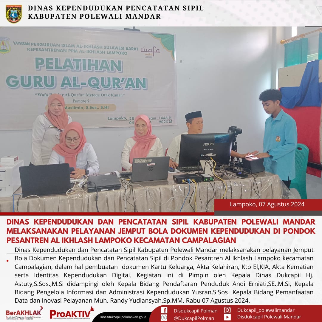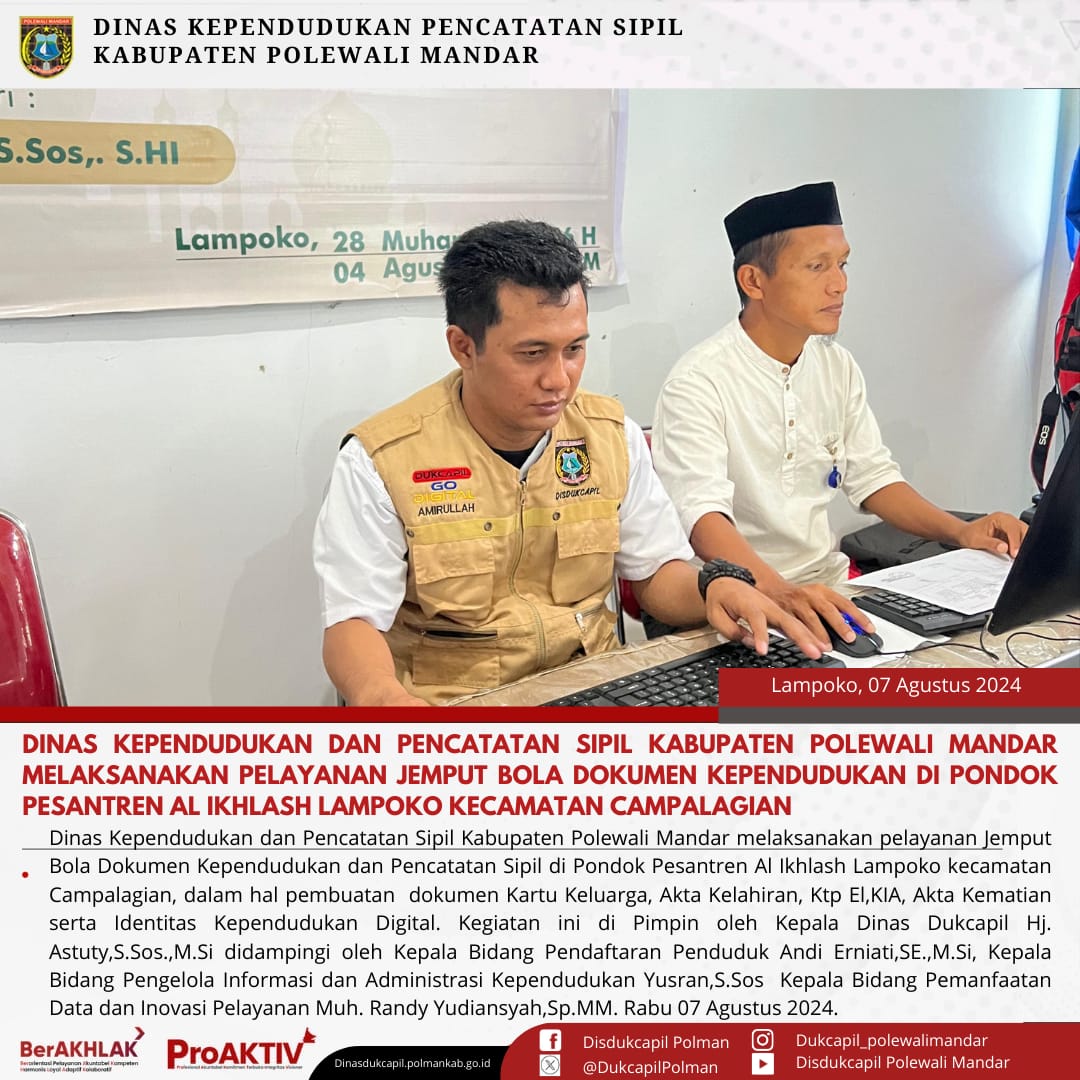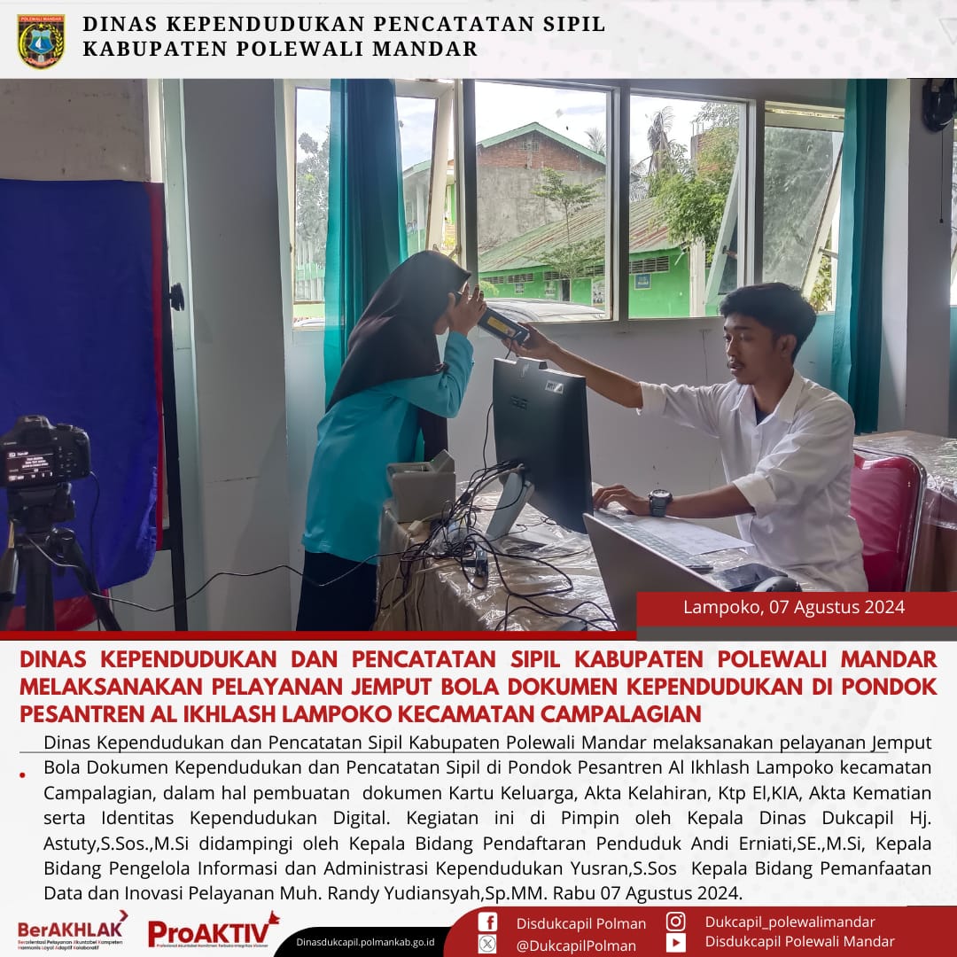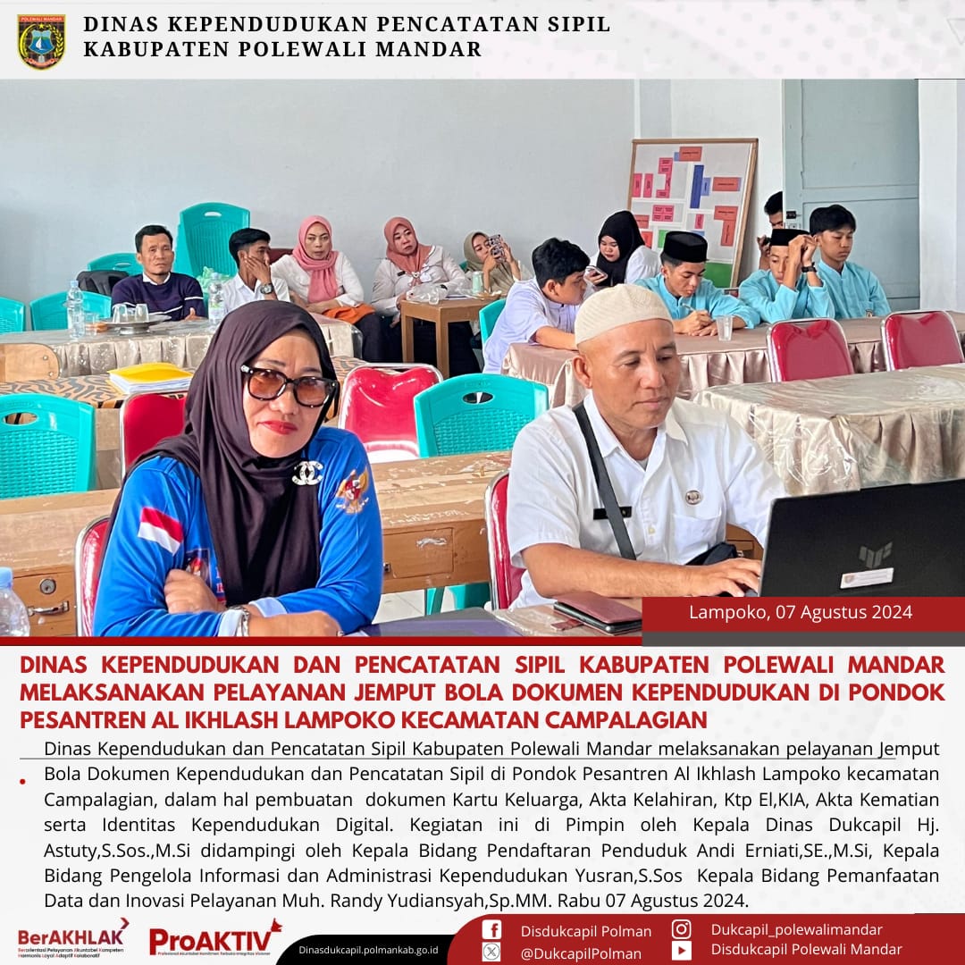 Lampoko, Rabu 07 Agustus 2024. Dinas Kependudukan dan Pencatatan Sipil Kabupaten Polewali Mandar melakukan Layanan Jemput Bola Dokumen Kependudukan di Pondok Pesentren Al Ikhlash Lampoko Kecamatan Campalagian.