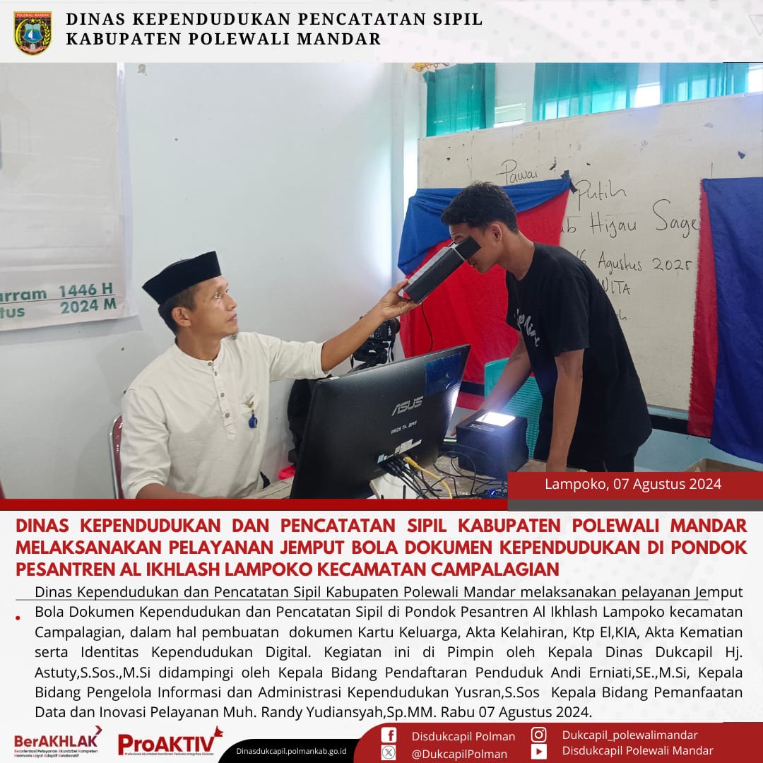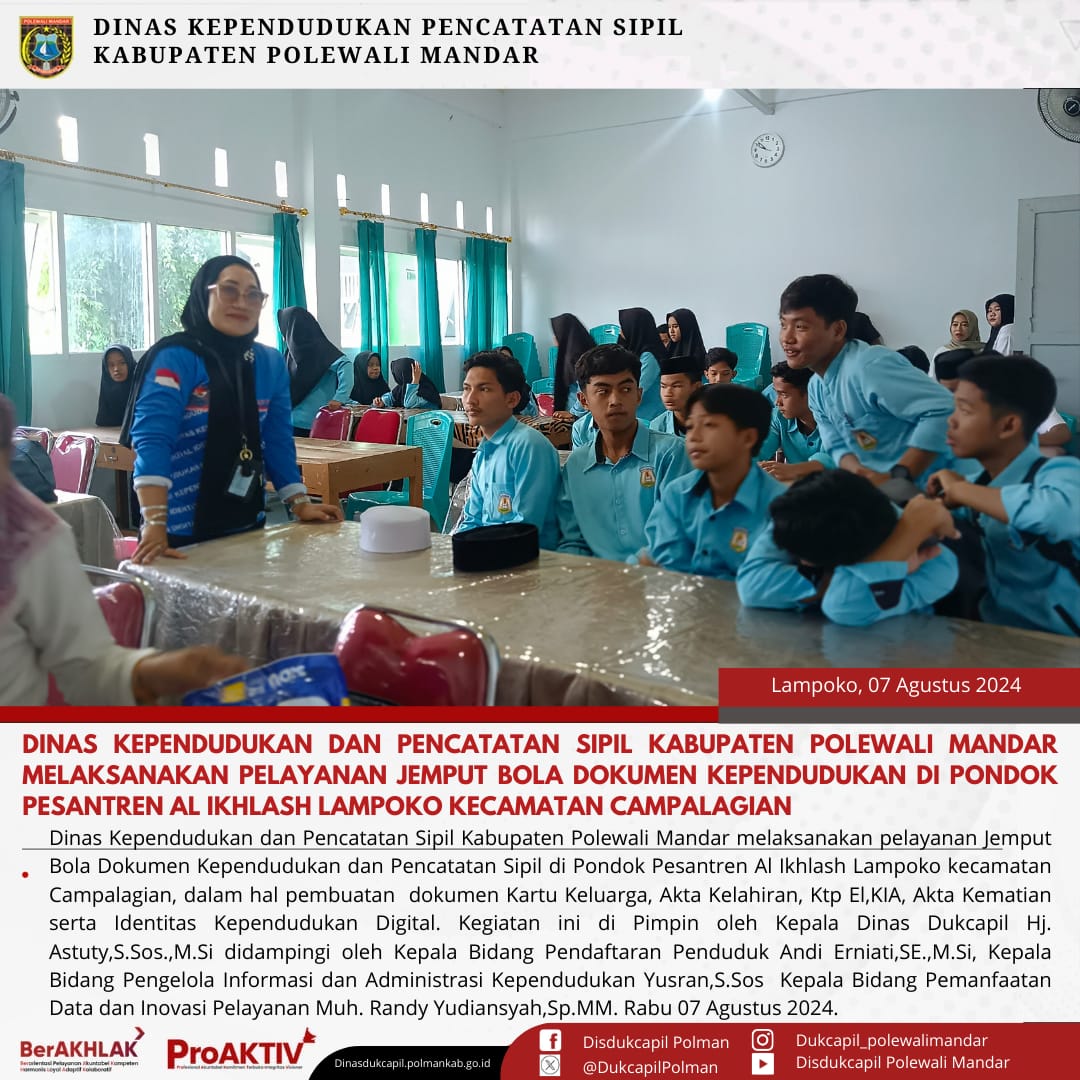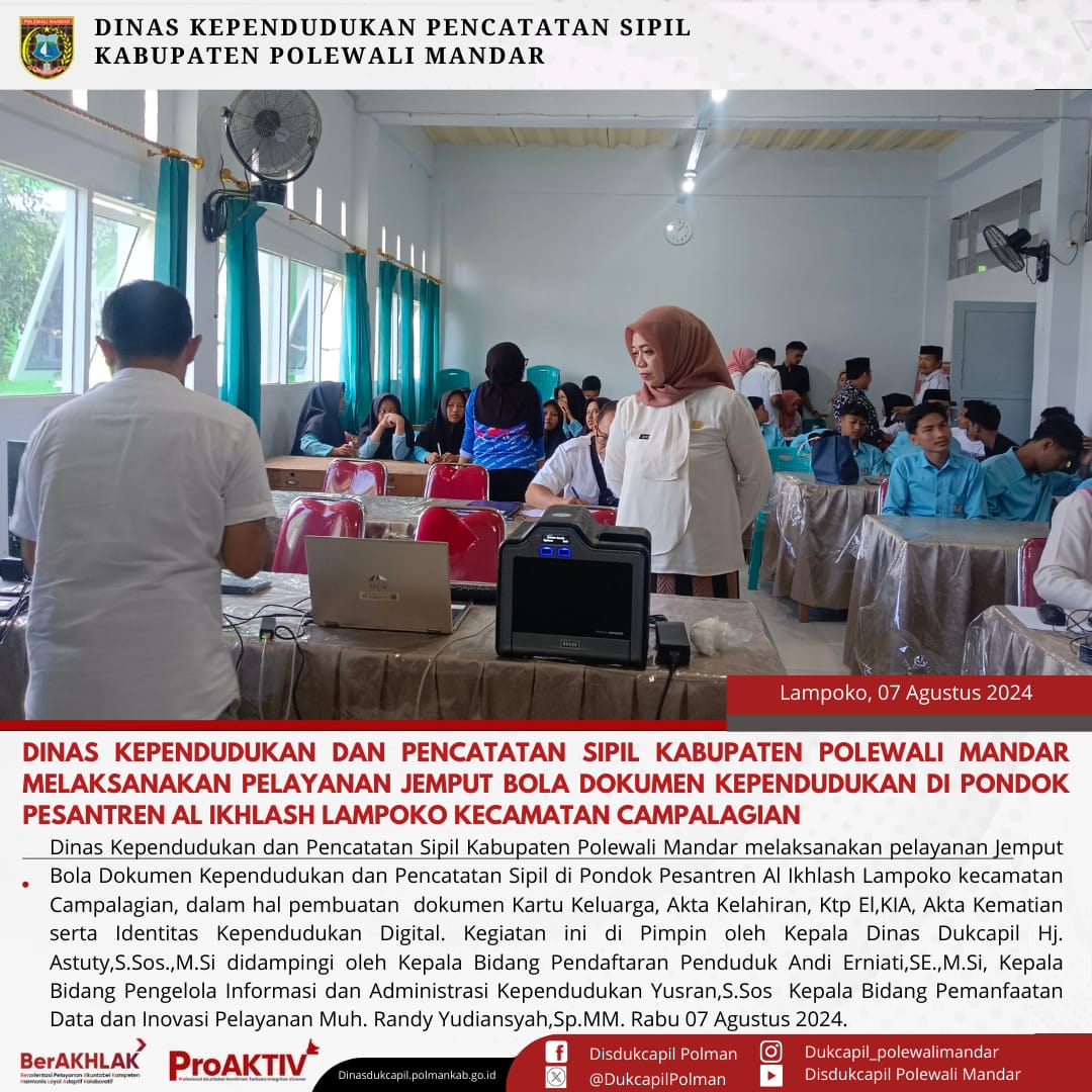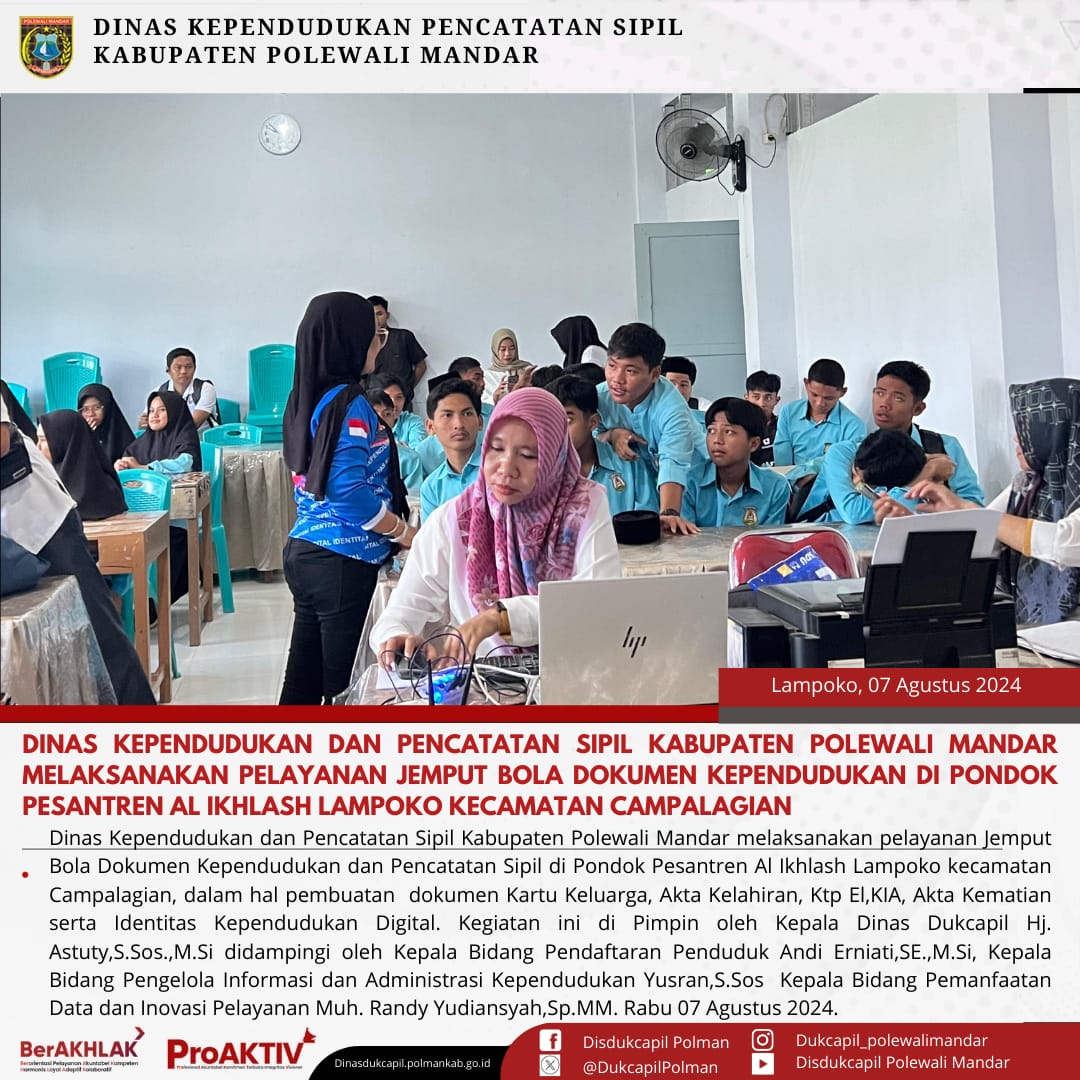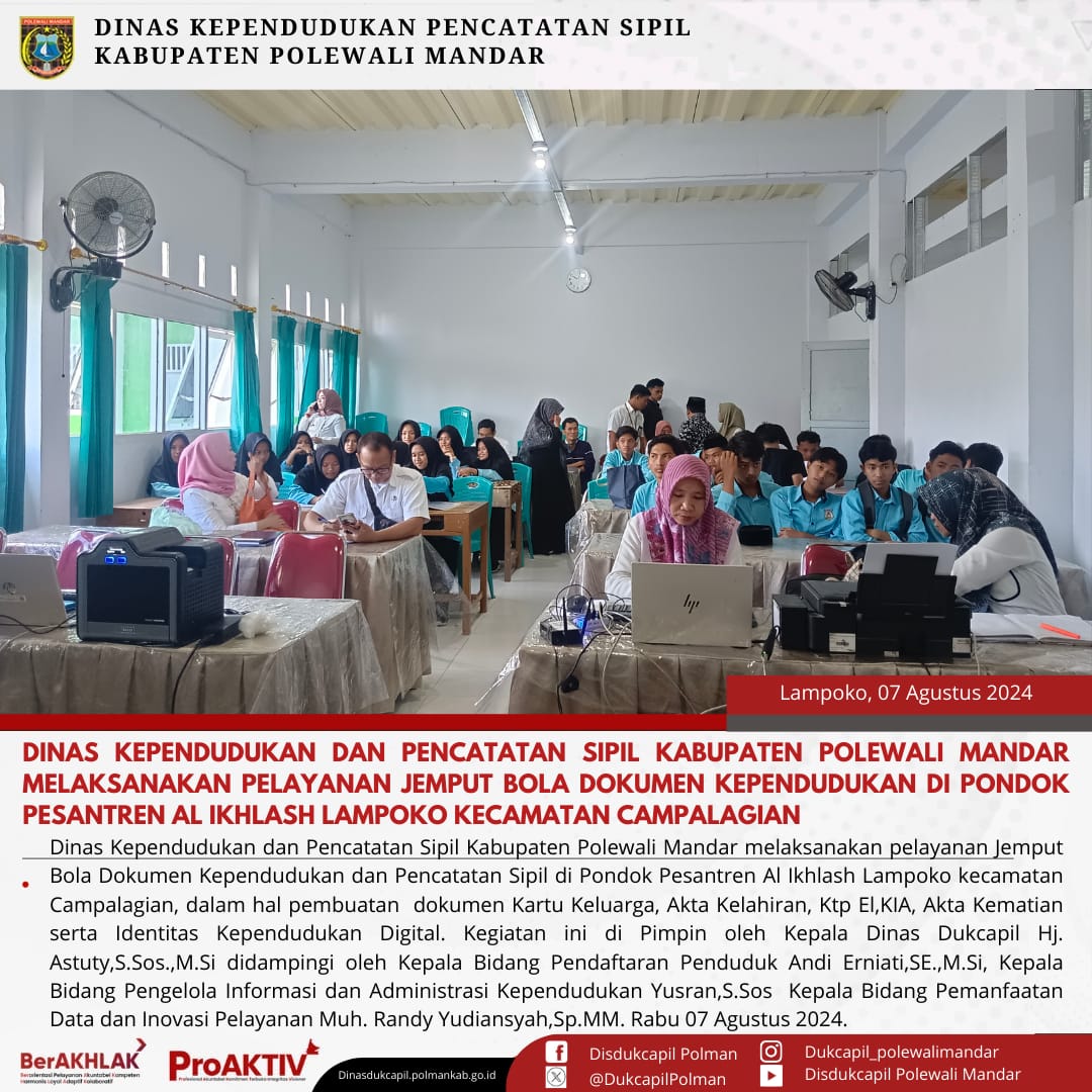 Lampoko, Rabu 07 Agustus 2024. Dinas Kependudukan dan Pencatatan Sipil Kabupaten Polewali Mandar melakukan Layanan Jemput Bola Dokumen Kependudukan di Pondok Pesentren Al Ikhlash Lampoko Kecamatan Campalagian.
