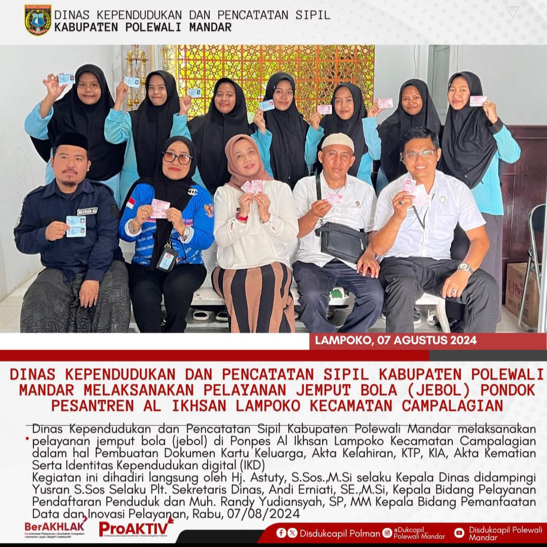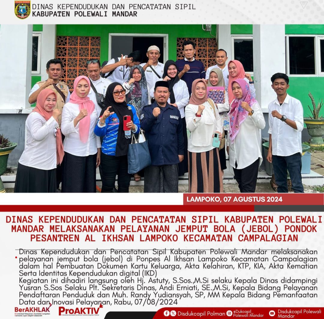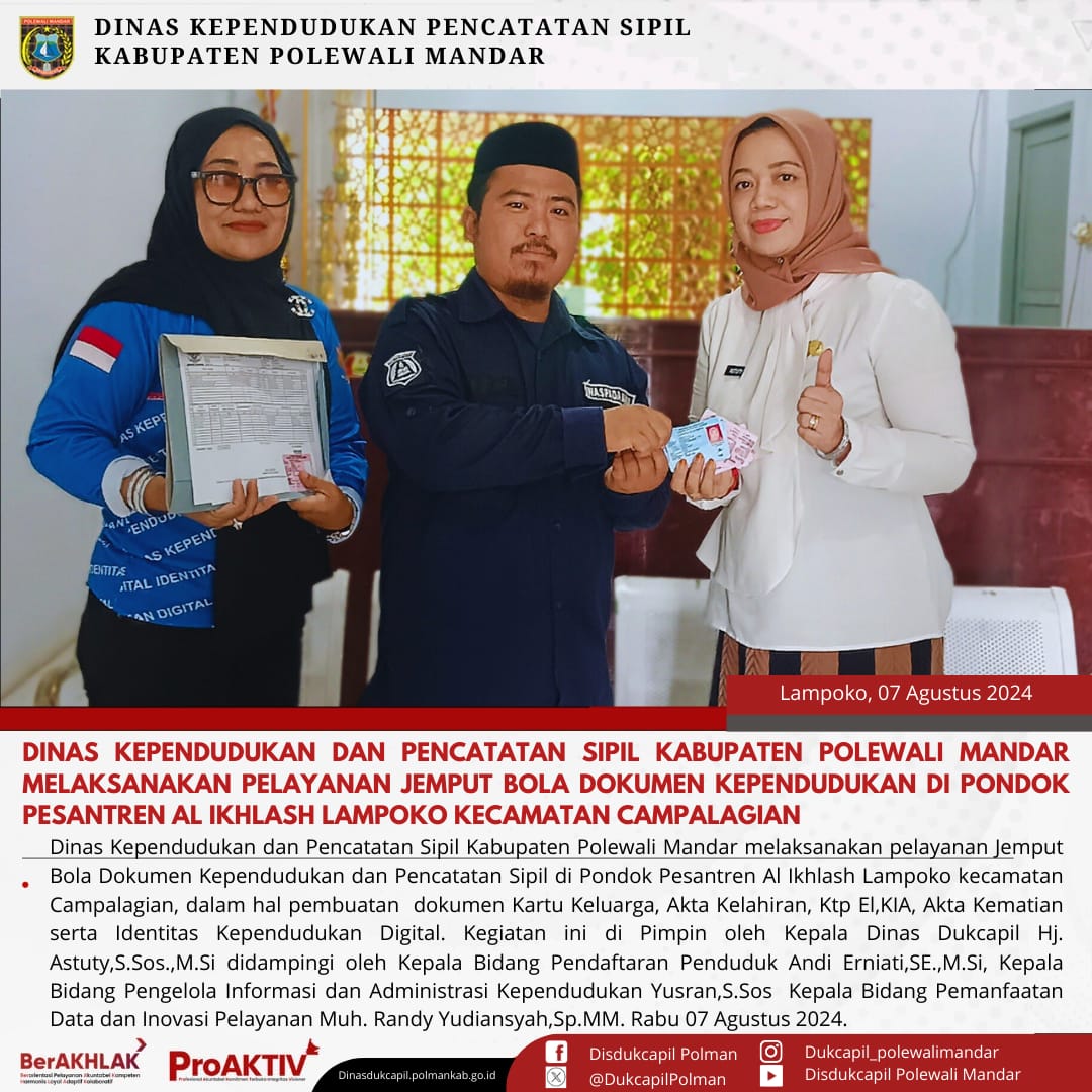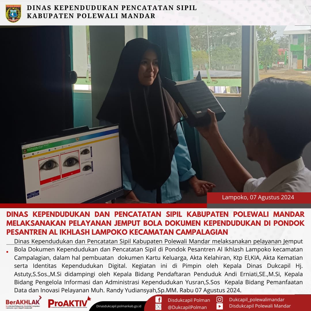 Lampoko, Rabu 07 Agustus 2024. Dinas Kependudukan dan Pencatatan Sipil Kabupaten Polewali Mandar melakukan Layanan Jemput Bola Dokumen Kependudukan di Pondok Pesentren Al Ikhlash Lampoko Kecamatan Campalagian.