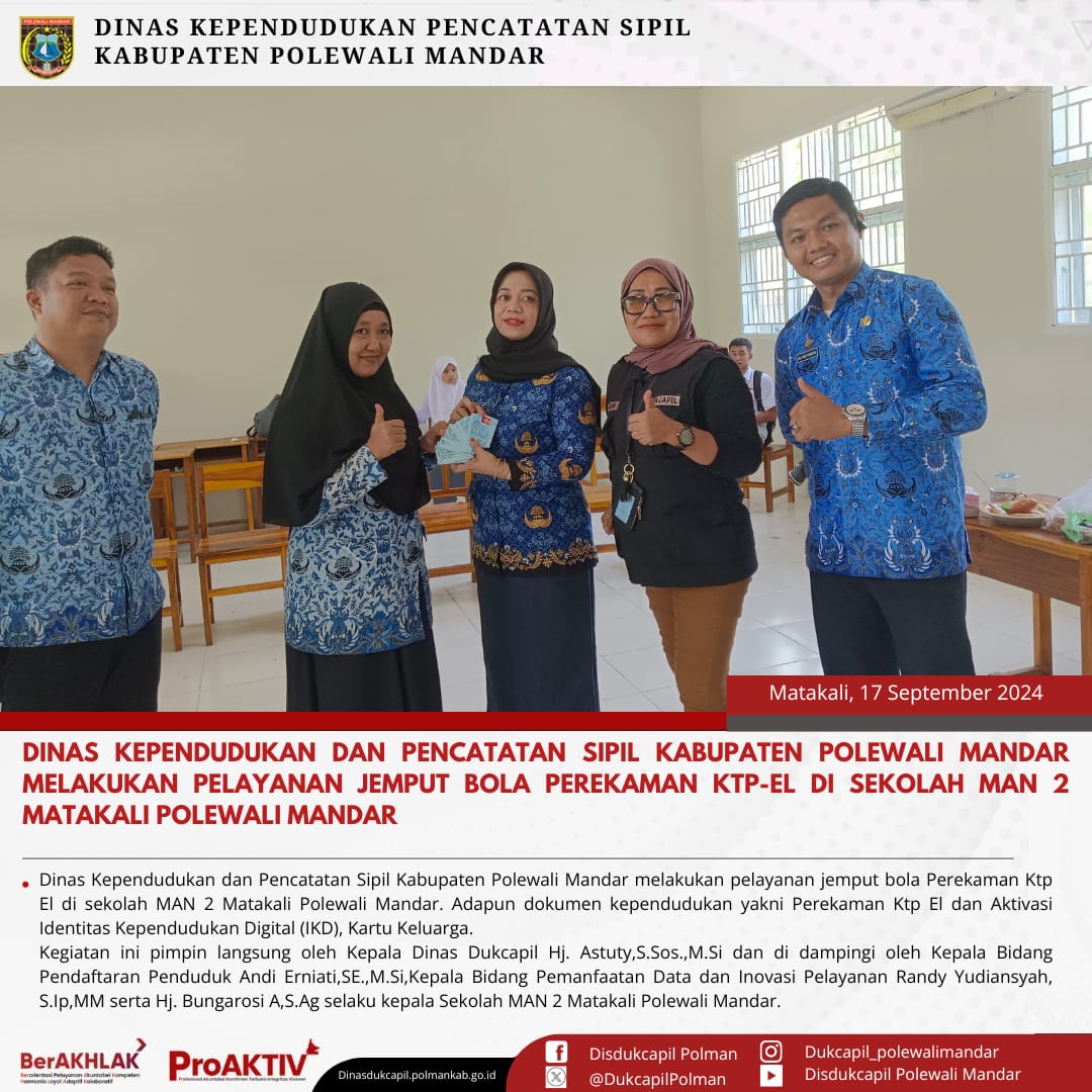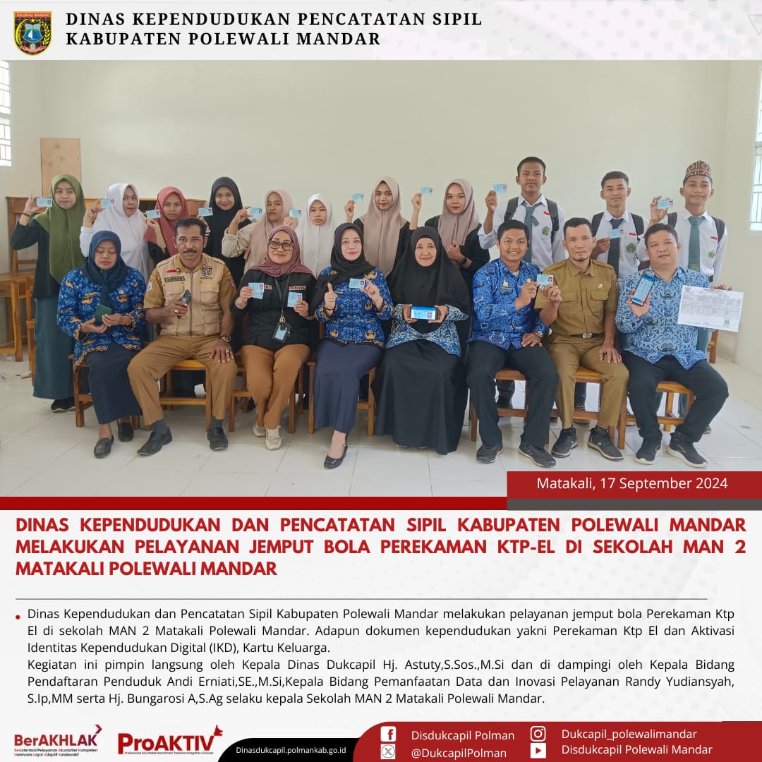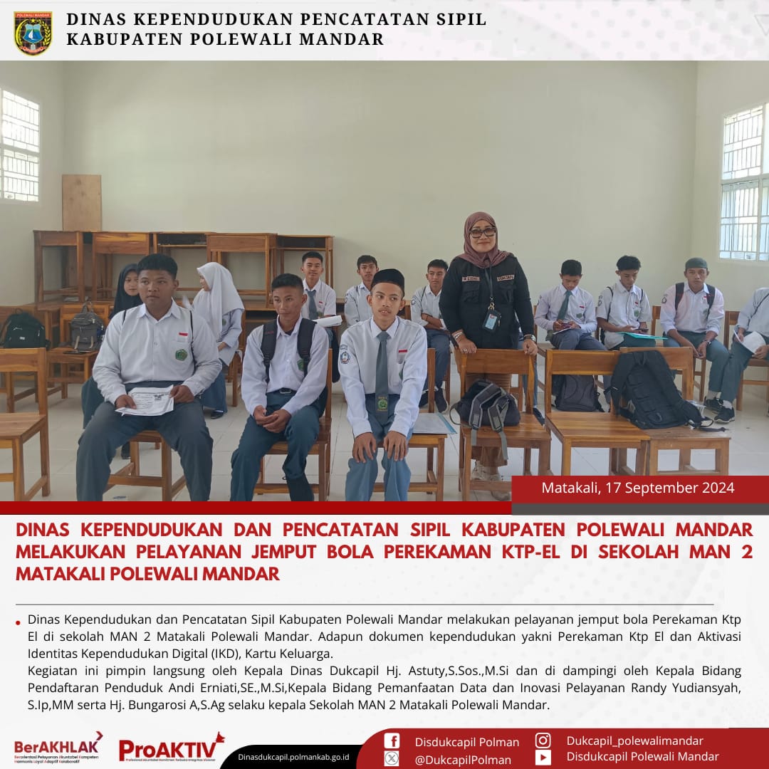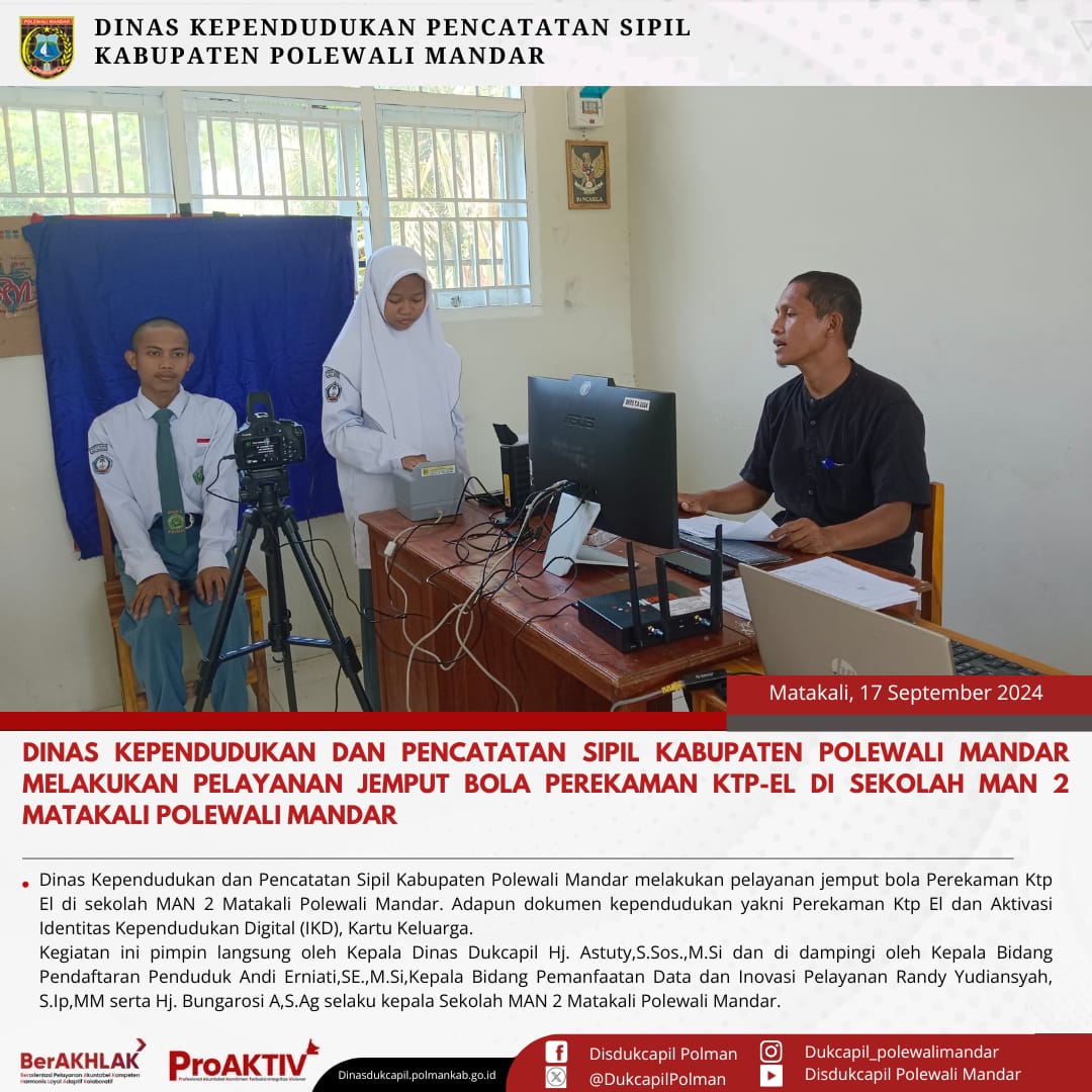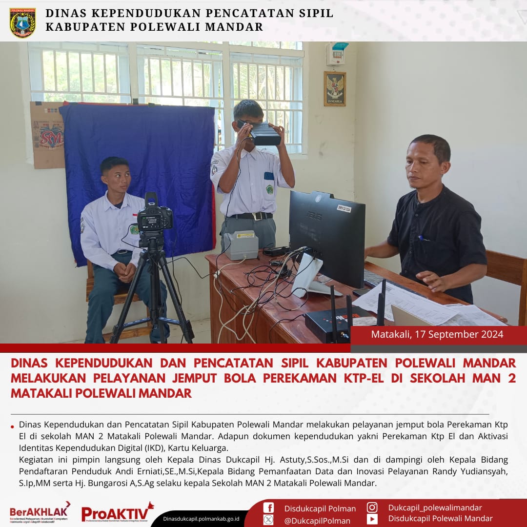 Matakali,17 September 2024. Dinas Kependudukan dan Pencatatan Sipil Kabupaten Polewali Mandar melakukan Layanan Perekaman Ktp El dan Aktivasi Identitas Kependudukan Digital (IKD) di Sekolah MAN 2 Matakali Polewali Mandar.