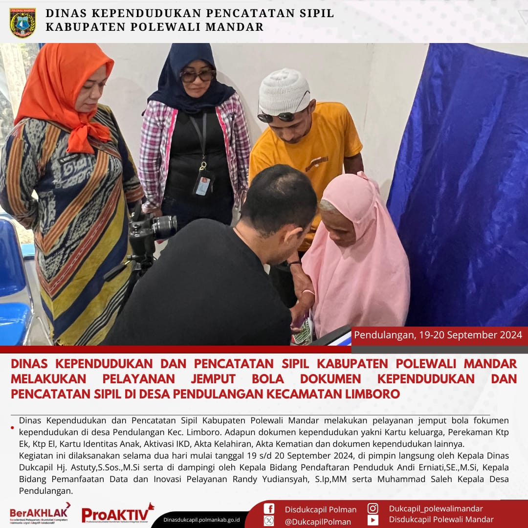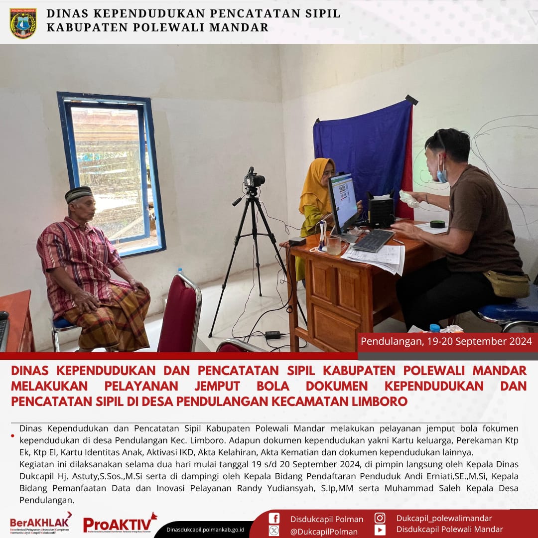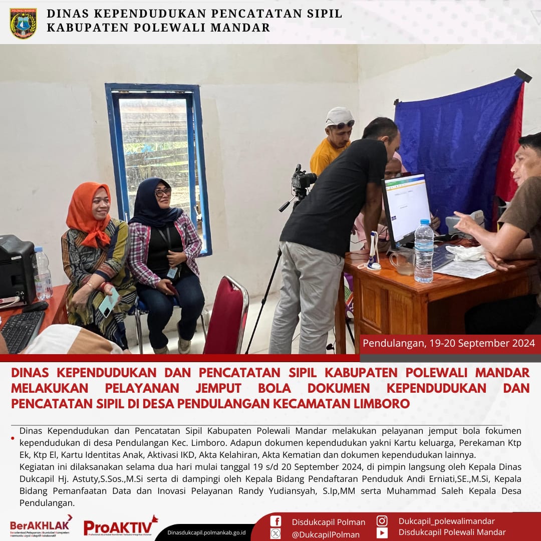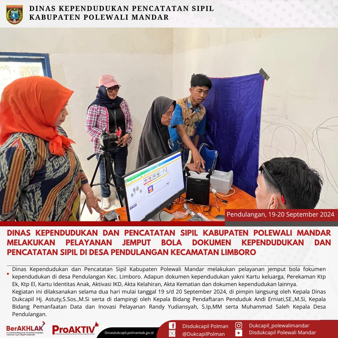 Kamis, 19 September 2024. Dinas Kependudukan dan Pencatatan Sipil Kabupaten Polewali Mandar melakukan layanan Jemput Bola Dokumen Kependudukan dan Pencatatan Sipil di Desa Pendulangan Kecamatan Limboro.