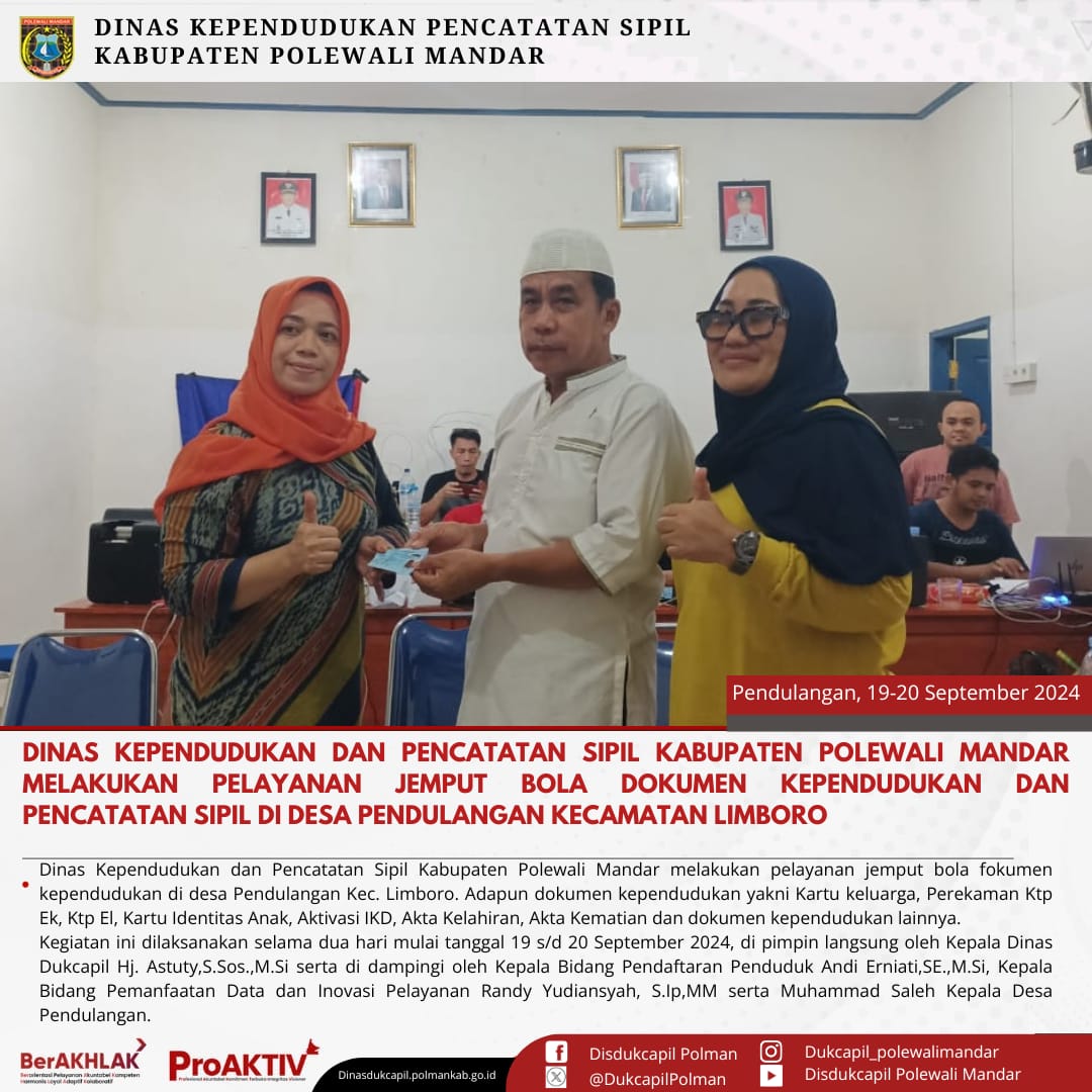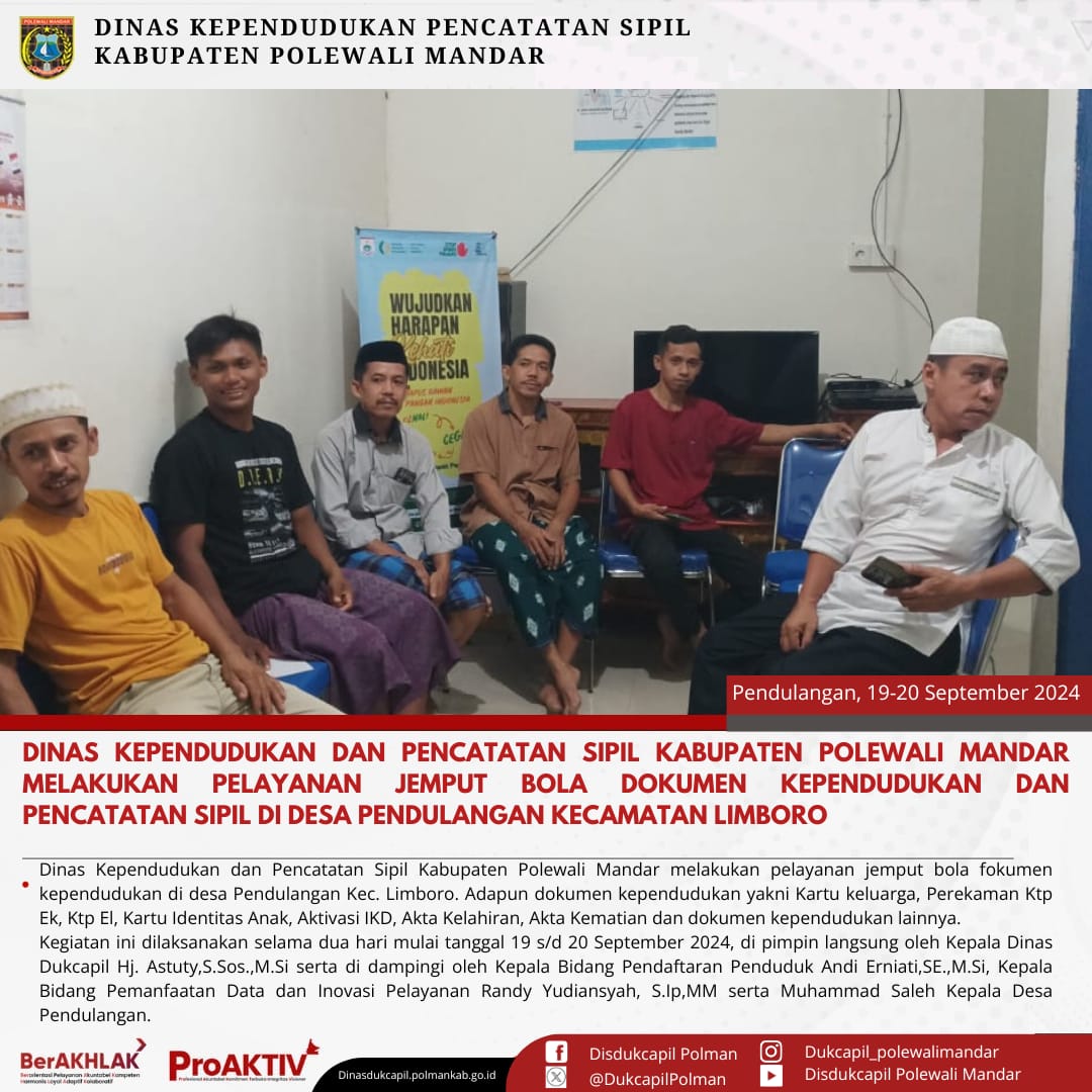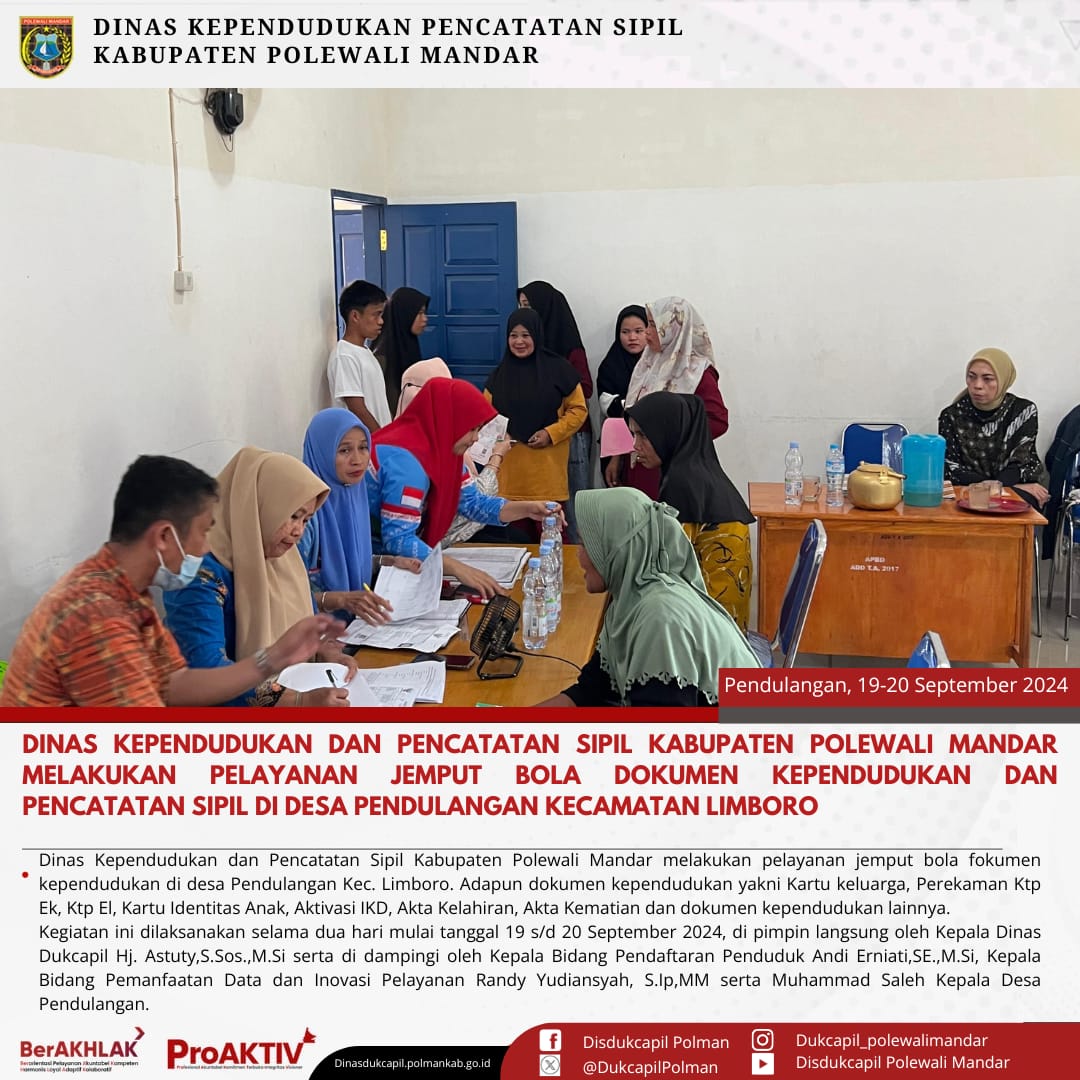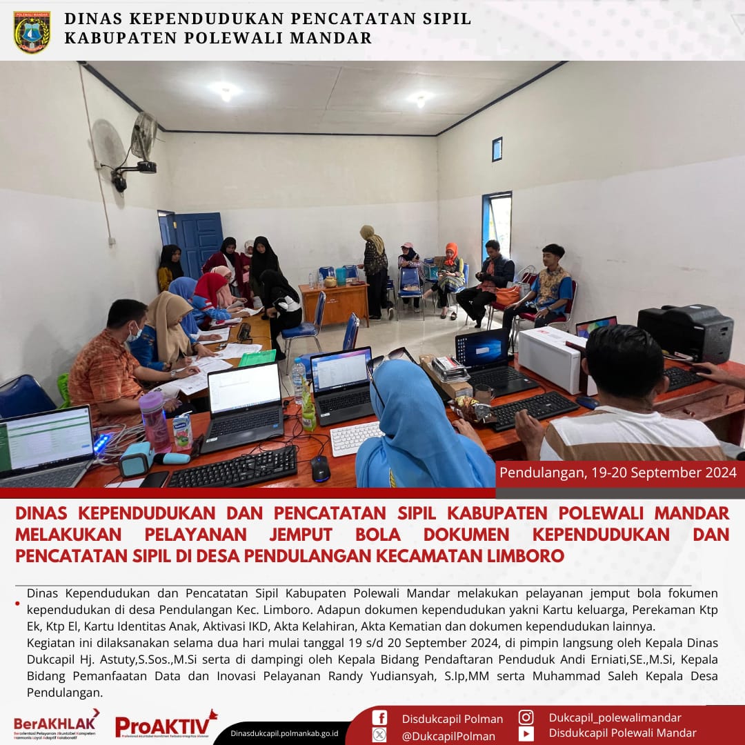Kamis, 19 September 2024. Dinas Kependudukan dan Pencatatan Sipil Kabupaten Polewali Mandar melakukan layanan Jemput Bola Dokumen Kependudukan dan Pencatatan Sipil di Desa Pendulangan Kecamatan Limboro.