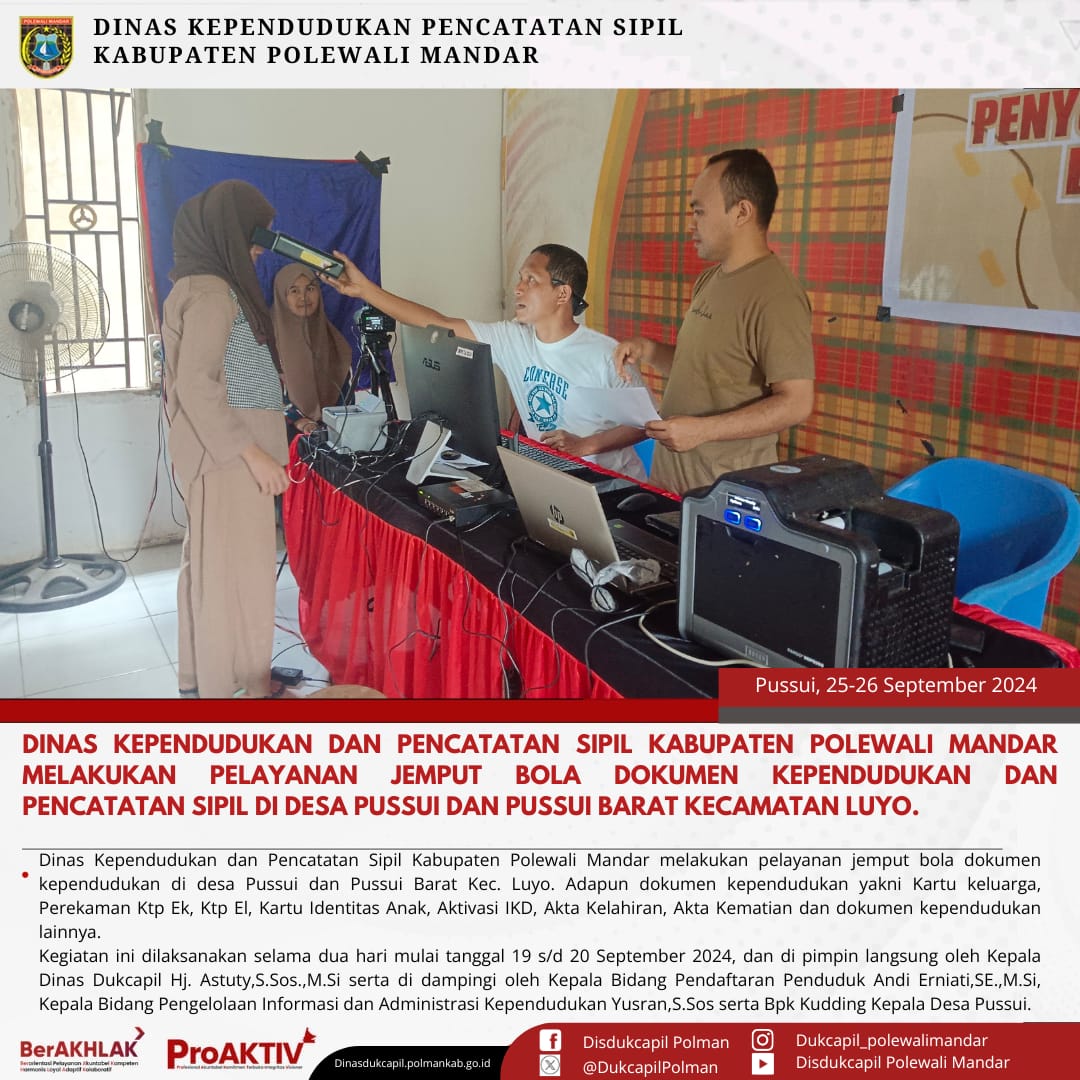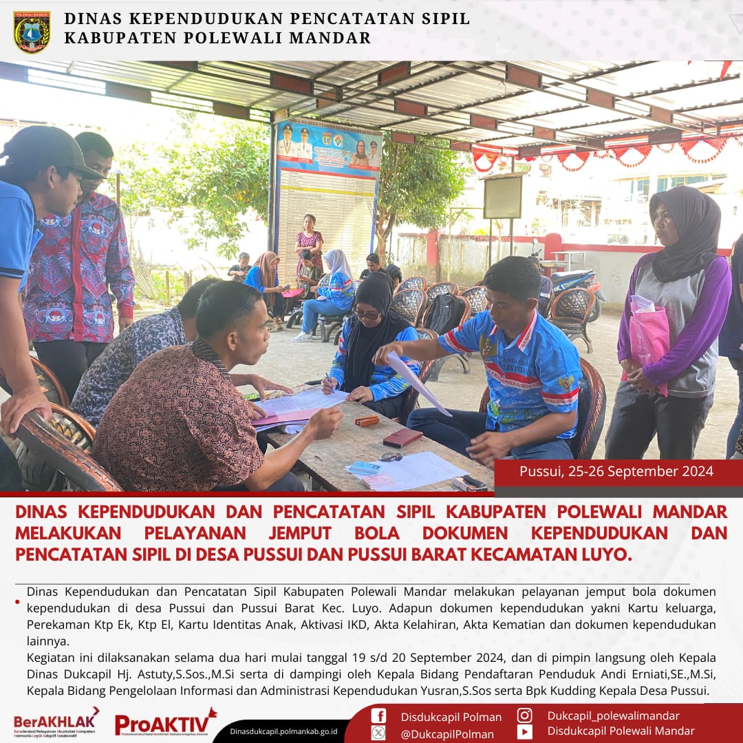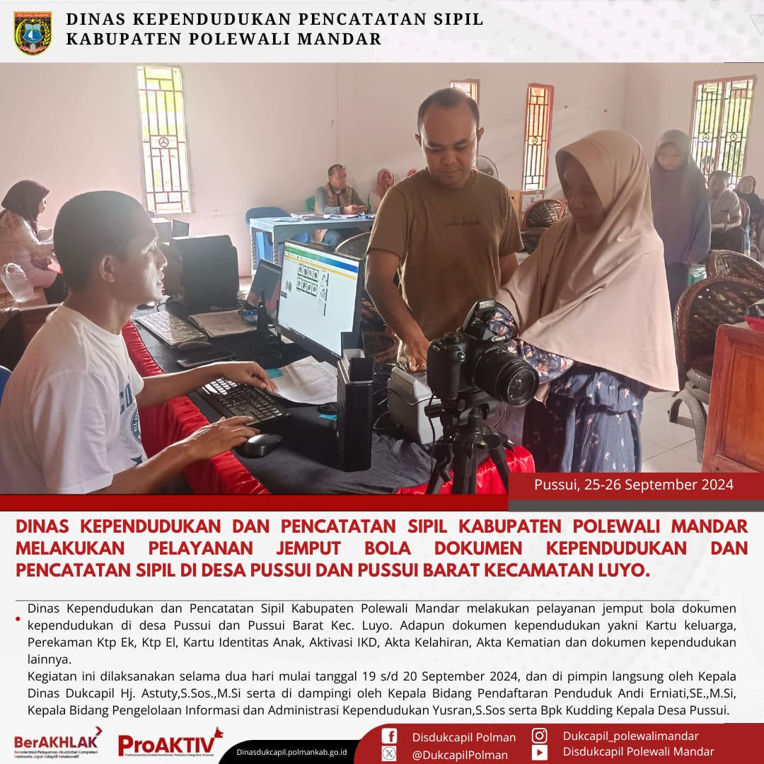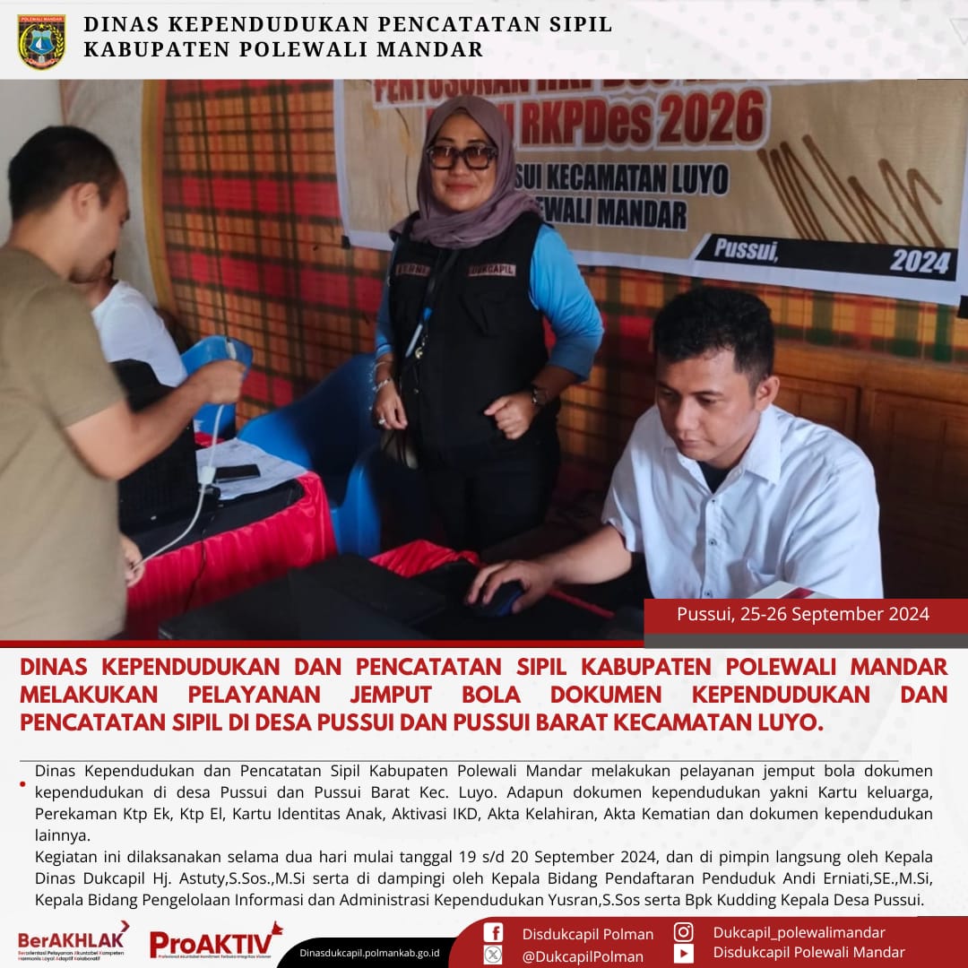 Kamis, 25 September 2024. Dinas Kependudukan dan Pencatatan Sipil Kabupaten Polewali Mandar melakukan layanan Jemput Bola Dokumen Kependudukan dan Pencatatan Sipil di Desa Pussui Kecamatan Luyo. Adapun Dokumen Kependudukan dan Pencatatan Sipil yaitu Kartu Keluarga,Perekaman Ktp El, Ktp EL, Pindah Penduduk, Kartu Identitas Anak (KIA), Aktivasi Identitas Kependudukan Digital (IKD), Akta Kelahiran, Akta Kematian dan Dokumen lainnya.
