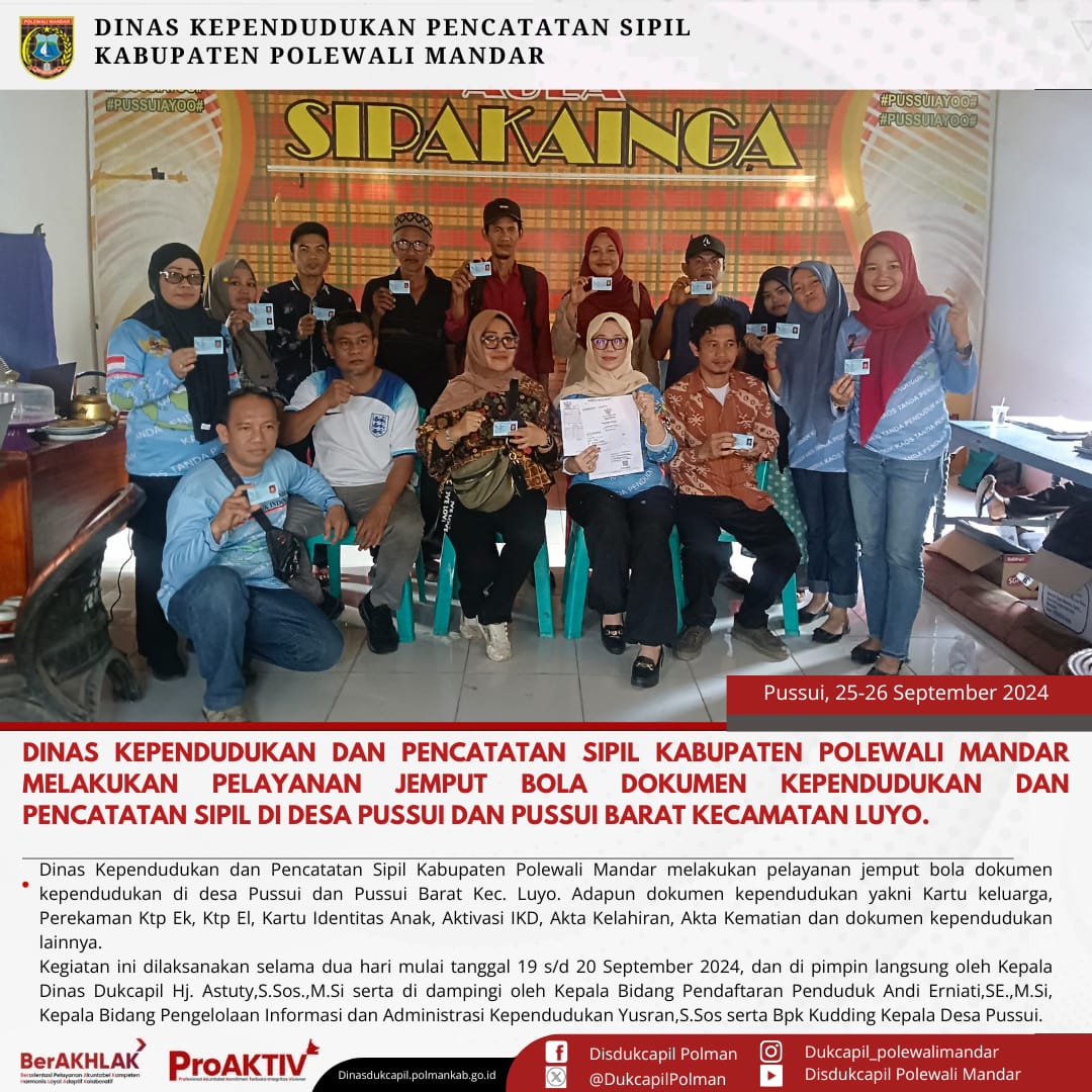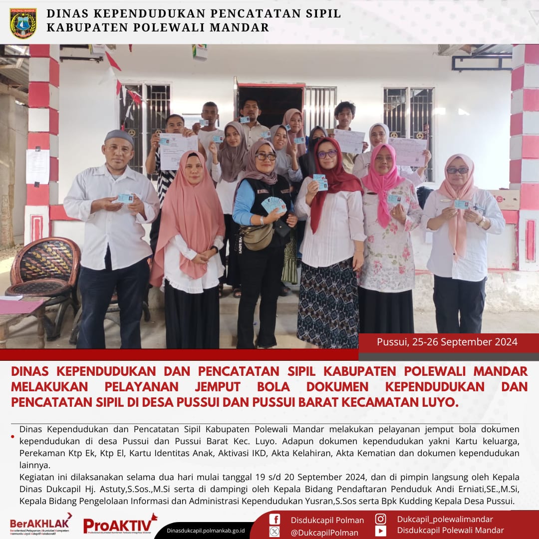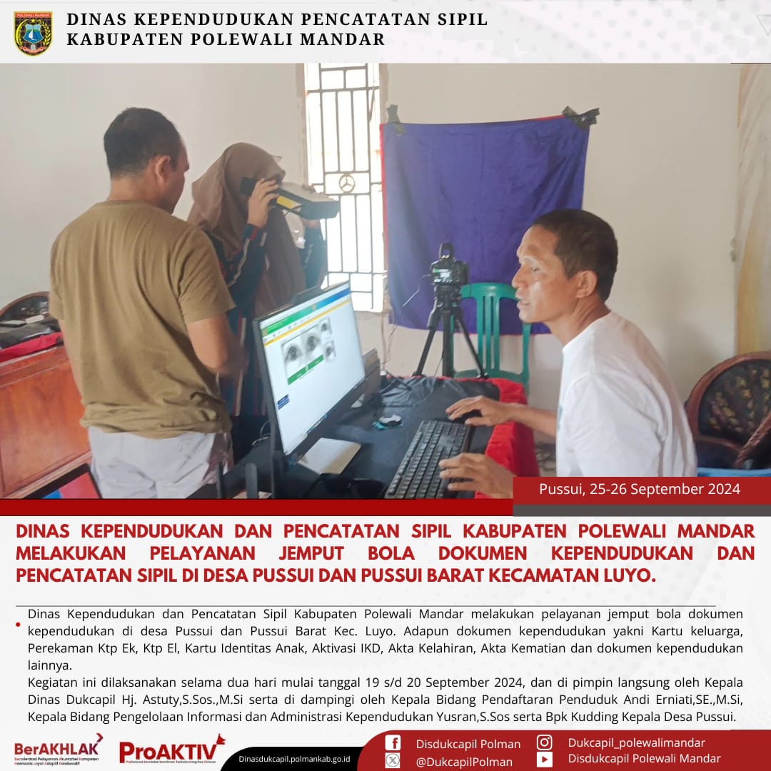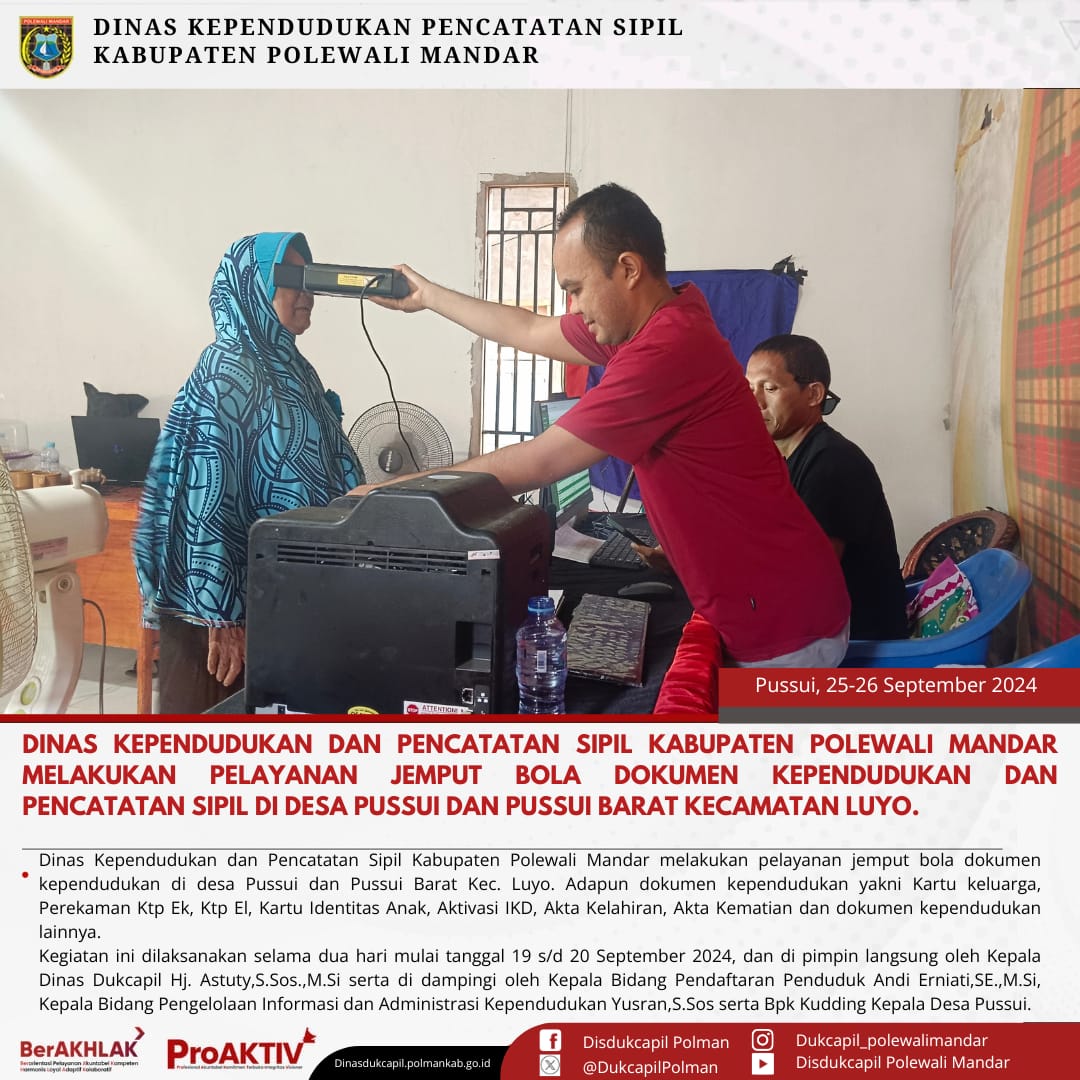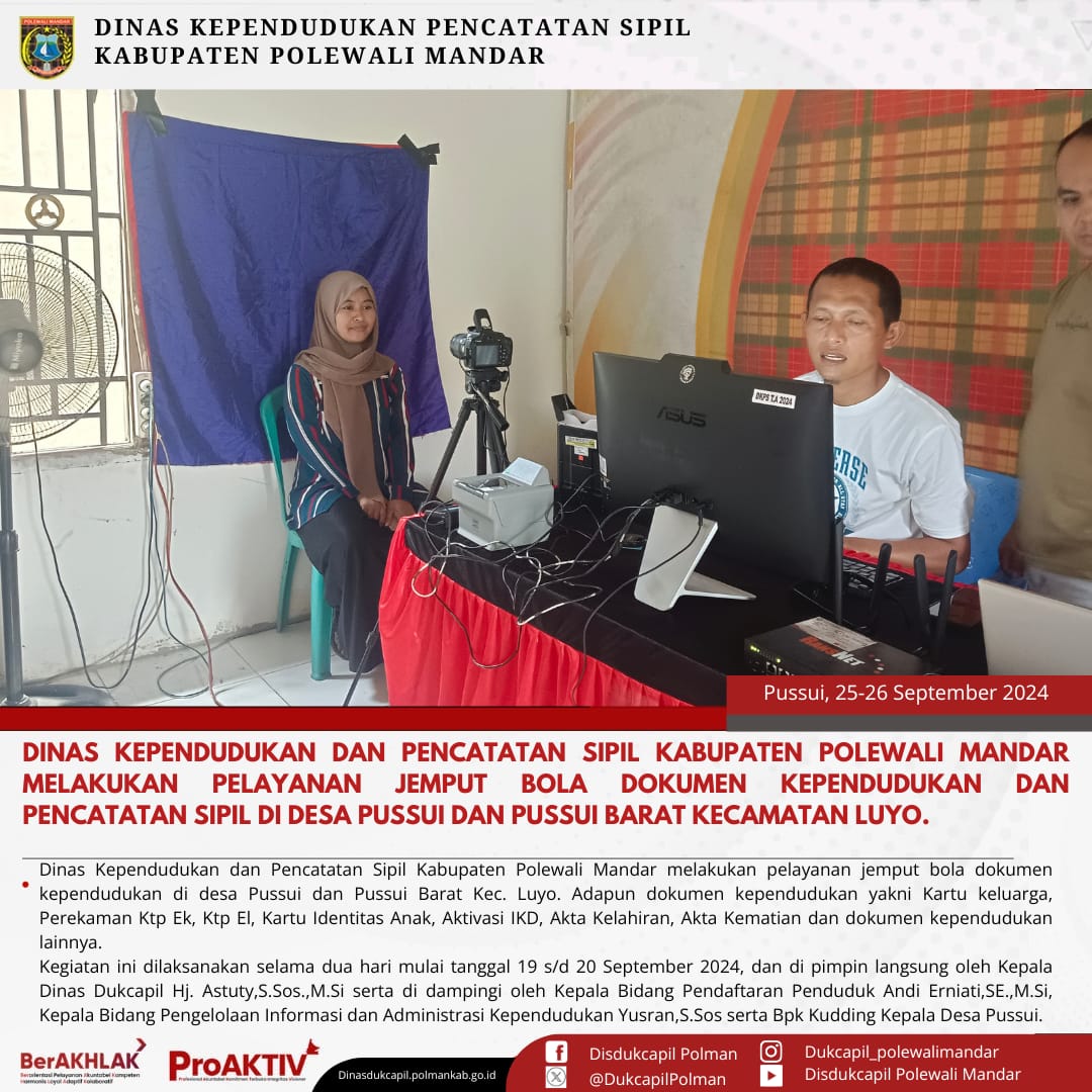 Kamis, 25 September 2024. Dinas Kependudukan dan Pencatatan Sipil Kabupaten Polewali Mandar melakukan layanan Jemput Bola Dokumen Kependudukan dan Pencatatan Sipil di Desa Pussui Kecamatan Luyo. Adapun Dokumen Kependudukan dan Pencatatan Sipil yaitu Kartu Keluarga,Perekaman Ktp El, Ktp EL, Pindah Penduduk, Kartu Identitas Anak (KIA), Aktivasi Identitas Kependudukan Digital (IKD), Akta Kelahiran, Akta Kematian dan Dokumen lainnya.