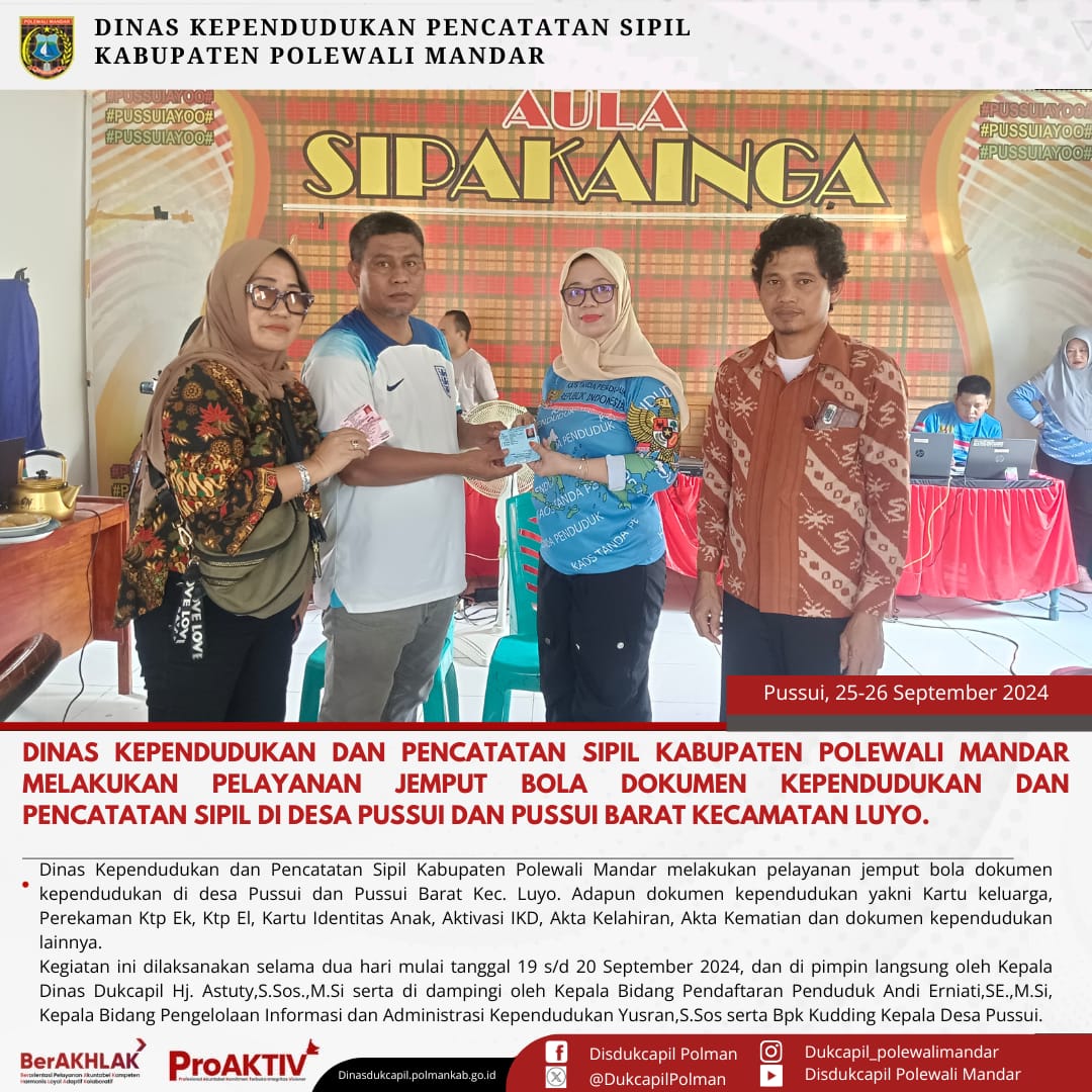 Pelayanan Jemput Bola dilakukan didua Desa Yakni Desa Pussui dan Pussui Barat kselama dua hari, mulai hari Rabu s/d Kamis tanggal 25 s/d 26 September 2024 di desa Pussui Kecamatan Luyo. Kegiatan ini dipusatkan di Kantor Desa Pussui dan di Pimpin langsung oleh Kepala Dinas Dukcapil Hj. Astuty, S.Sos.,M.Si serta di idampingi oleh Andi Erniati,SE.,M.Si selaku Kepala Bidang Pelayanan Pendaftaran Penduduk, Yusran,S.Sos Selaku Kepala Bidang Pengelolaan Informasi dan Administrasi Kependudukan serta Bpk. Kudding selaku kepala Desa Pussui. Kepala Dinas Dukcapil Hj, Astuty, S.Sos,M.Si menyerahkan langsung Dokumen Kependudukan yang sudah jadi kepada Bpk. Kudding selaku kepala Desa Pussui.